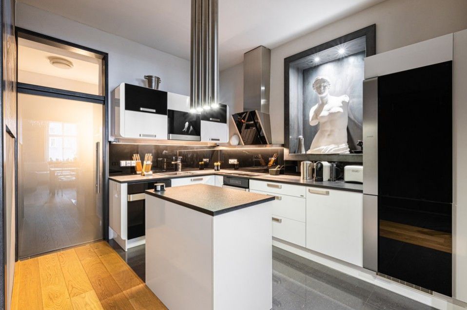 Complete equipment includes: wooden floors and tiles, underfloor heating in the bathroom, security door, fully equipped kitchen with all appliances, dishwasher, washing machine, tumble dryer, TV, intercom.