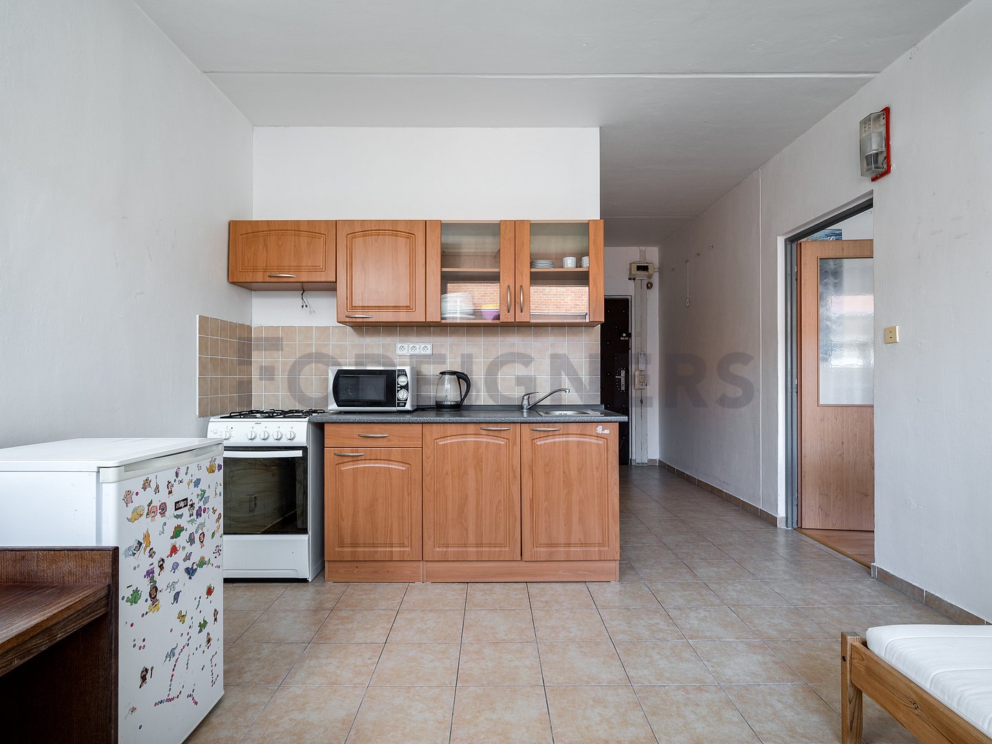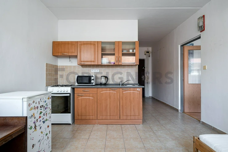 The layout of the apartment consists of an entrance hallway, from the hallway there is also an entrance to the bathroom with a shower, washing machine and toilet. On the right side of the front door is the kitchen with a kitchen unit, gas stove, oven and microwave. From the kitchen you enter a separate bedroom, which is equipped with a double bed and wardrobes.