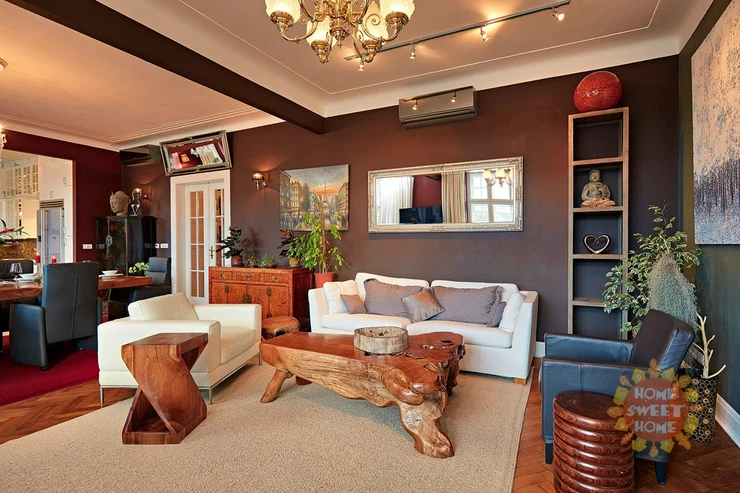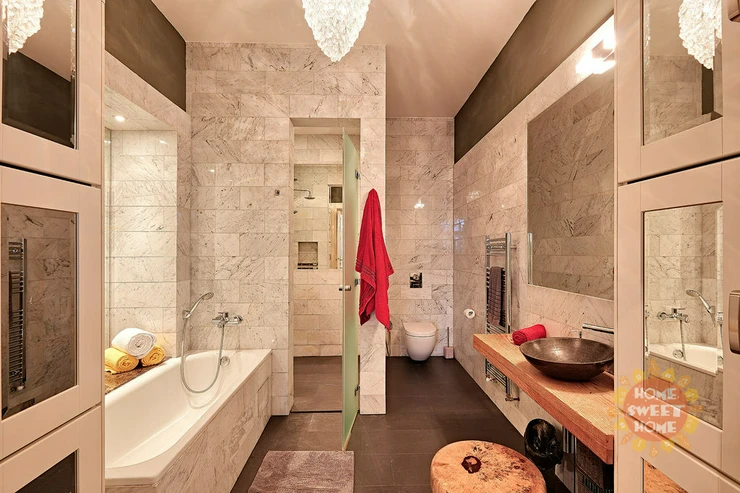 The elegant bathrooms are finished with marble, feature stone sinks, and are equipped with a bathtub and WC. The interiors are defined by high ceilings over 3 meters, large windows, and premium materials including marble, solid wood, and luxurious ceramics. Additional amenities include a security system, alarm, washer, dryer, TV, and CCTV.