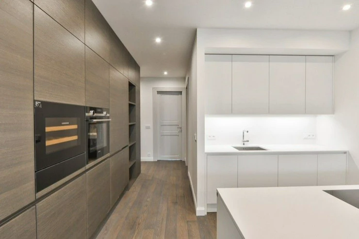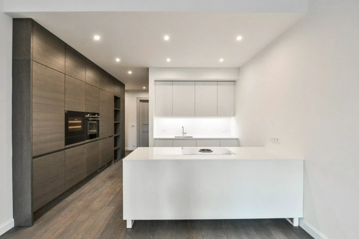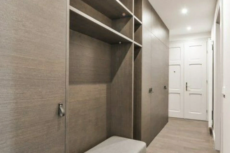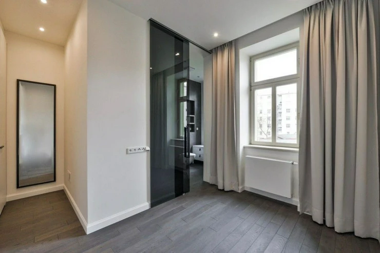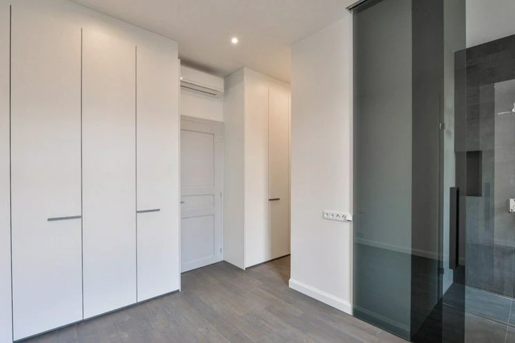 The interior of the apartment consists of an open living room with a fully equipped kitchen and dining area, a master bedroom with a spacious dressing room and a sun suite bathroom with a bathtub, a second bedroom with a dressing room, a bedroom oriented to a quiet landscaped courtyard, another bathroom with a shower corner, plenty of storage space, an entrance hall with wardrobes, utility room.