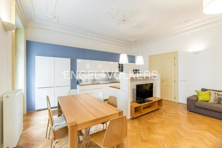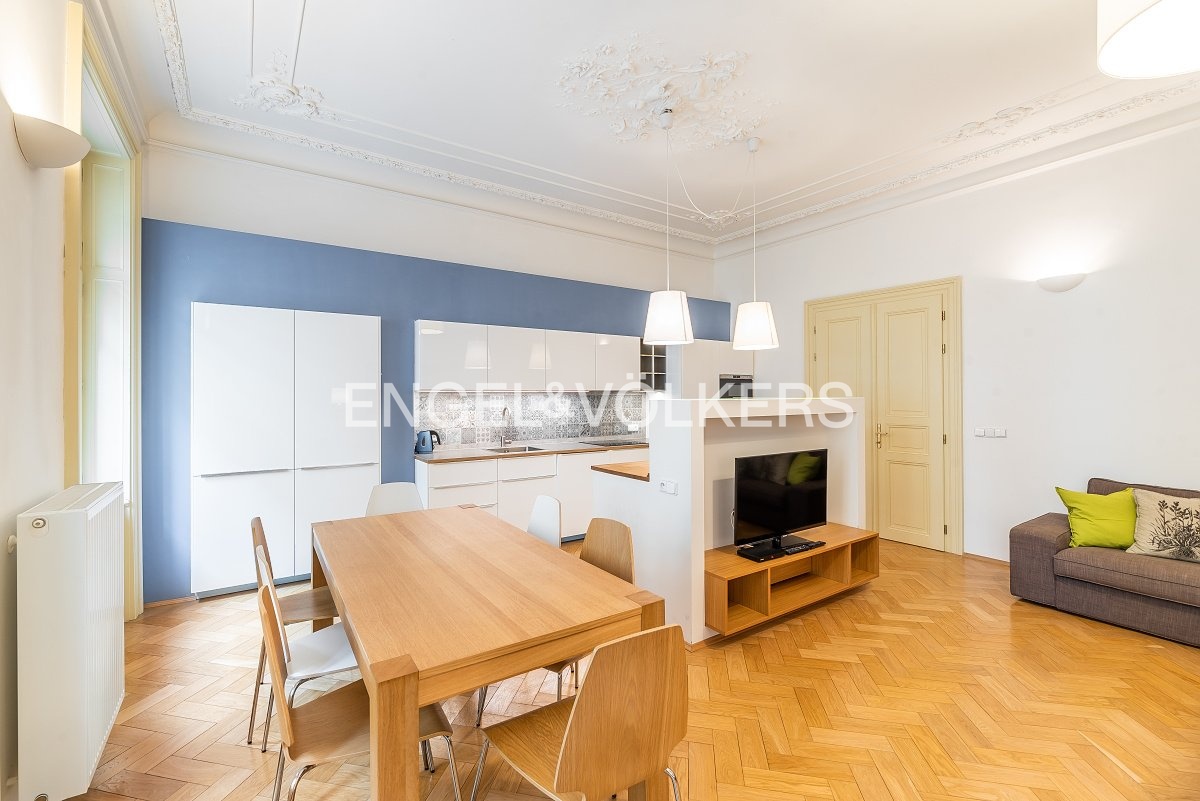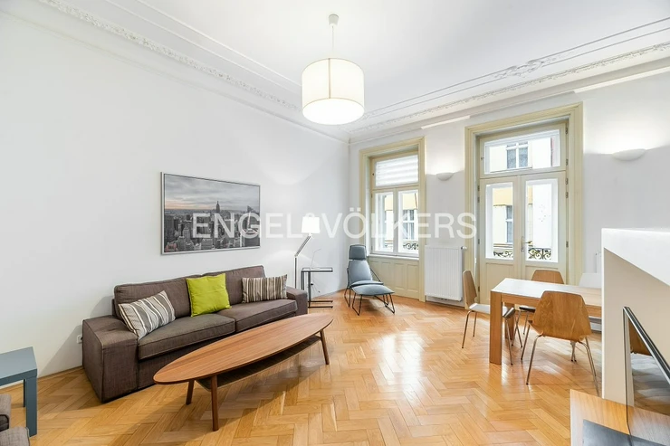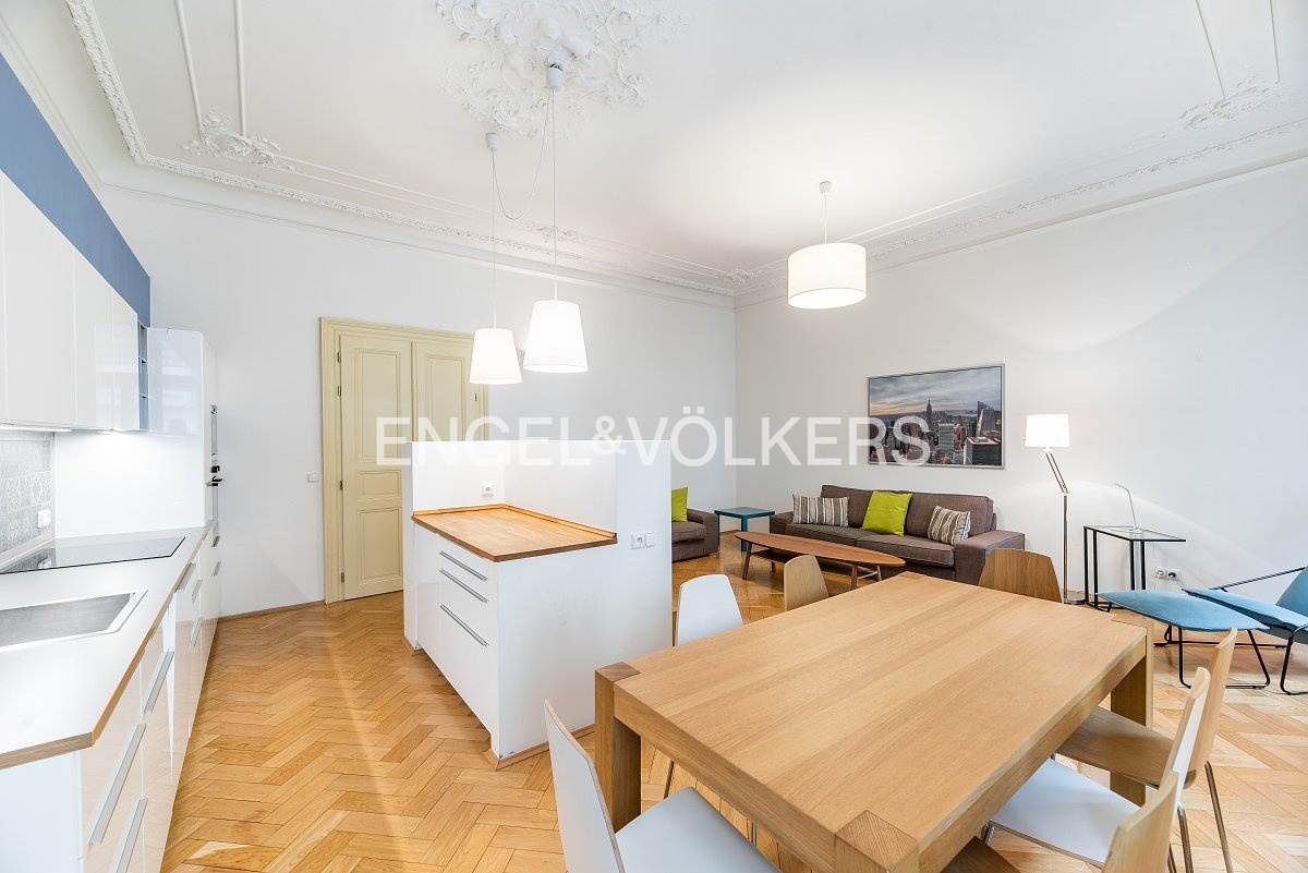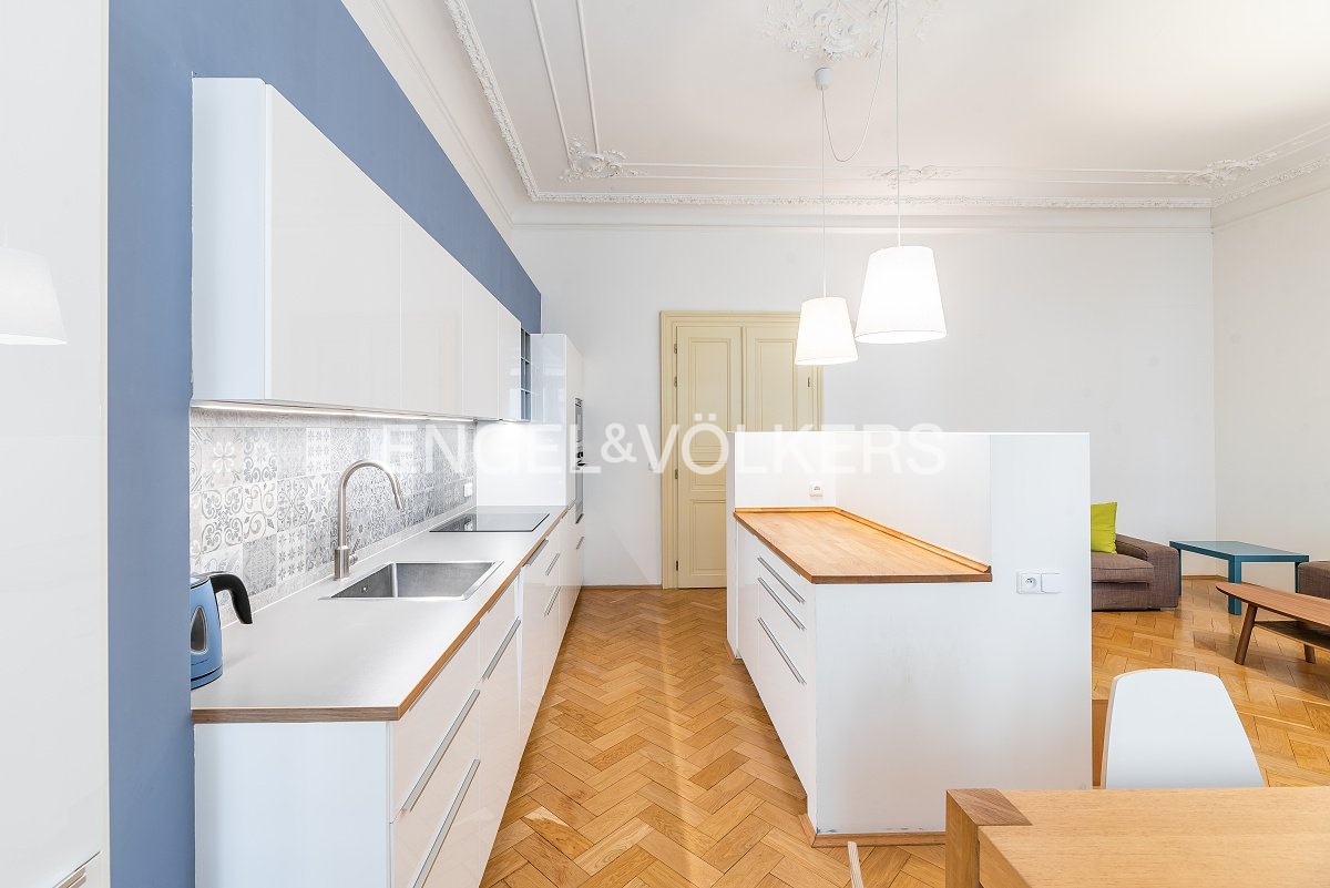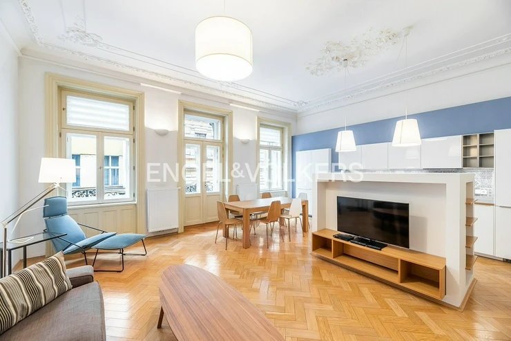 For immediate rent we offer you a renovated, fully equipped apartment in the immediate vicinity of the center of Prague. The apartment consists of two unbroken bedrooms and a living room, which is connected to a fully equipped kitchen with all appliances such as a hob, fridge, freezer, oven, microwave, dishwasher, etc. The apartment also offers two bathrooms, each belonging to one bedroom. The bathrooms are equipped with a bathtub and a toilet. You will also find a balcony, which is situated on Soukenická street. The location offers all amenities in the form of diners, shops bars, within walking distance of the Palladium shopping center and Wenceslas Square. It is possible to rent one parking space for a fee.