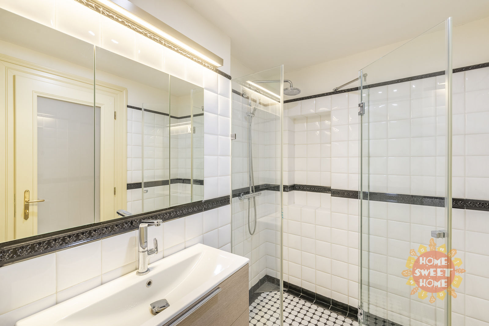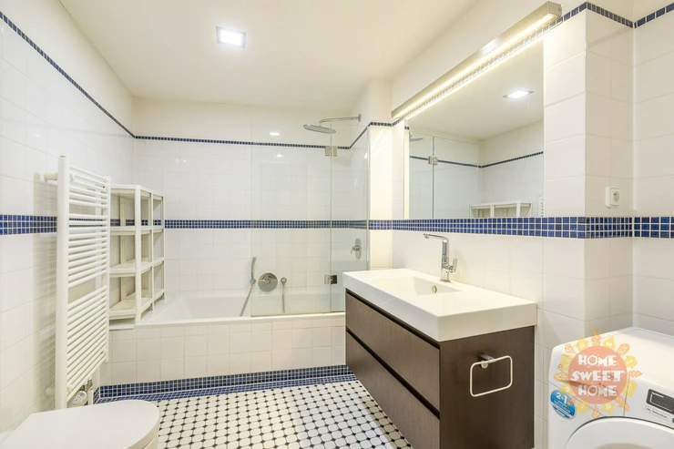 The apartment offers a spacious living room with access to the balcony (3.7 m2), which is connected to the dining area and a modern kitchen. Kitchen - ceramic hob, oven, microwave, dishwasher, fridge with freezer. A practical island in the kitchen provides enough work space. Master bedroom with direct access to its own bathroom (bath, toilet), second bedroom, another separate bathroom (shower, toilet), and a spacious hallway with built-in storage. There is also a washing machine. All furniture is modern.