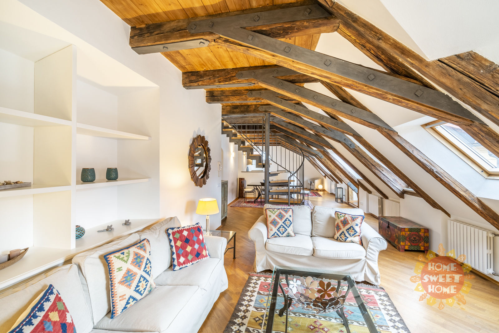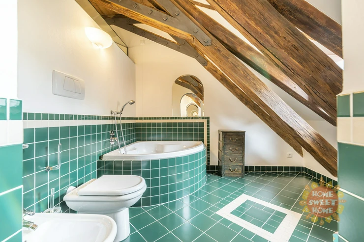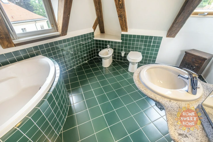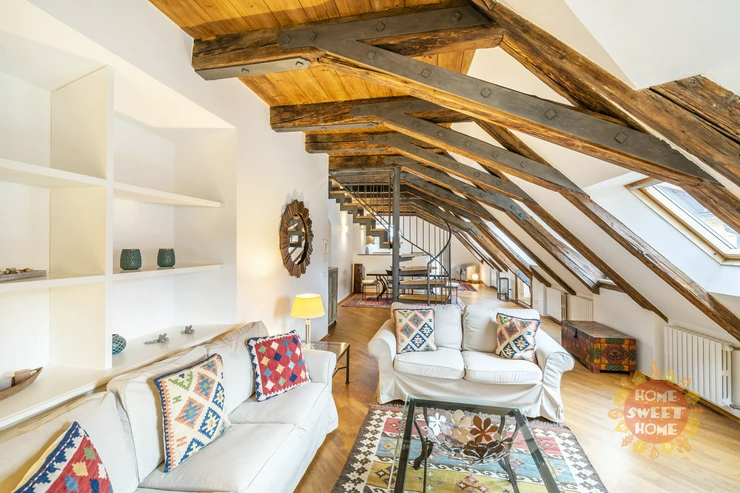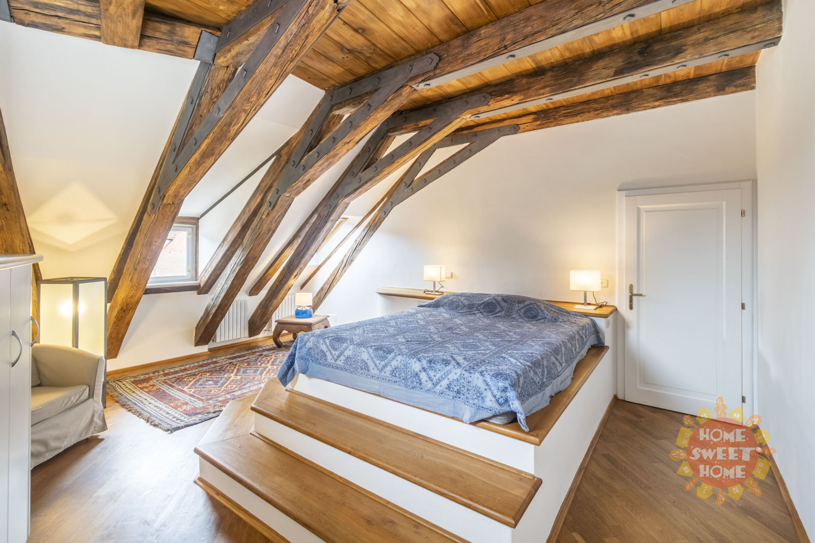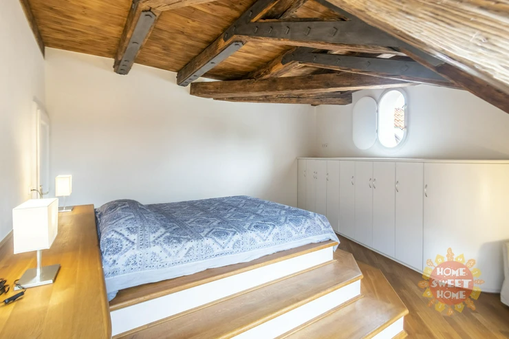 On the first floor we found two bedrooms, cozy living room with the dinning area, modern kitchenette, where we find a cooker with ceramic hob, oven, refrigerator and dishwasher and one of the bathroom, on the second floor is a huge open space and the second bathroom. On the floors are parquets and tiles.