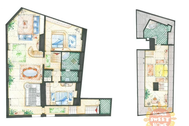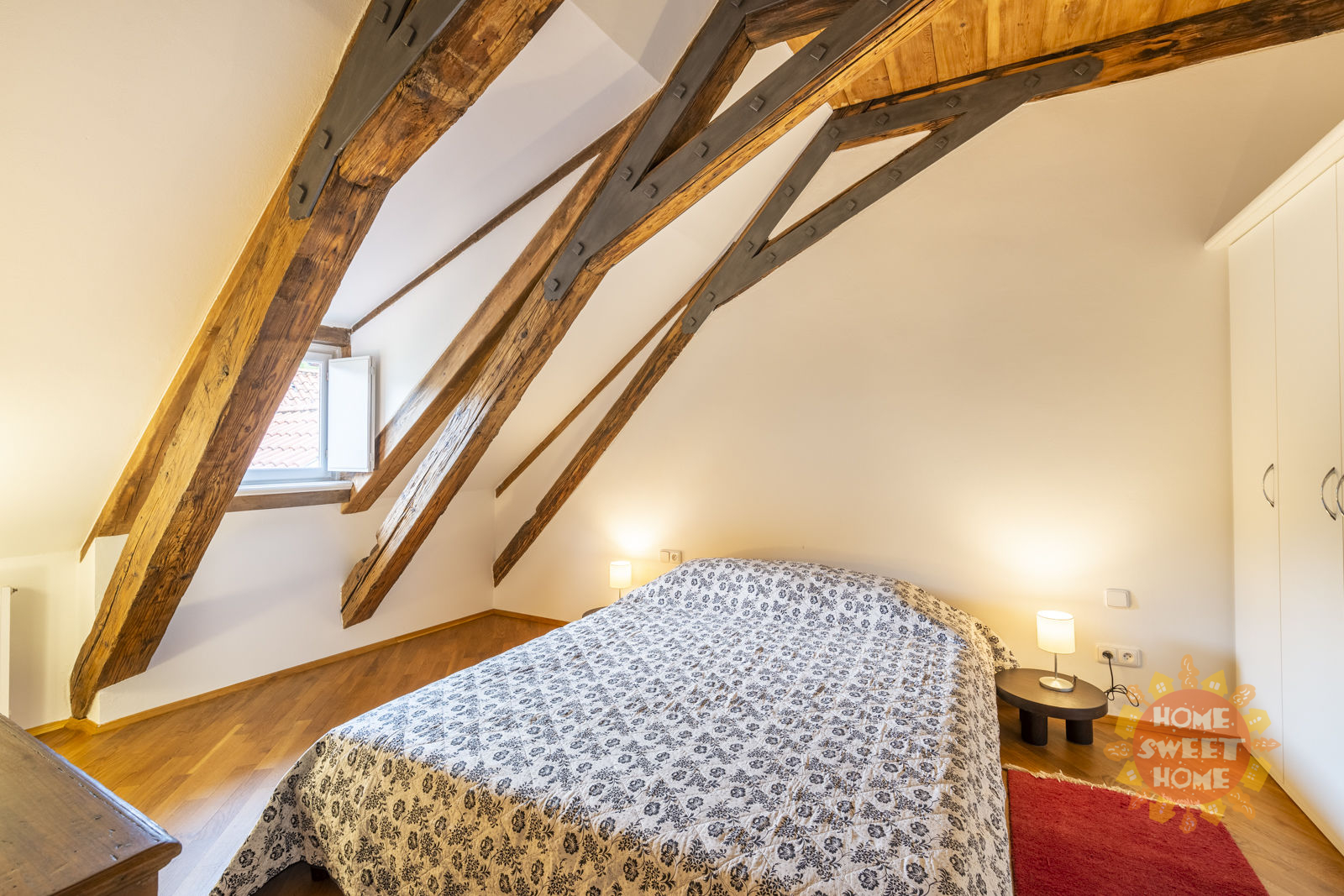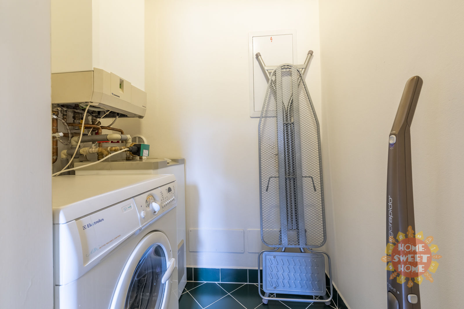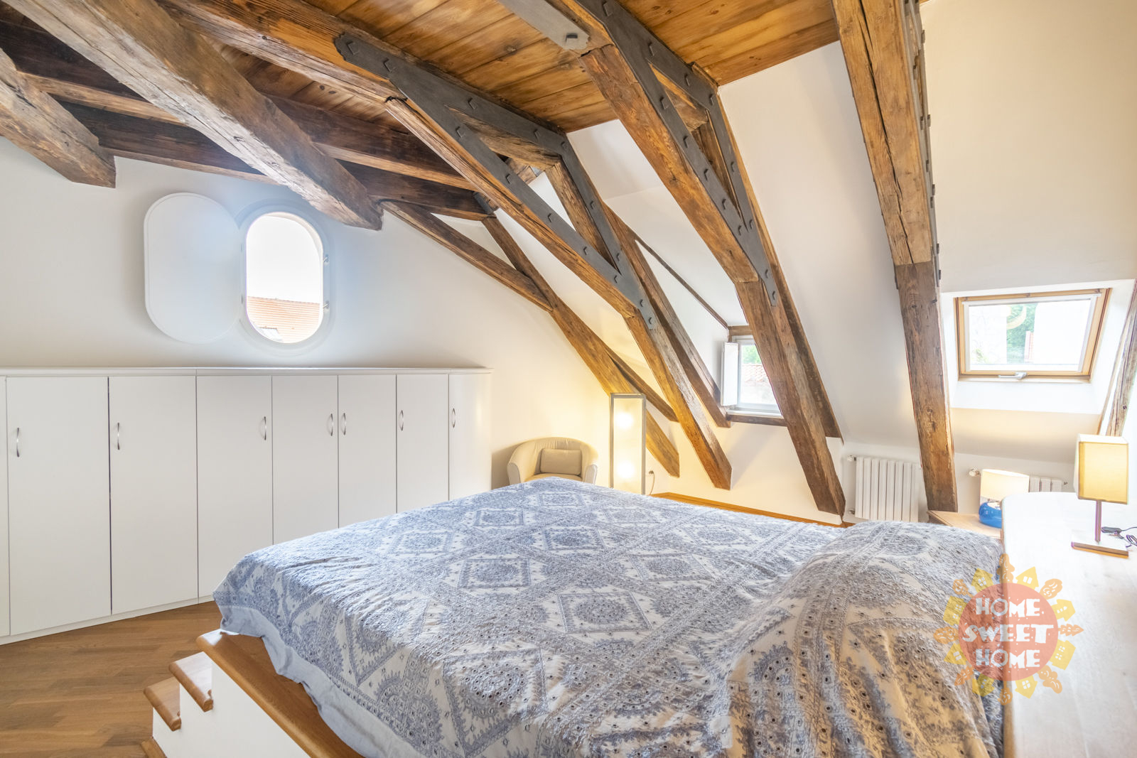 On the first floor we found two bedrooms, cozy living room with the dinning area, modern kitchenette, where we find a cooker with ceramic hob, oven, refrigerator and dishwasher and one of the bathroom, on the second floor is a huge open space and the second bathroom. On the floors are parquets and tiles.