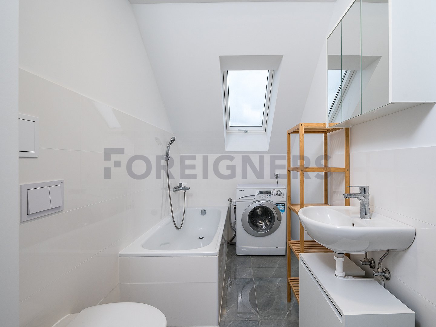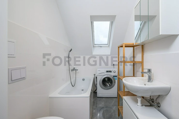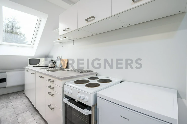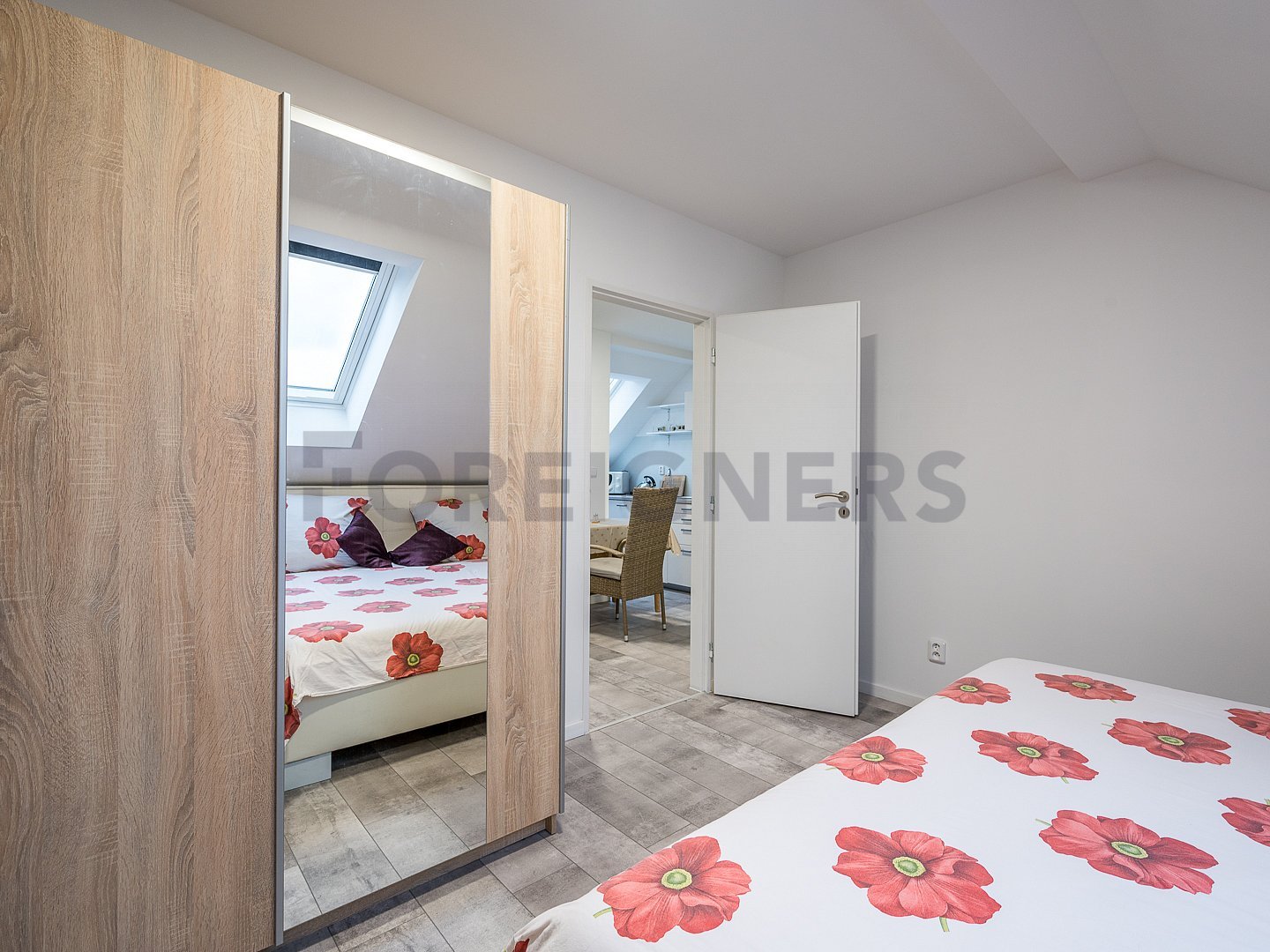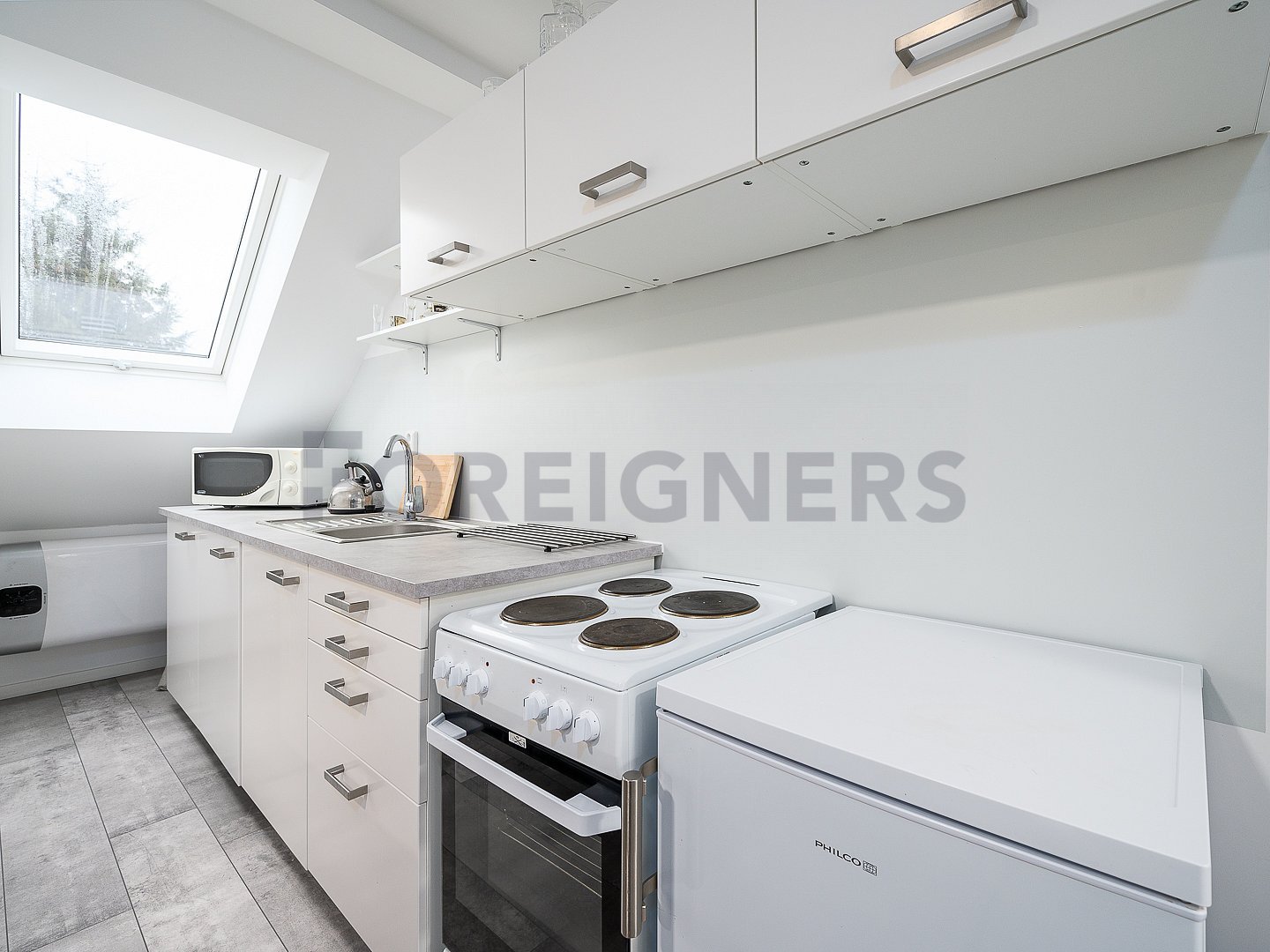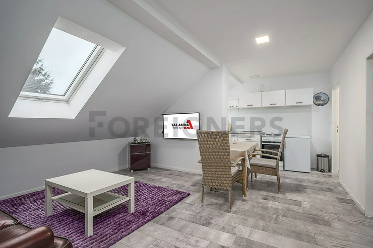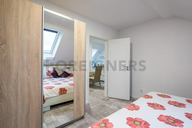 The kitchen has an oven, hob, fridge, microwave and dishwasher. The dining area is equipped with a dining table and chairs. The living area has a comfortable couch, a coffee table and a television. The equipment also includes a washing machine. The bedroom is equipped with double bed and a large wardrobe. From the bedroom there is an entrance to the garden, which is for common using with other tenants of the house. The bathroom with a beautiful spacious bathtub and separated toilet.
