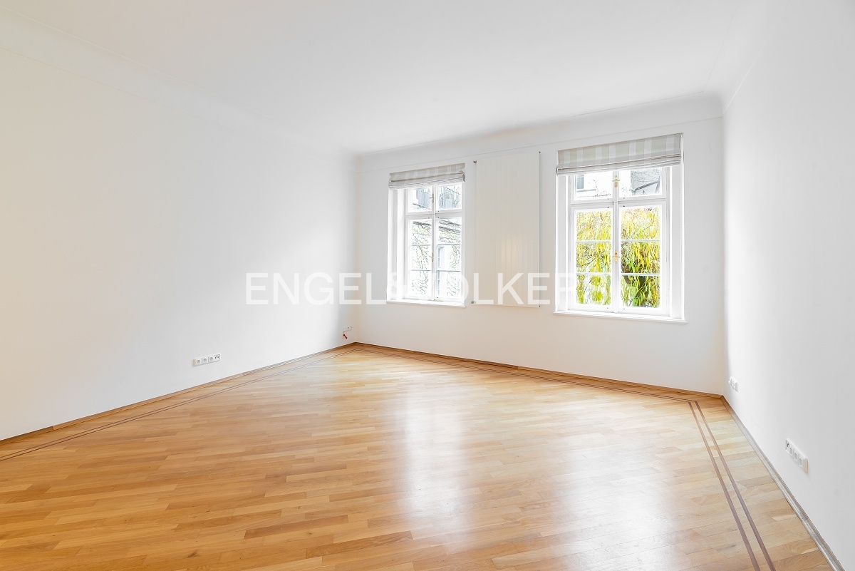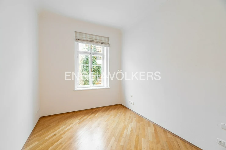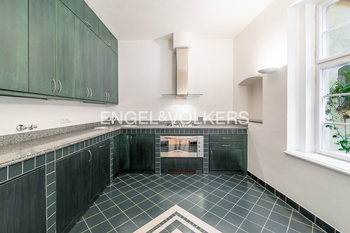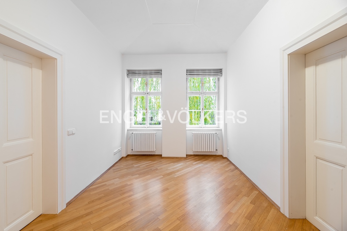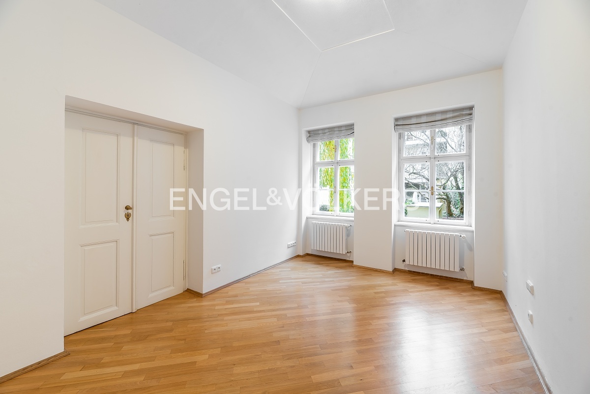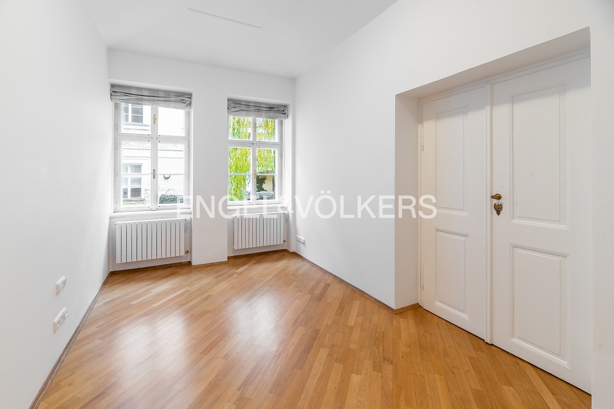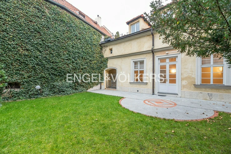 Great address for living in the neighborhood of the German and American embassies. Historic completely renovated residential house from the 16th century. The reconstruction preserves all the original architectural and decorative elements. Duplex apartment situated in inner courtyard with private garden, which will attract you enchant you with original stone tiles in the garden or with wooden parquet flooring in the interior. The great room is spacious living room with recessed walls and other preserved period features, this room is leading to dining room and provides an access to the garden. Fantastic spacious calm inner courtyard-facing terrace, which is a part of landscaped garden maintained by gardener and full of greenery, becomes ideal place for chilling out or just relaxing. Fully equipped kitchen with all the appliances. Total of three bedrooms are waiting for new tenant, two master bedrooms with en-suite bathroom and its own cloakroom. You can find there cornet bathtub or shower cubicle, toilet and bidet in the bathroom. Another room can be used as a workroom. Garden shed, which can be used as an utility room, is available. The beautifully landscaped courtyard with a fountain is a quiet oasis in the heart of Prague.