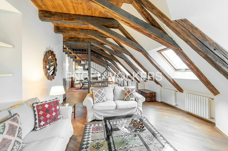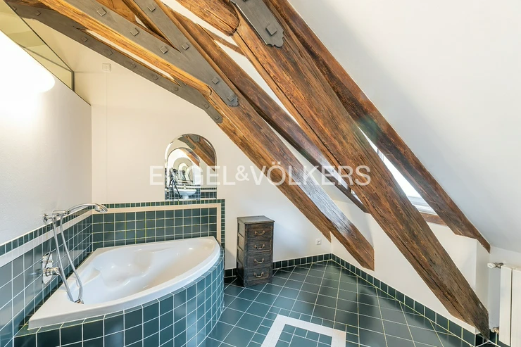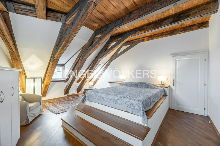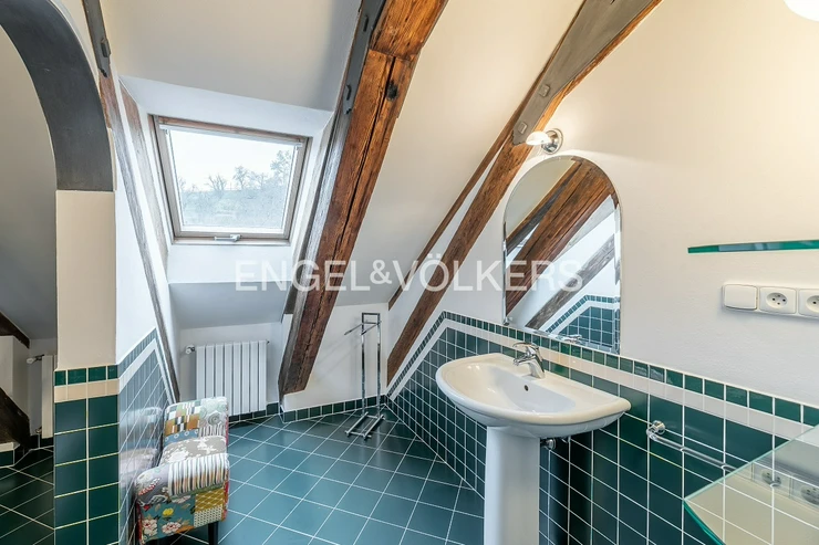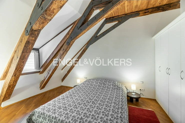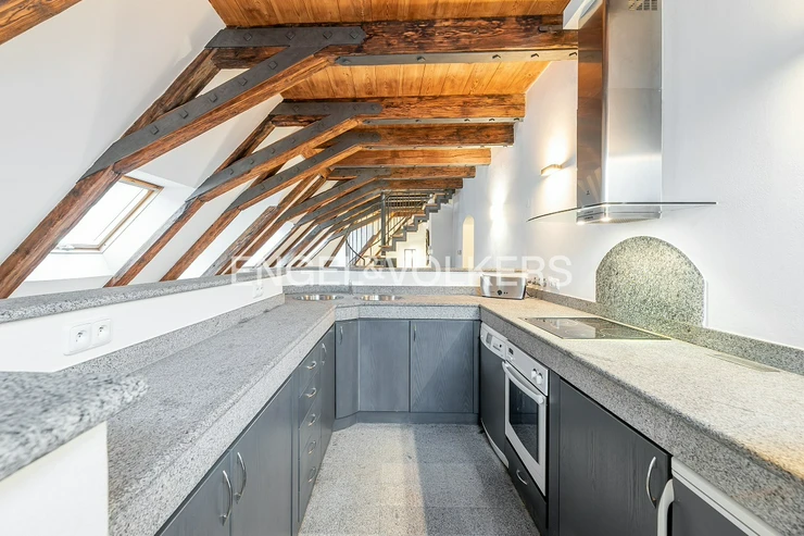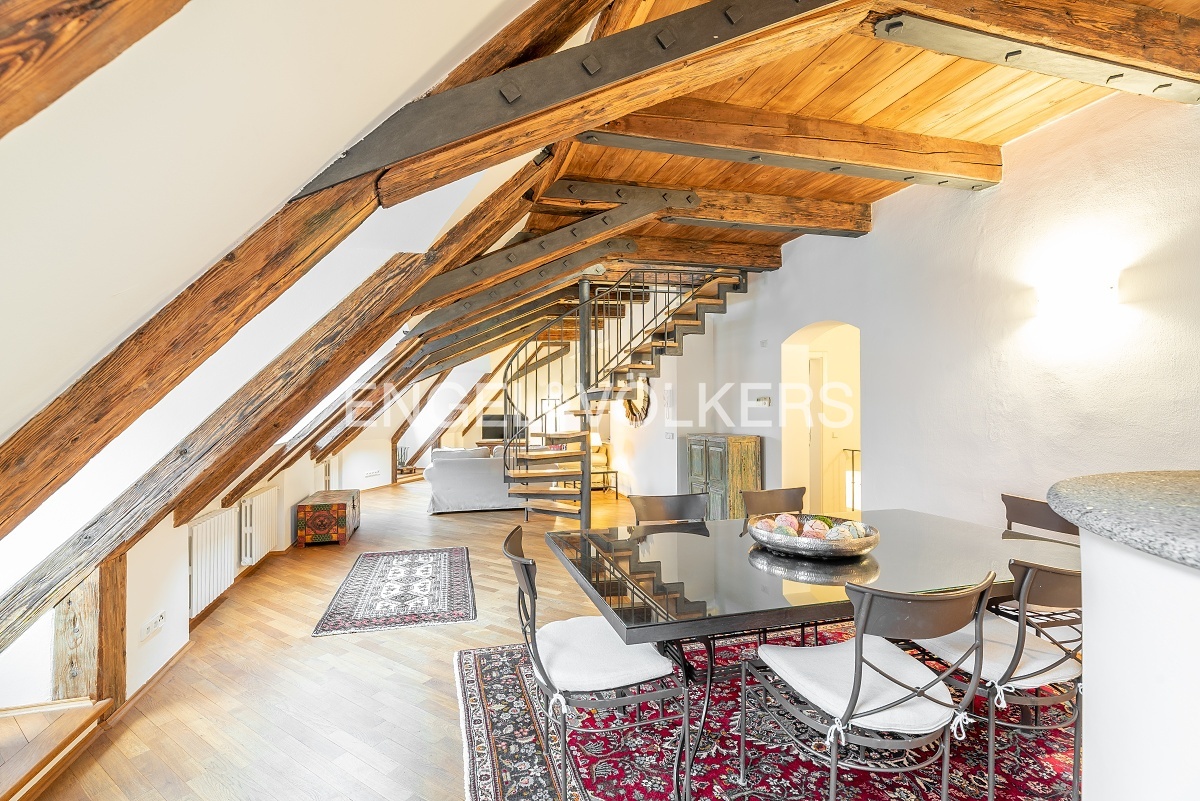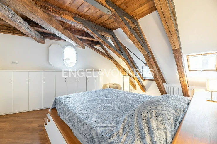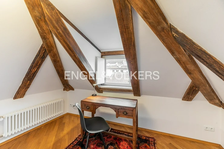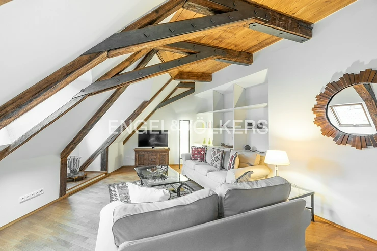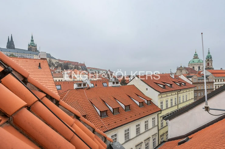 Attic duplex and furnished 4 bedroom apartment with three bedrooms, two bathrooms and a magnificent view of Prague Castle and Petrin Hill.
