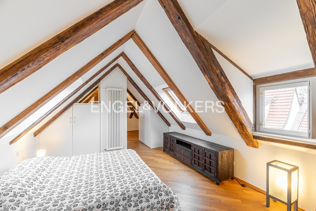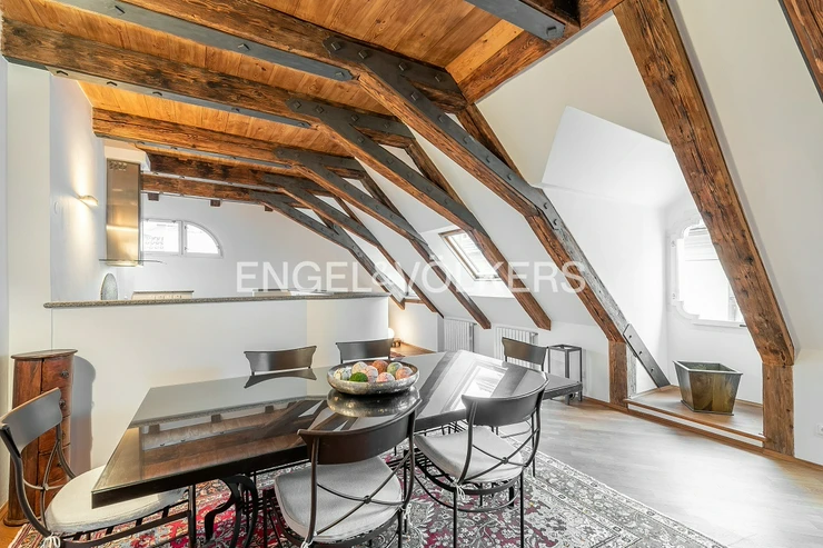 On the first floor there is a spacious bright living room connected with a dining area and a fully equipped kitchen (fridge, freezer, oven, hob, dishwasher), two bedrooms and a bathroom. On the second floor there is an open space - a bedroom with a semi-detached study and a second bathroom. Washing machine and dryer included in the rent. The floors are wooden.