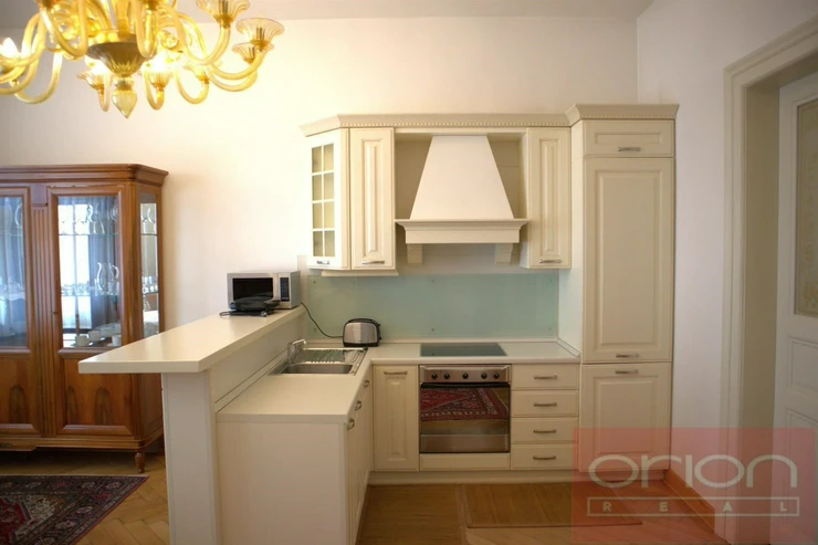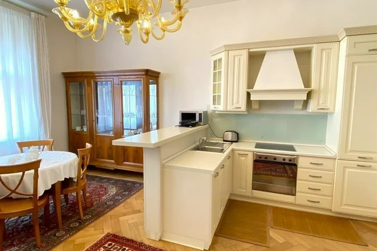 We offer for rent a luxurious furnished two bedroom apartment on the 4th floor of a renovated apartment building with an elevator in the sought-after location of Prague 1 - Nové Město. The apartment has a total area of 79 sqm and offers an entrance hall, living room, fully equipped kitchen with dining area, 2 bedrooms, bathroom with bathtub, toilet and bidet, separate toilet. The apartment is equipped with wooden parquet and tiles, air conditioning, it is equipped to a high standard including dishes and towels. The location has all civic amenities, restaurants, cafes, shops. A few minutes walk to the Náměstí Republiky metro and tram station. Nearby are shops, restaurants, cafes, bistros and the luxury Palladium shopping center. Location with excellent transport accessibility by car and public transport, at the same time in close proximity to the historical center of Prague.