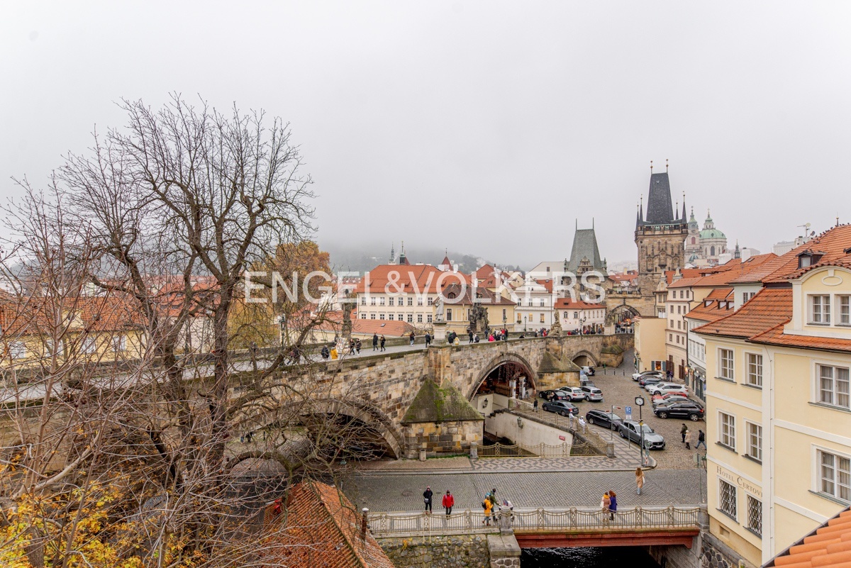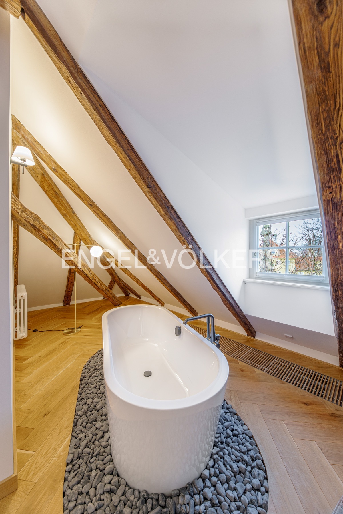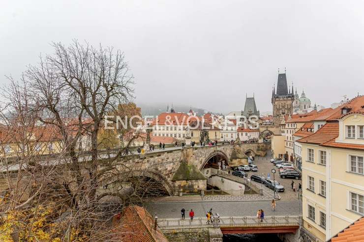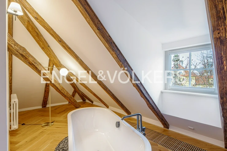 Unique layout with a separate bedroom with built-in wardrobe and en-suite bathroom, beautiful freestanding bath with views of the Petrin Hill, generous living room, kitchen, utility room and guest toilet and cloakroom.