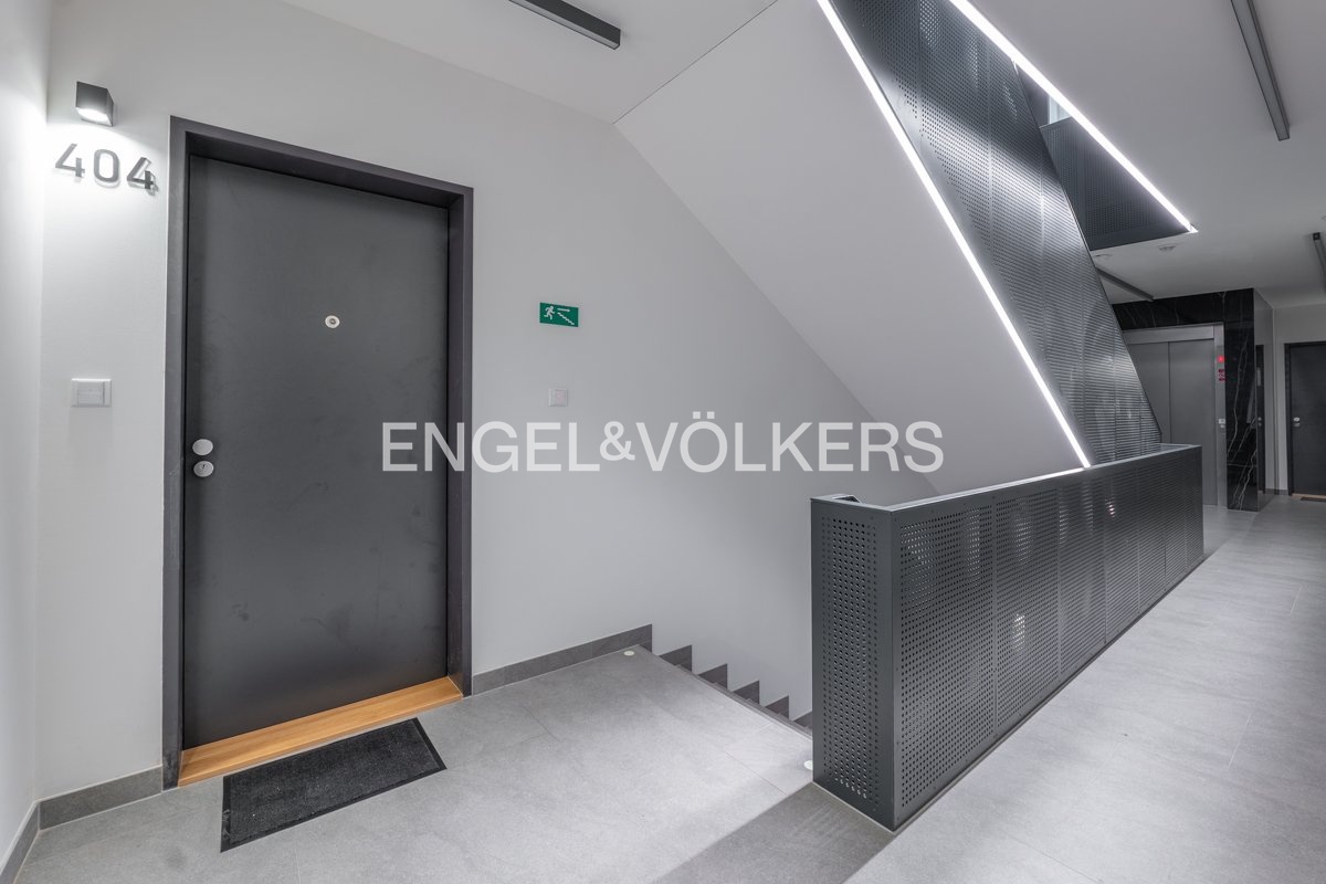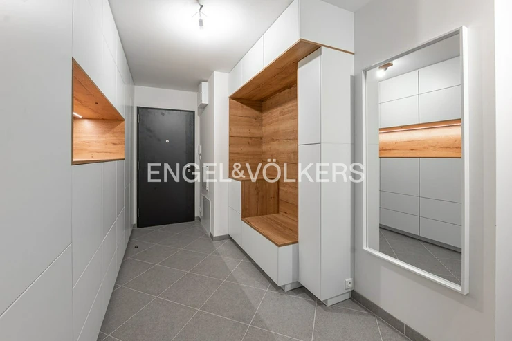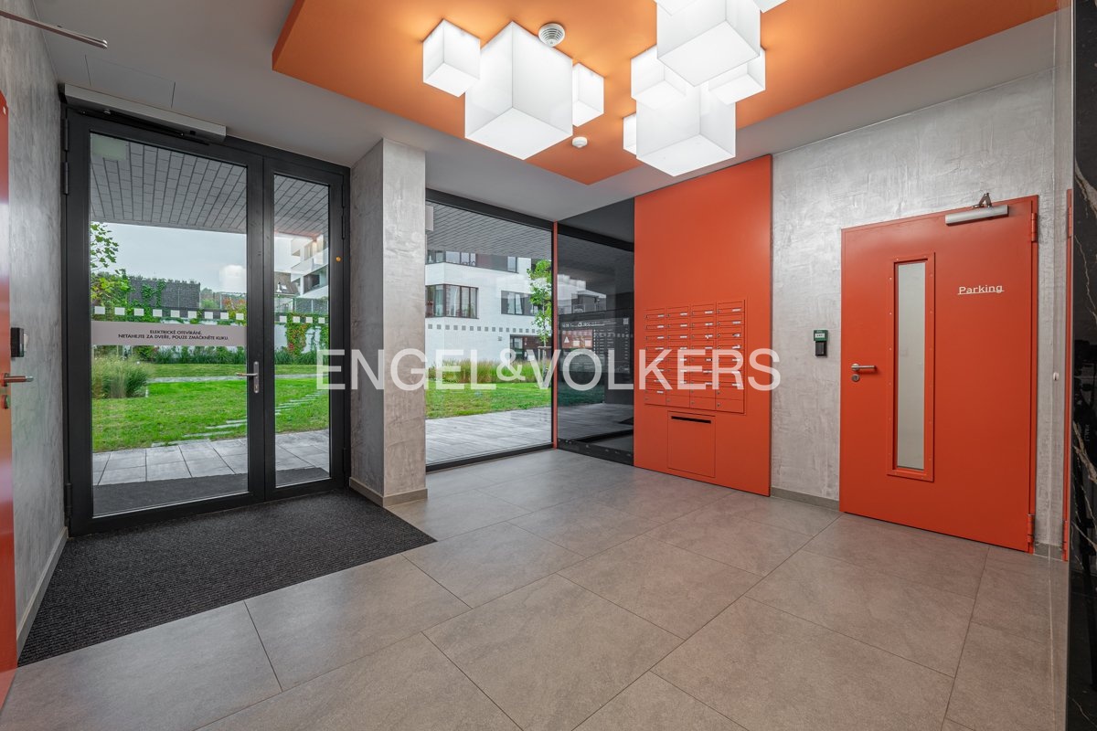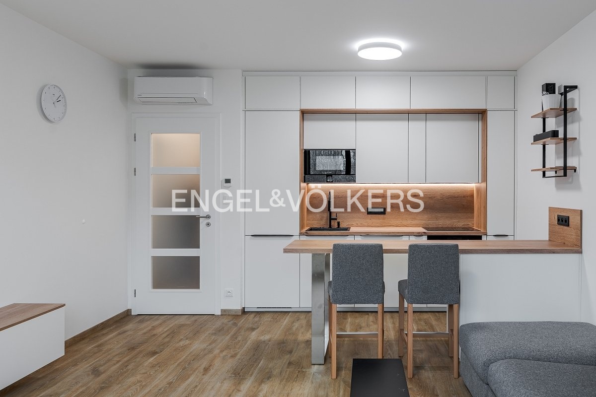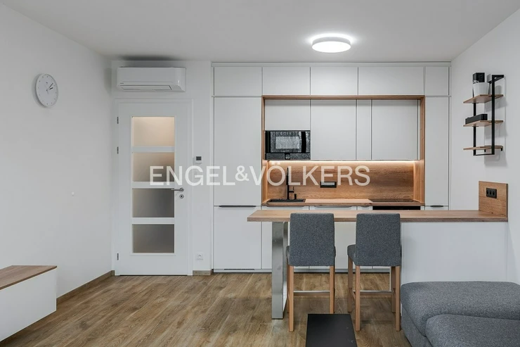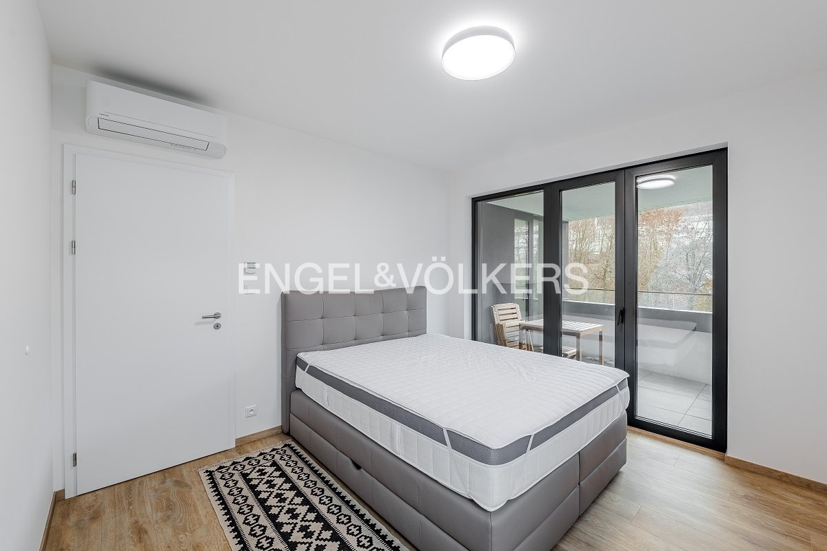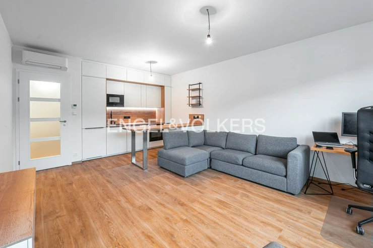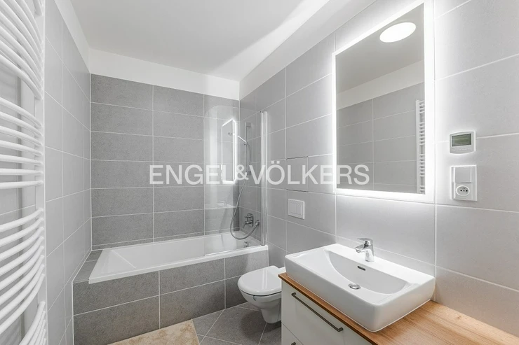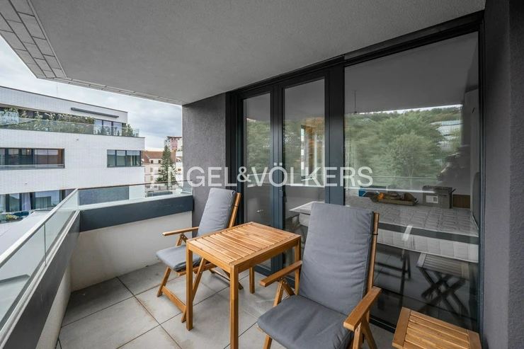 A new and fully equipped apartment 2+kt in high standard is located on the third floor of the new residence U Sluncové. The apartment consists of an entrance hallway with high-quality built-in customized storage, from which you enter the bathroom with a bathtub and washing machine, the living room with a kitchen fully equipped with Bosch appliances and the bedroom with a luxury bed. Both of these rooms have access to a loggia overlooking the greenery. The apartment is also ideal for a home office, as it offers a work area with an adjustable desk that will be separated from the living room by a screen. The advantages are air conditioning in all rooms and a spacious parking space in the underground garage and basement.