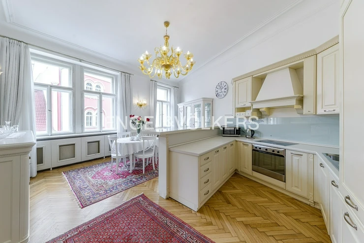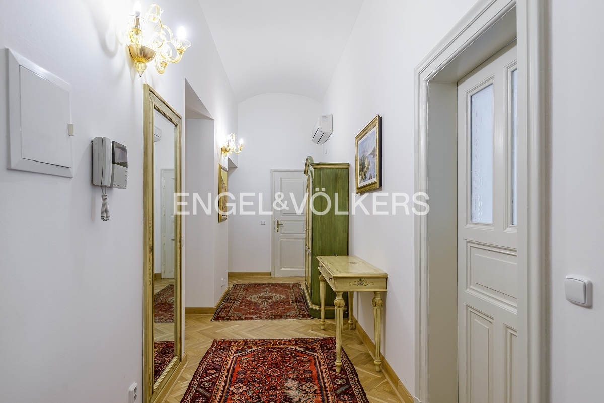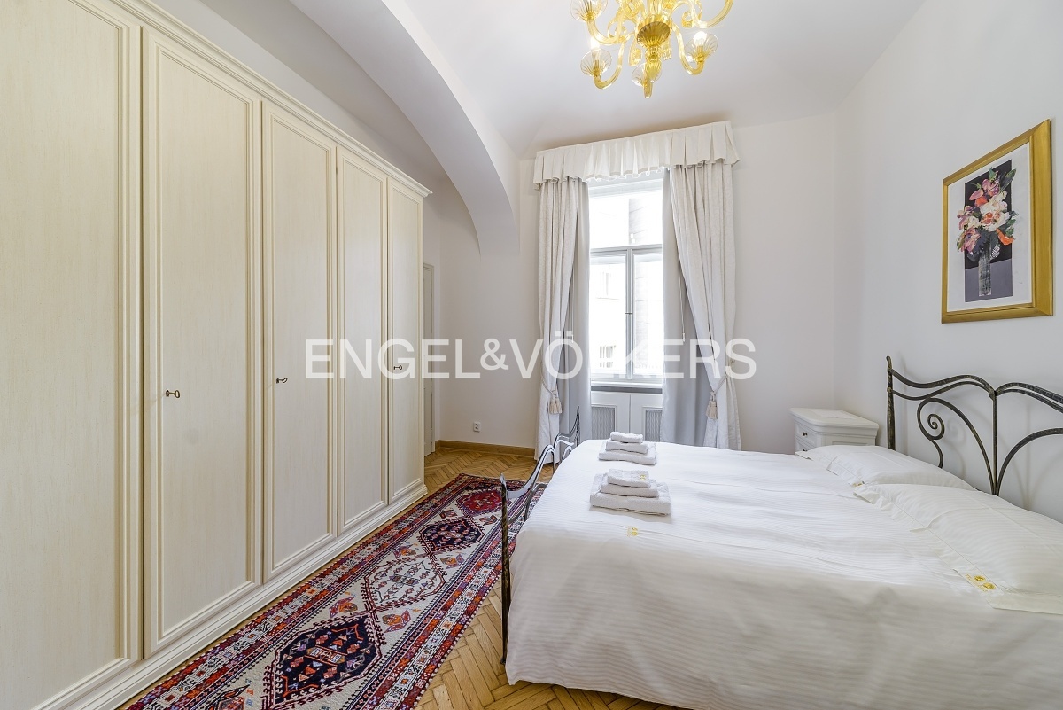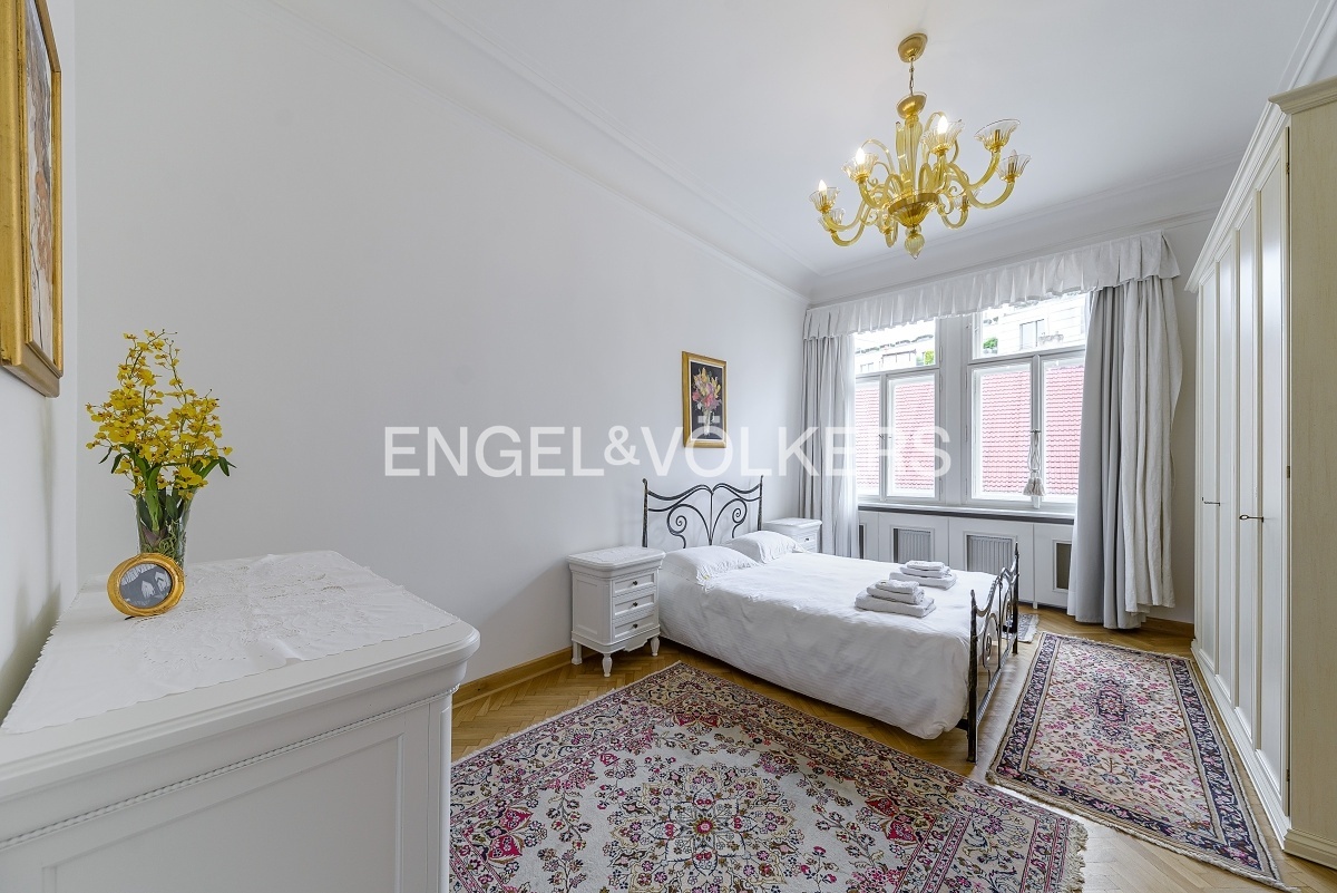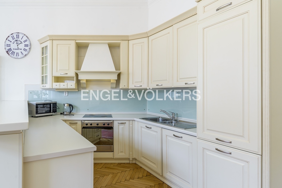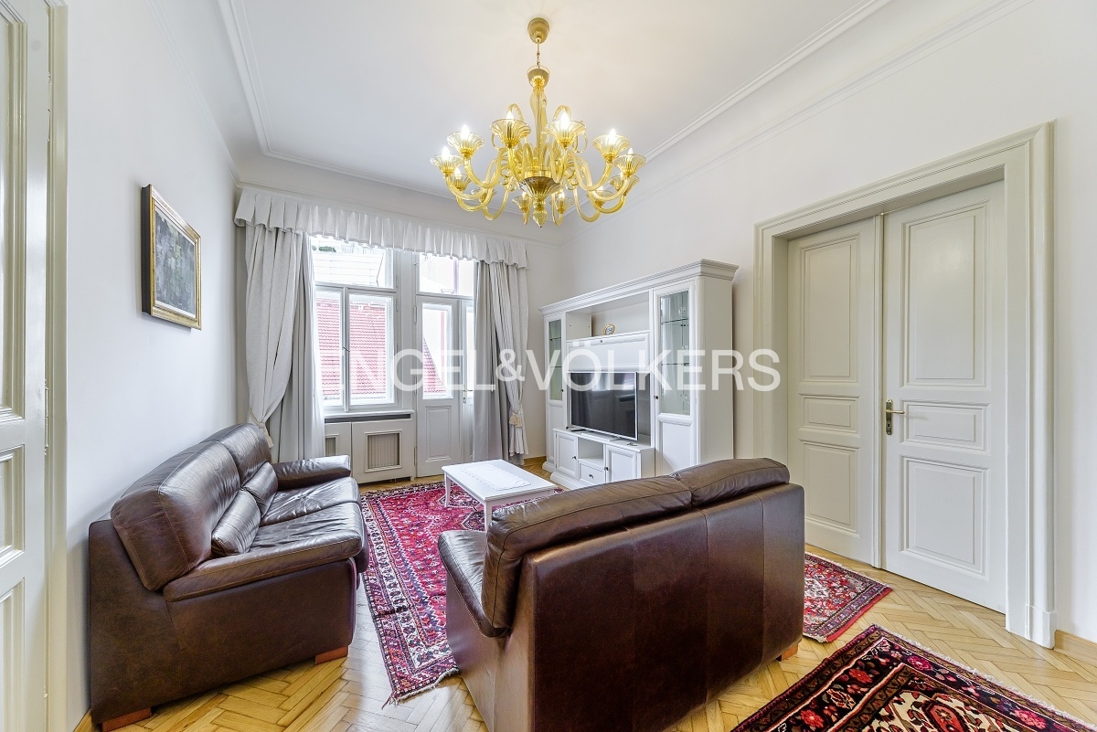 We offer for immediate rent a fully furnished apartment with a layout of 3+1. The apartment is located on the 3rd floor of a historic apartment building with an elevator. The apartment has preserved original elements and is fully furnished with Italian style furniture.