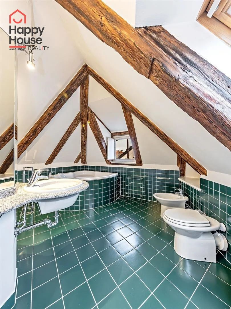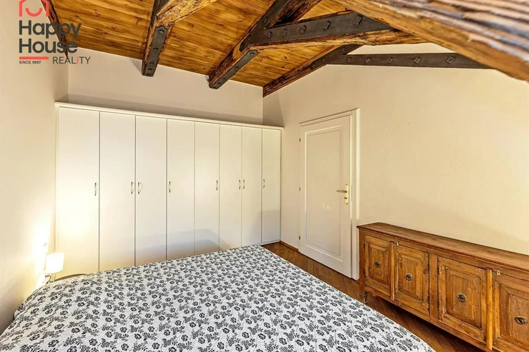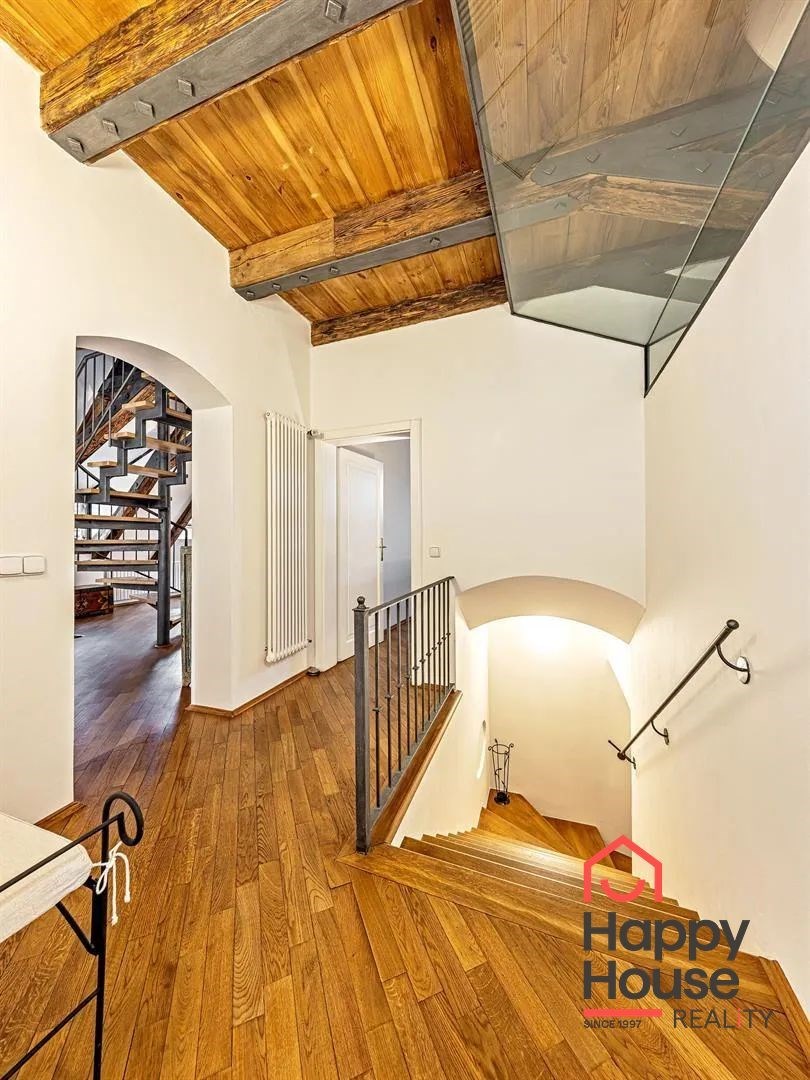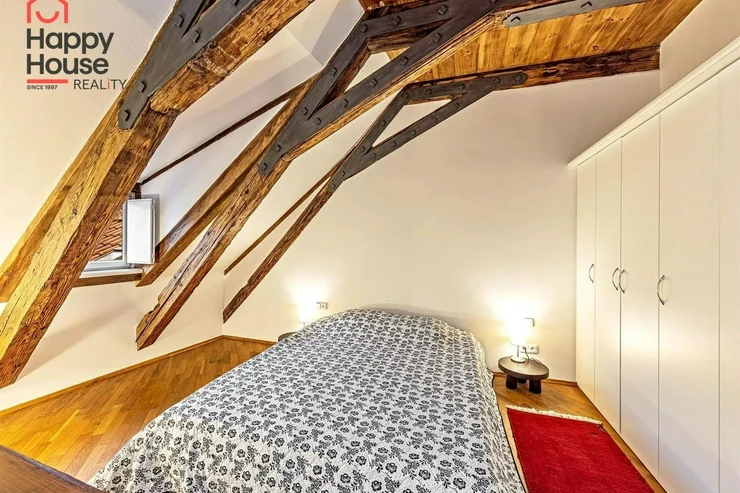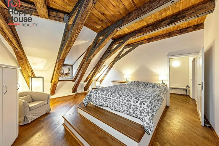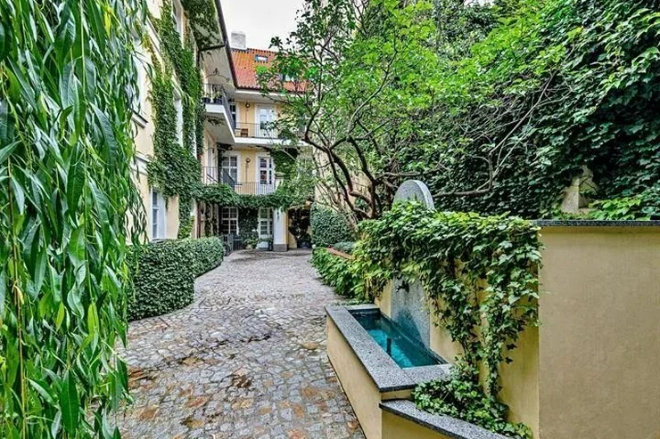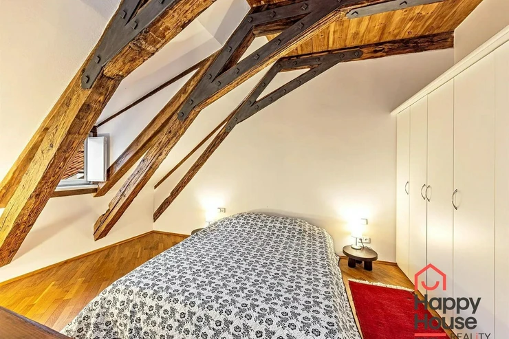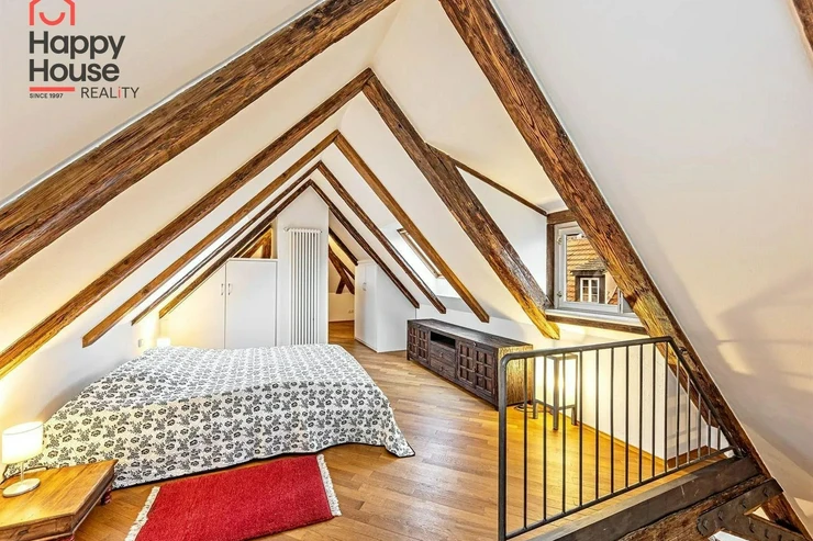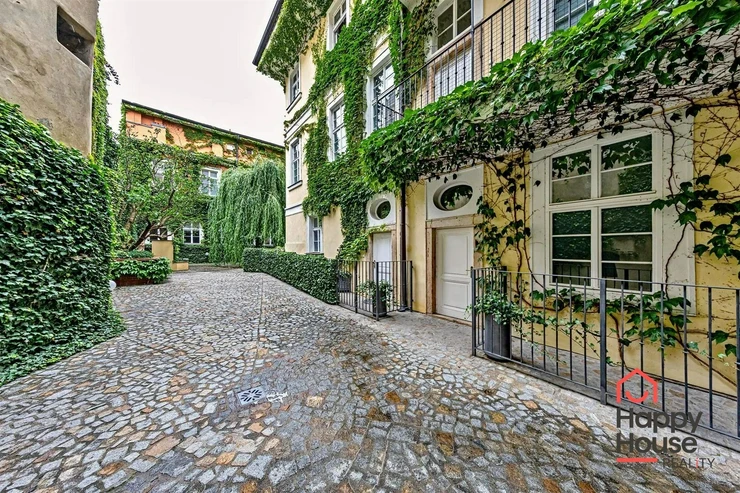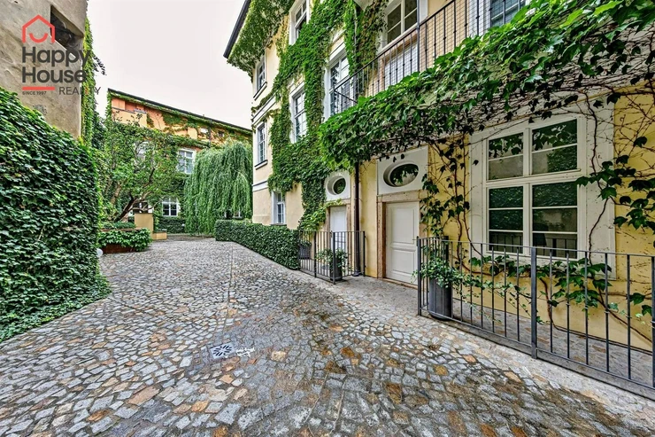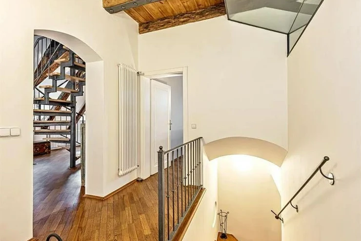 We offer for rent an exceptional, fully furnished duplex apartment 4+1 located on the 3rd and 4th floors of a historic 16th-century building that has undergone a sensitive restoration with a modern elevator (the apartment has its own direct elevator entrance). The building carries the historic name "At the Three Red Hearts" and is among the architectural gems of Mala Strana – it stands out with an atmosphere where history meets modern comfort. Access is through a quiet green courtyard with a fountain and mature trees, creating almost a paradisiacal tranquility in the heart of the city.