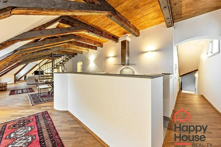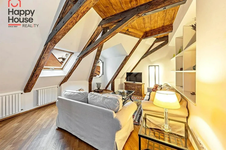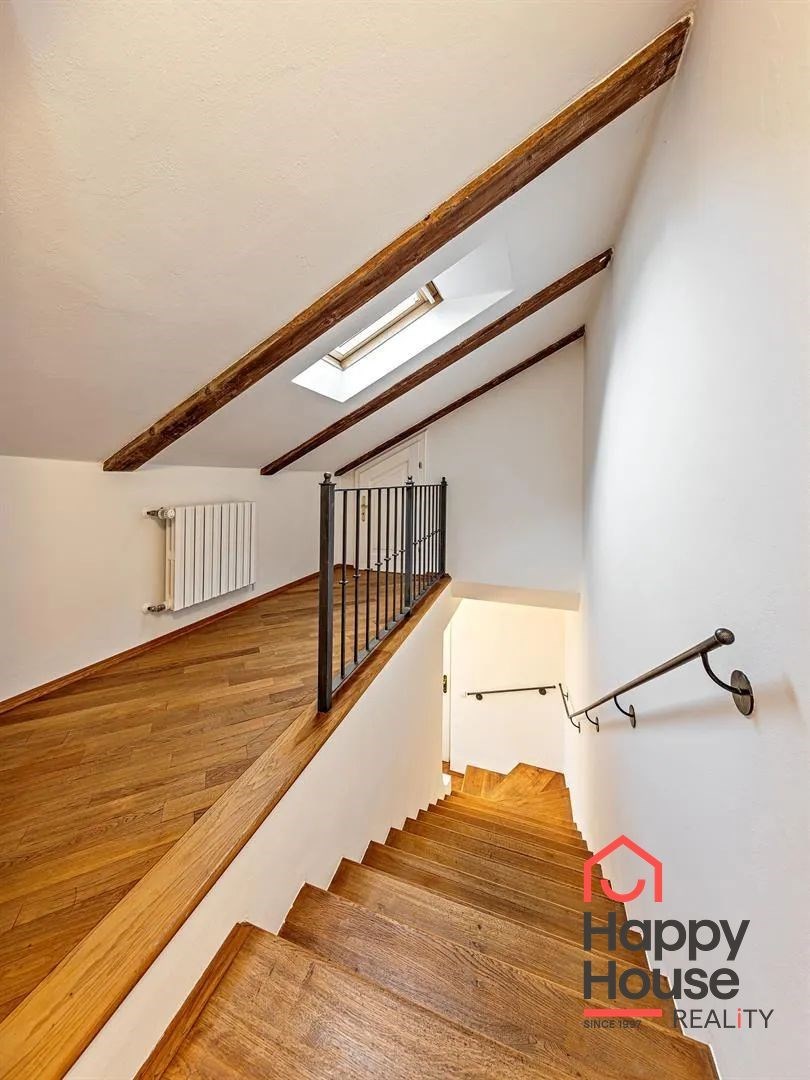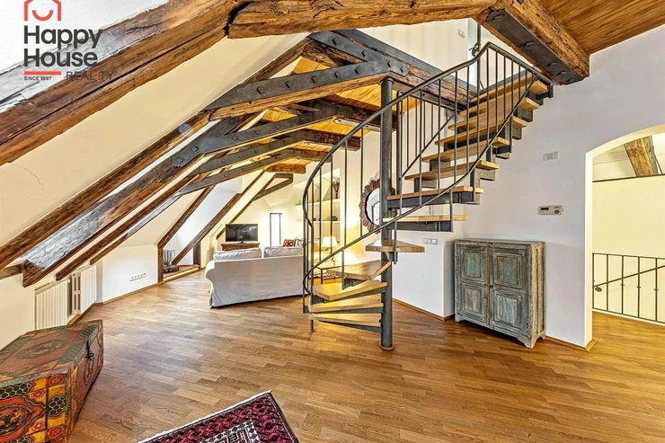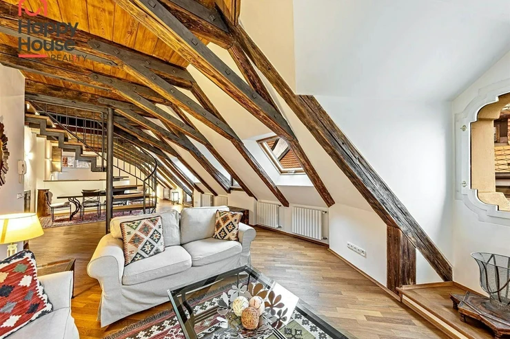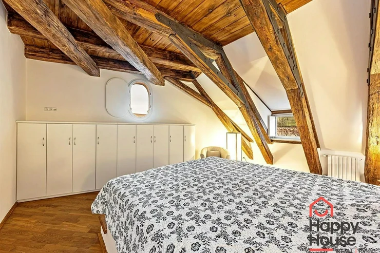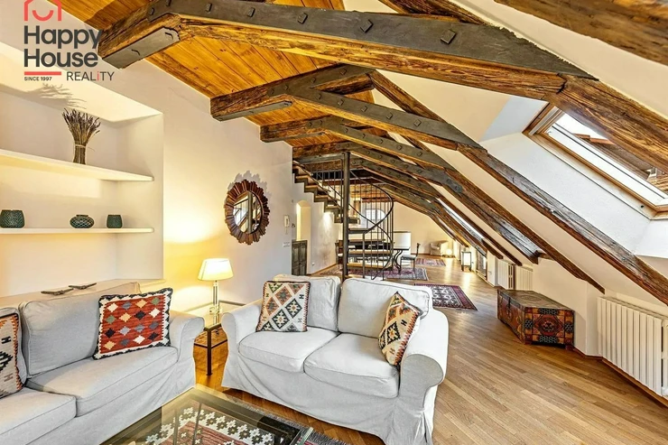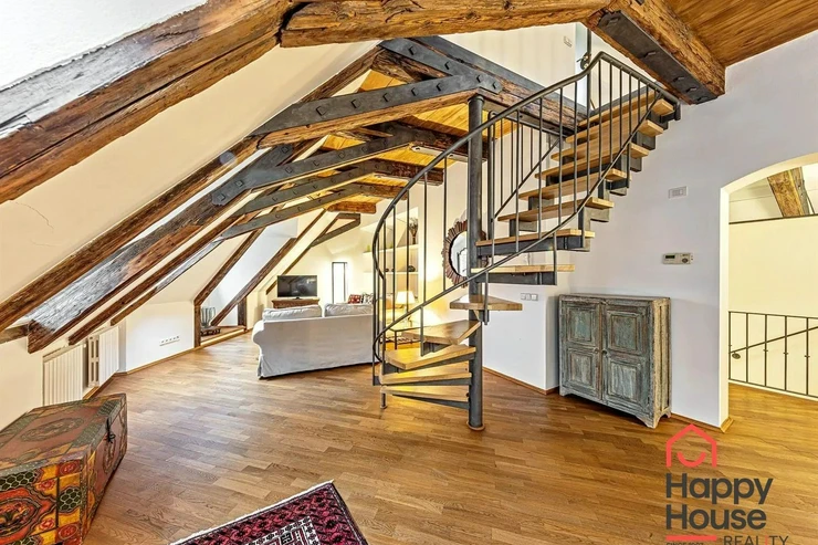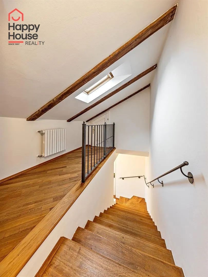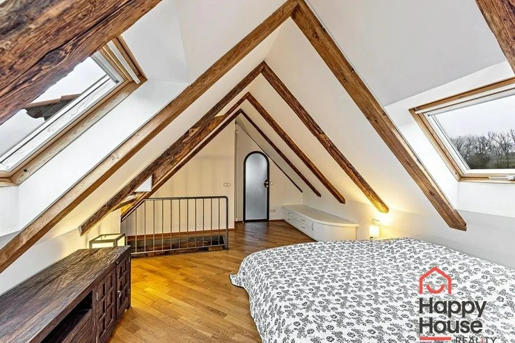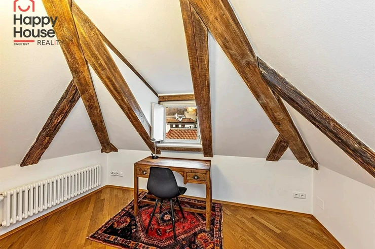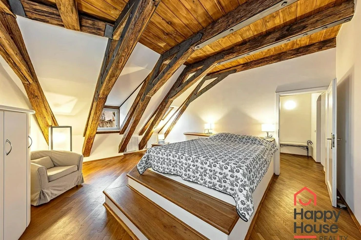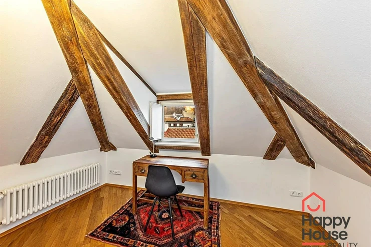 The first level of the apartment features a bright living room connected to a dining area and a fully equipped kitchen (refrigerator with freezer, oven, cooktop, dishwasher), two separate bedrooms, a bathroom with a corner bathtub, toilet and bidet, and two storage rooms (one with a washing machine). One floor up is an open space – a bedroom with a work area and its own bathroom. The upper floor offers a unique view of Prague Castle and Petrin. The floors have original parquet and tiles, the apartment has central heating and internet availability.