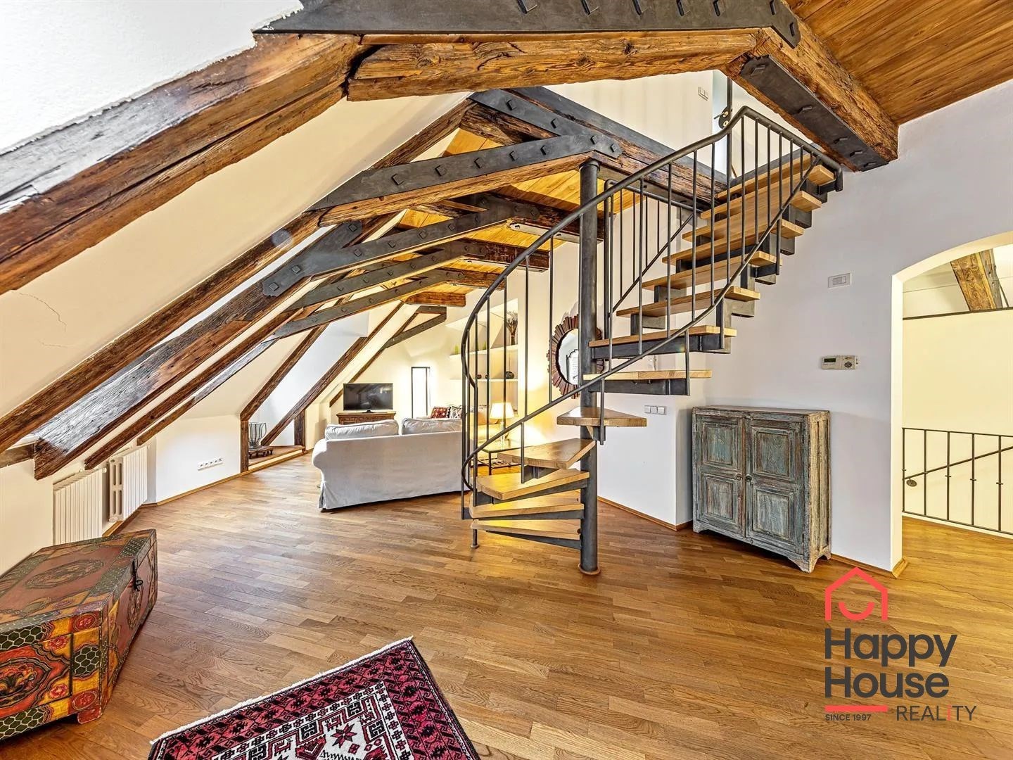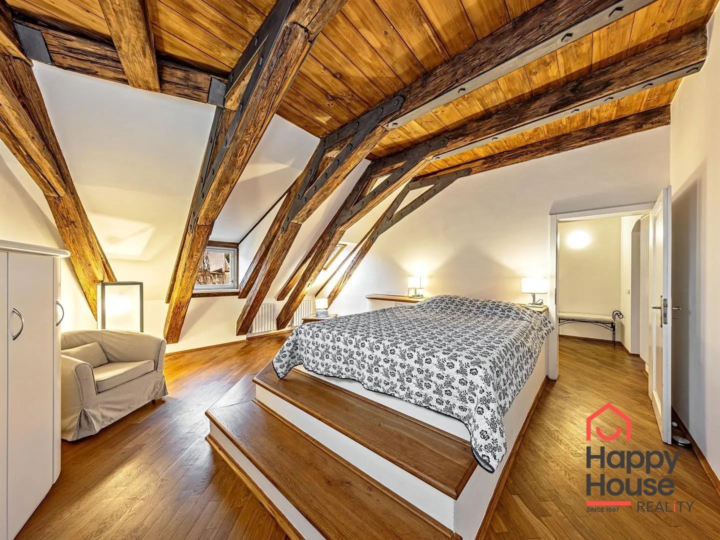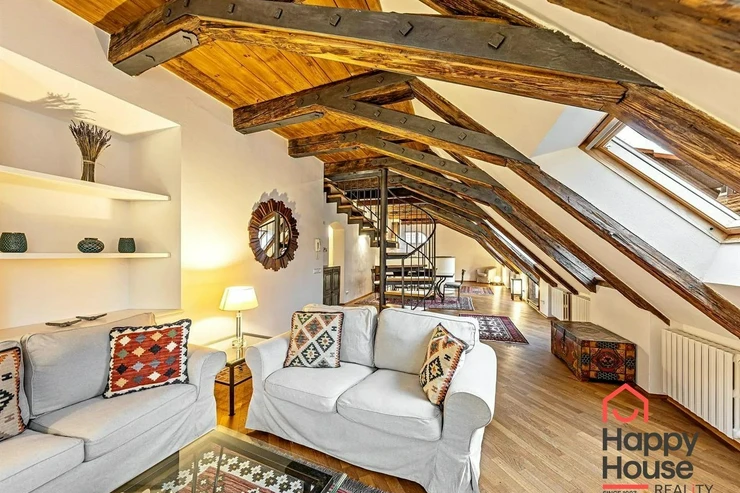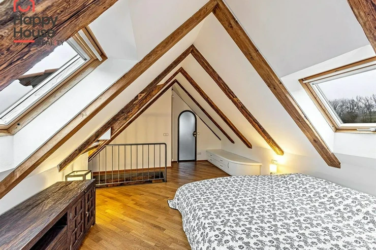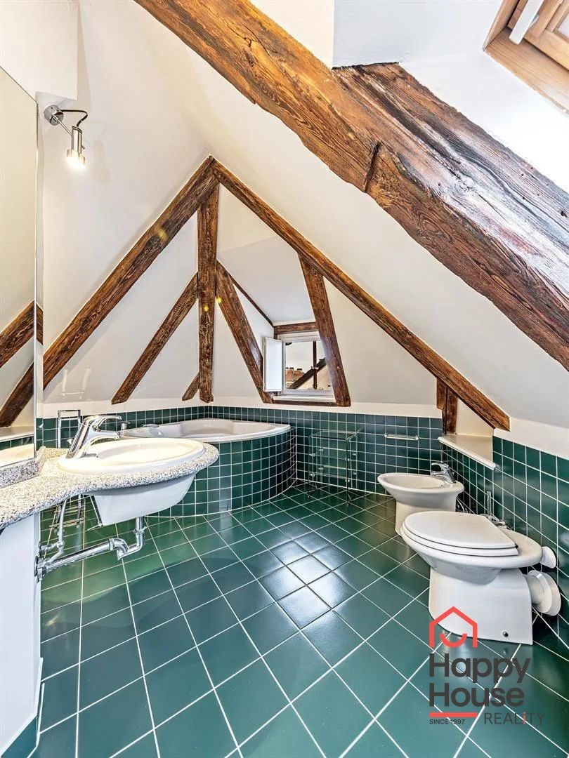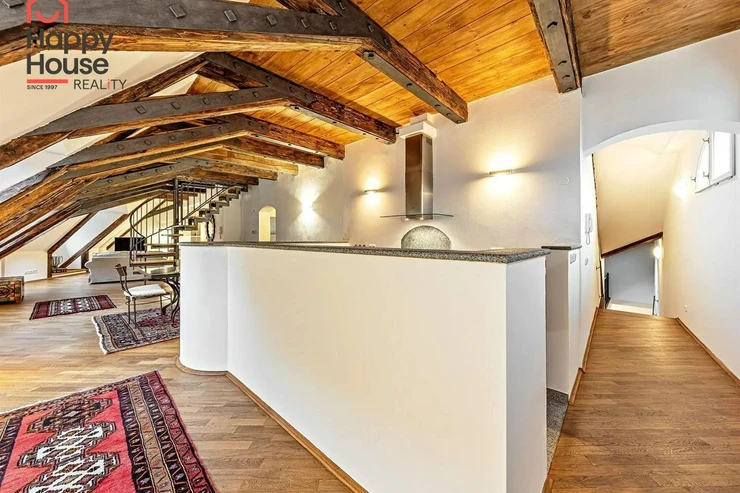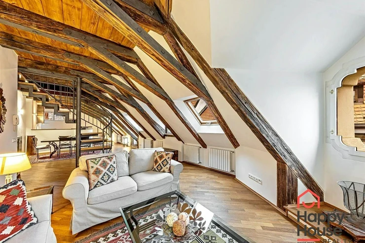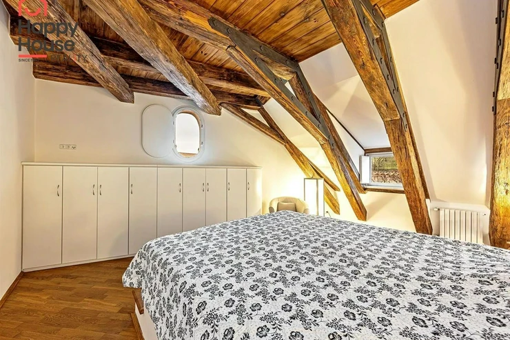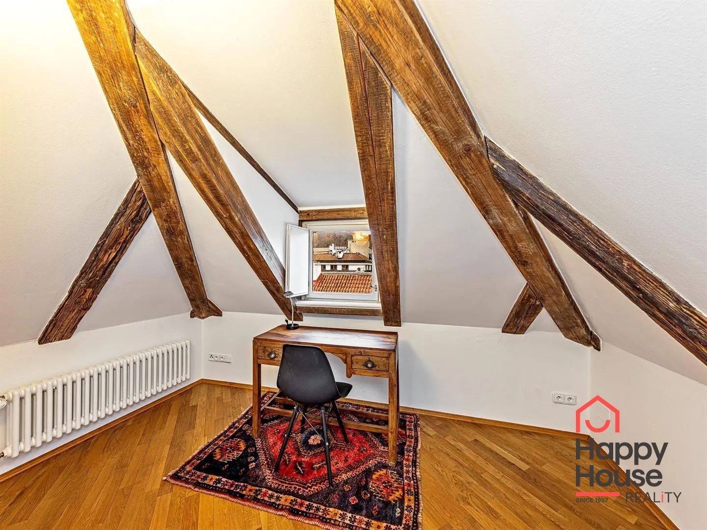 The first level of the apartment features a bright living room connected to a dining area and a fully equipped kitchen (refrigerator with freezer, oven, cooktop, dishwasher), two separate bedrooms, a bathroom with a corner bathtub, toilet and bidet, and two storage rooms (one with a washing machine). One floor up is an open space – a bedroom with a work area and its own bathroom. The upper floor offers a unique view of Prague Castle and Petrin. The floors have original parquet and tiles, the apartment has central heating and internet availability.