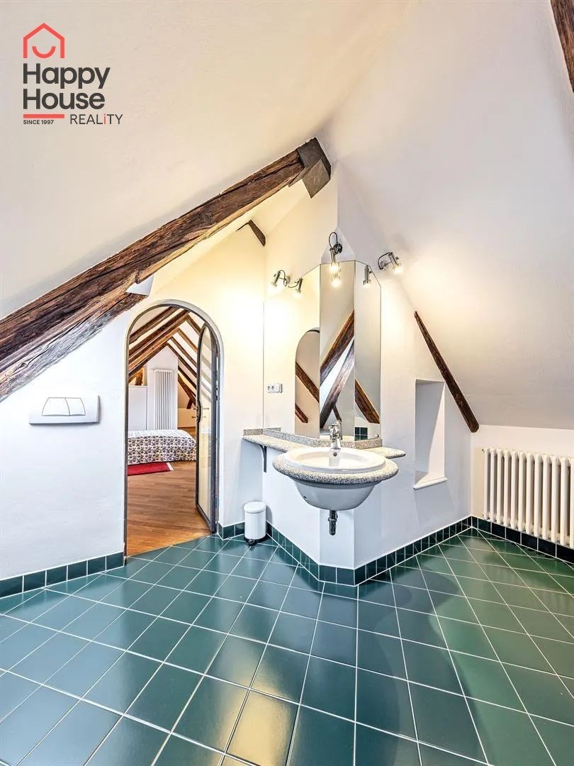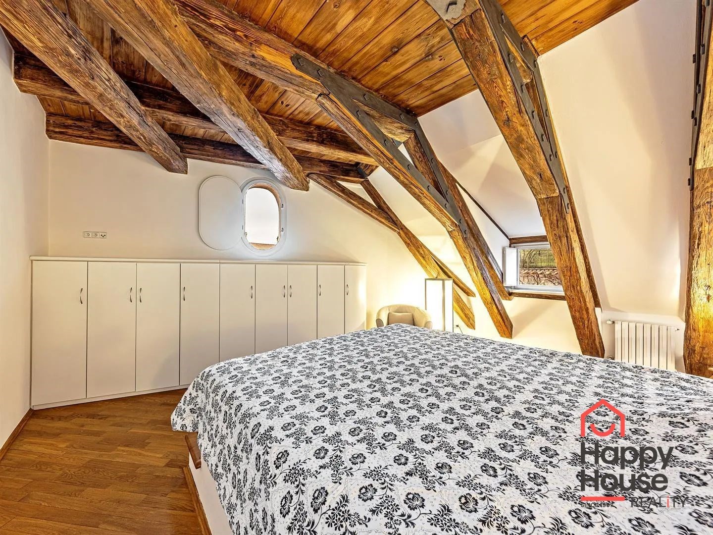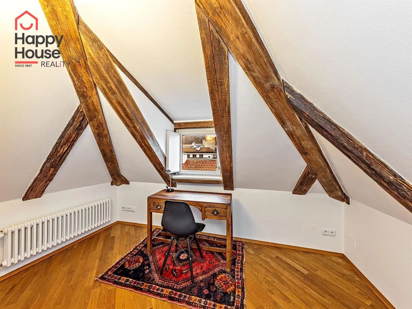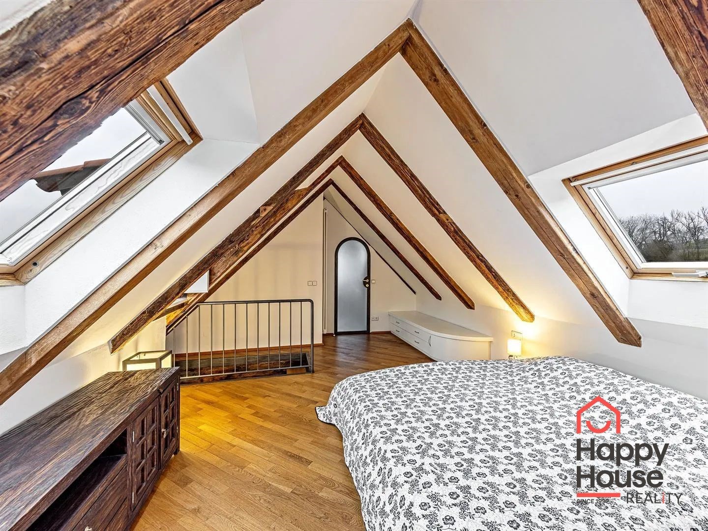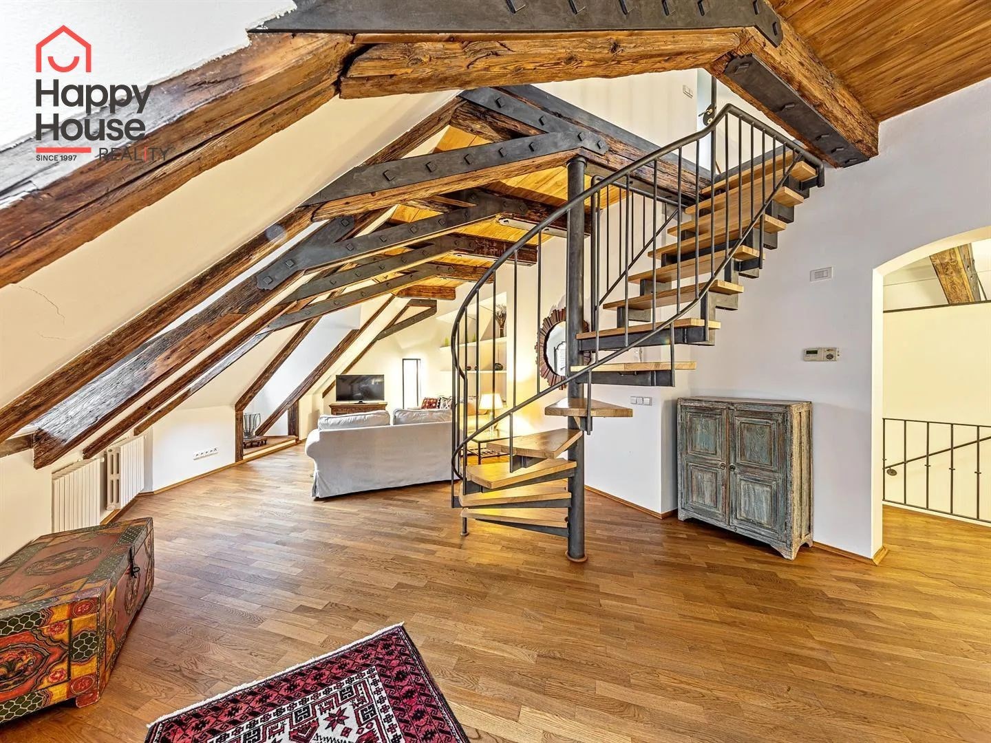 The first level of the apartment features a bright living room connected to a dining area and a fully equipped kitchen (refrigerator with freezer, oven, cooktop, dishwasher), two separate bedrooms, a bathroom with a corner bathtub, toilet and bidet, and two storage rooms (one with a washing machine). One floor up is an open space – a bedroom with a work area and its own bathroom. The upper floor offers a unique view of Prague Castle and Petrin. The floors have original parquet and tiles, the apartment has central heating and internet availability.