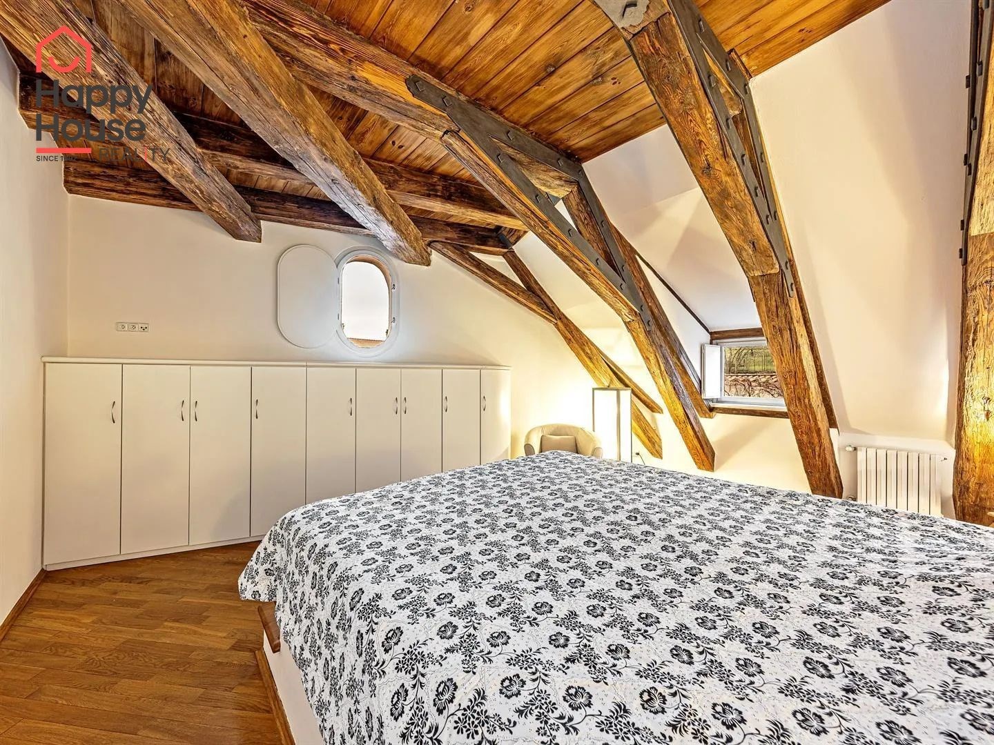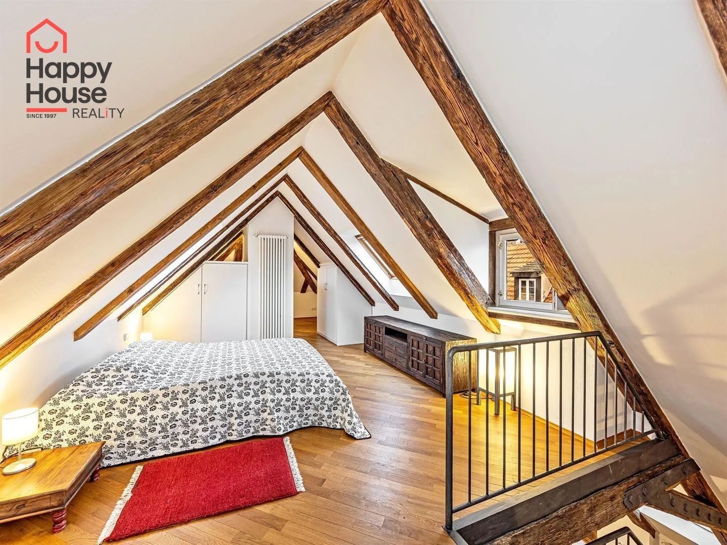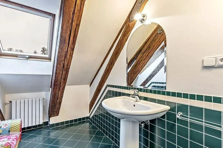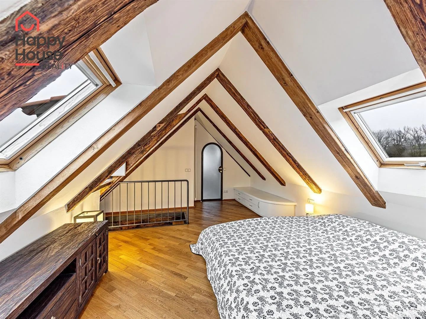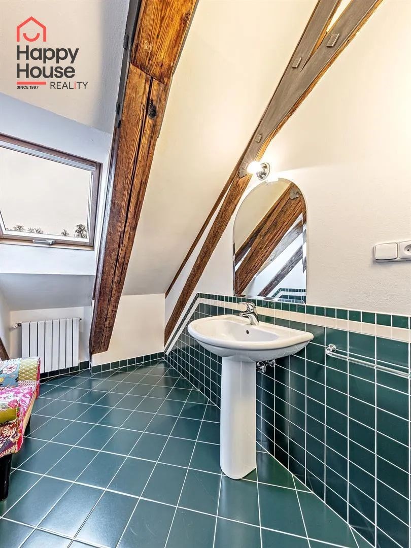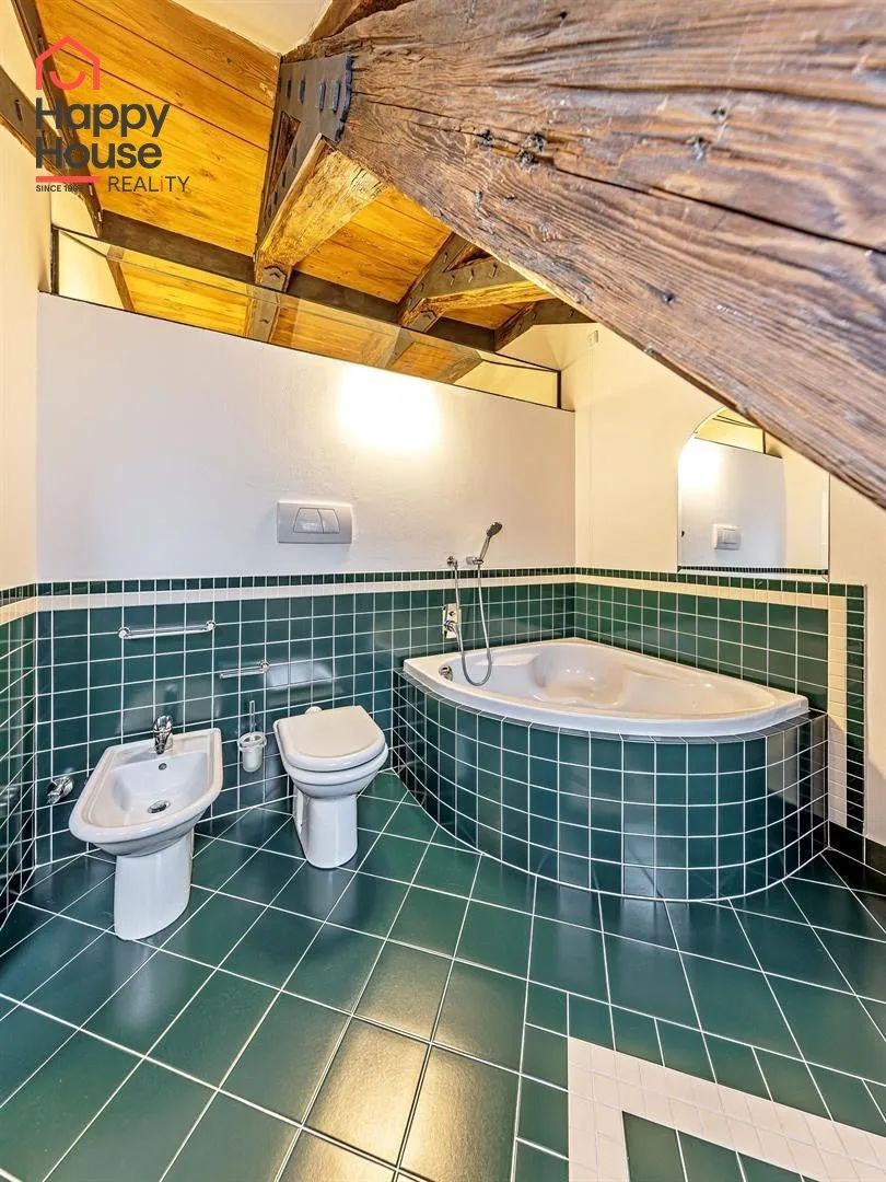 The first level of the apartment features a bright living room connected to a dining area and a fully equipped kitchen (refrigerator with freezer, oven, cooktop, dishwasher), two separate bedrooms, a bathroom with a corner bathtub, toilet and bidet, and two storage rooms (one with a washing machine). One floor up is an open space – a bedroom with a work area and its own bathroom. The upper floor offers a unique view of Prague Castle and Petrin. The floors have original parquet and tiles, the apartment has central heating and internet availability.