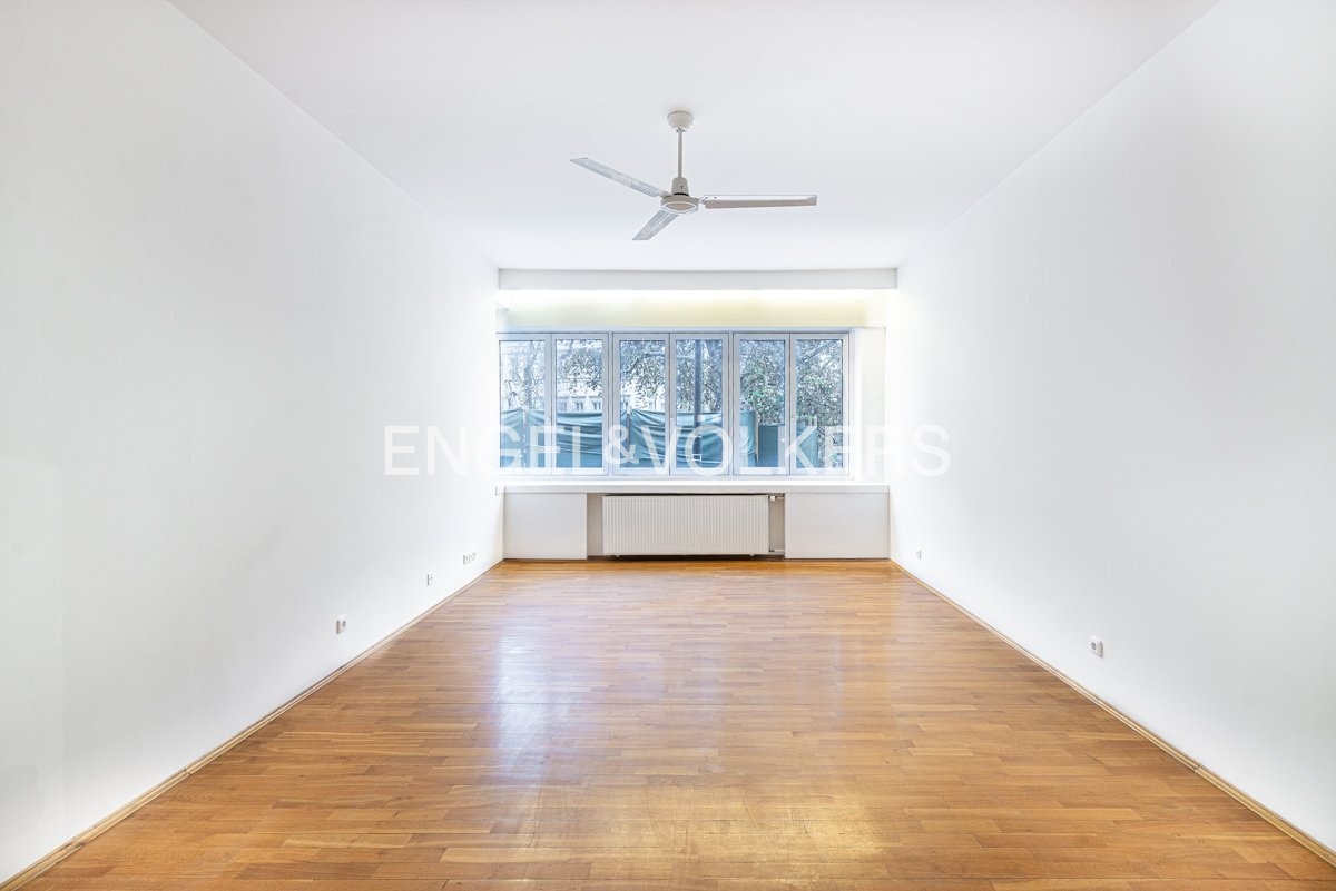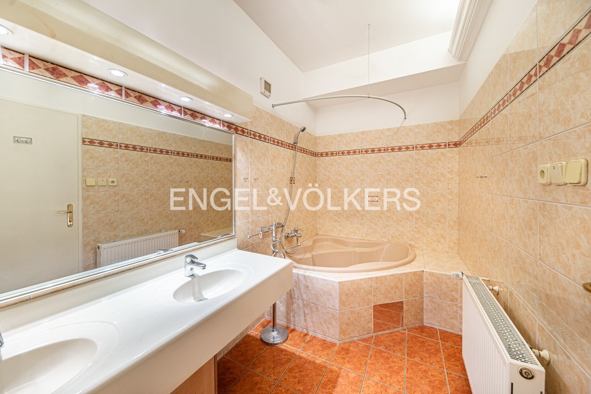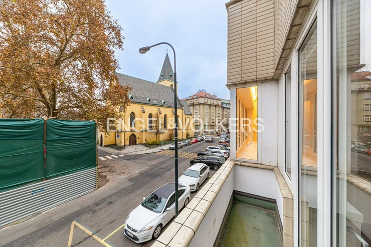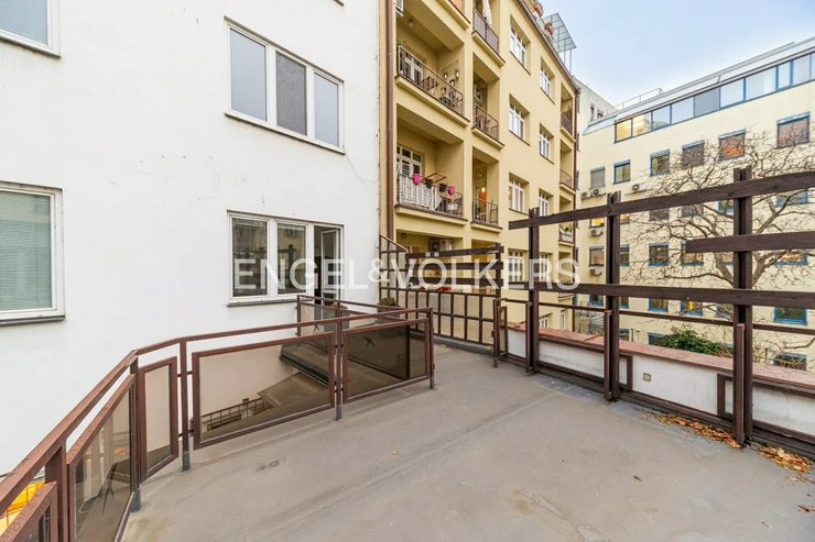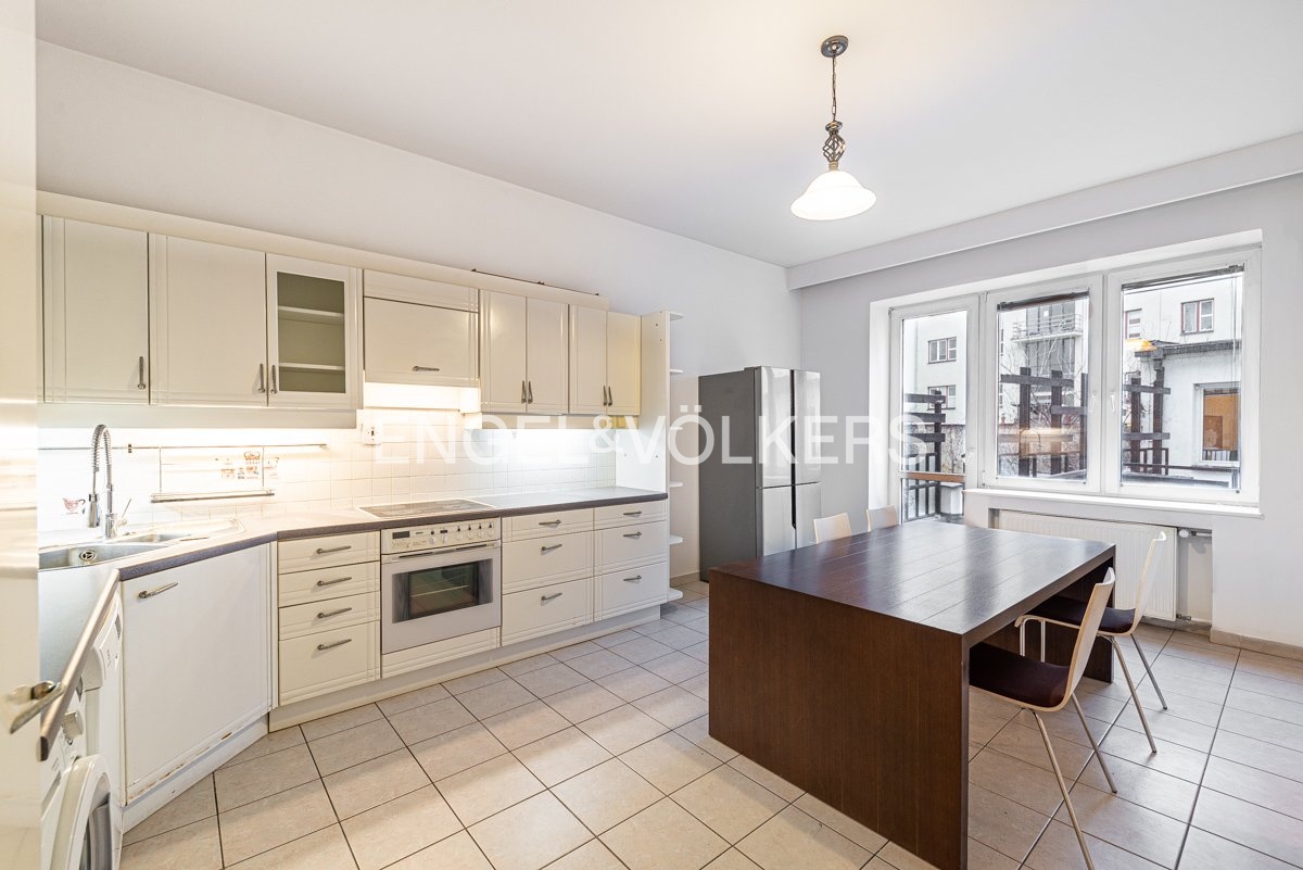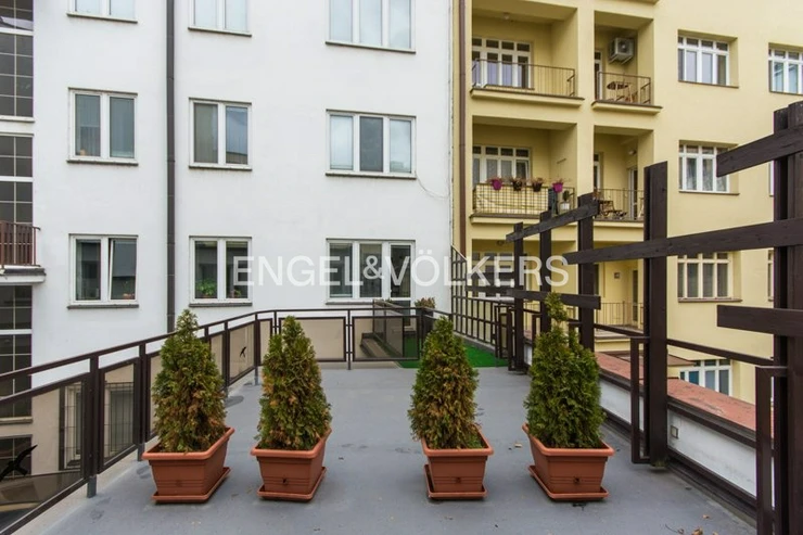 For immediate rent, we offer a generous apartment in a functionalist house in the centre of Prague. The apartment is located on the second floor of the residence with an elevator. It has a good layout. Upon entering, you will be impressed by the large entrance hall from which there is access to all rooms. All three rooms are impassable. There is a fully equipped kitchen including appliances and a washing machine. The apartment also offers two bathrooms, one with a bathtub, the other with a shower and two separate toilets. It is rented unfurnished with furniture. Two of the rooms have an exit to the balcony. The spacious terrace is accessible from the kitchen. The house has a reception and security 24/7. For the tenants of the house, there is a fitness room.