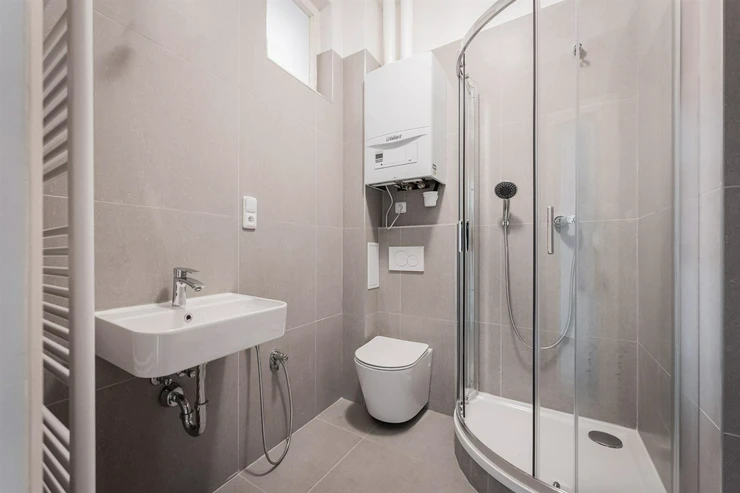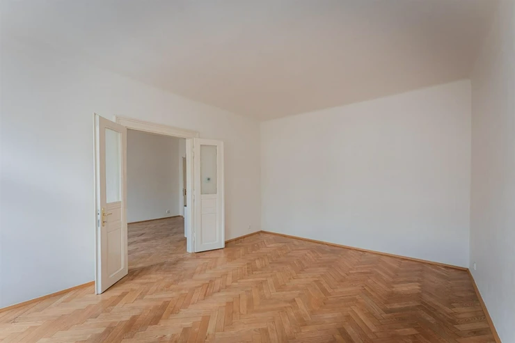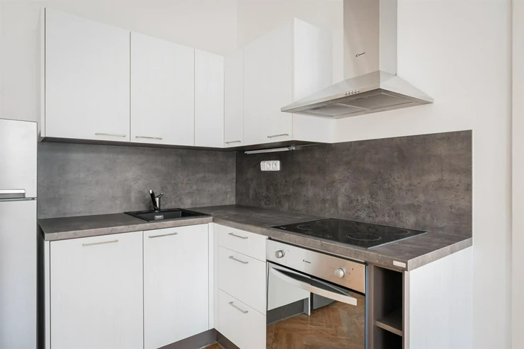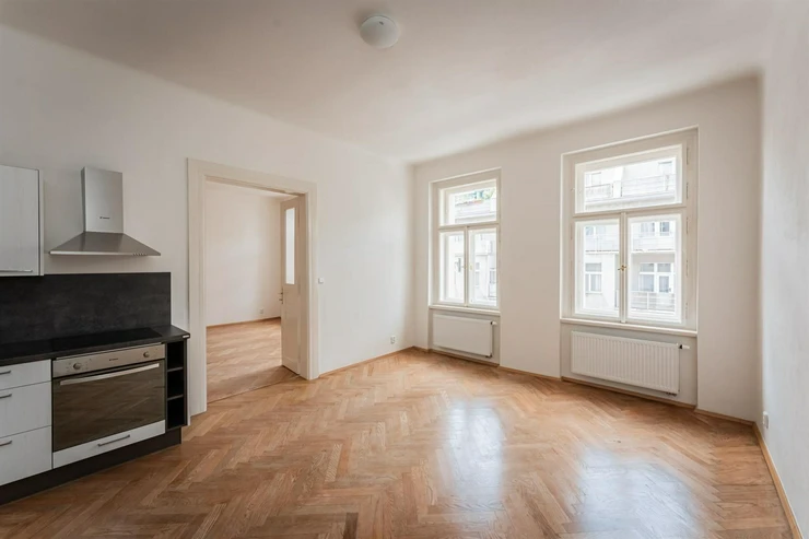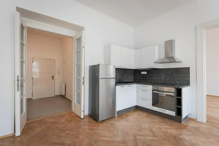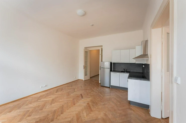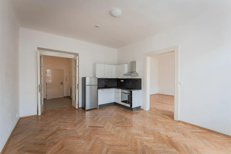 Renovated 2+kk apartment (total area of 44.29m2) is located on the elevated ground floor of a prestigious building with an elevator, in the popular area of Prague 2, Nové Město. The interior of the apartment is unfurnished and layout-wise offers an entrance hall (3.02m2), a bright living space with a kitchen (17.18m2). From the living area, there is access to a spacious bedroom (19.95m2). The kitchen is equipped with kitchen units including appliances: dishwasher, refrigerator with freezer, hob, and electric oven. The modern bathroom has a shower, toilet, and washing machine.