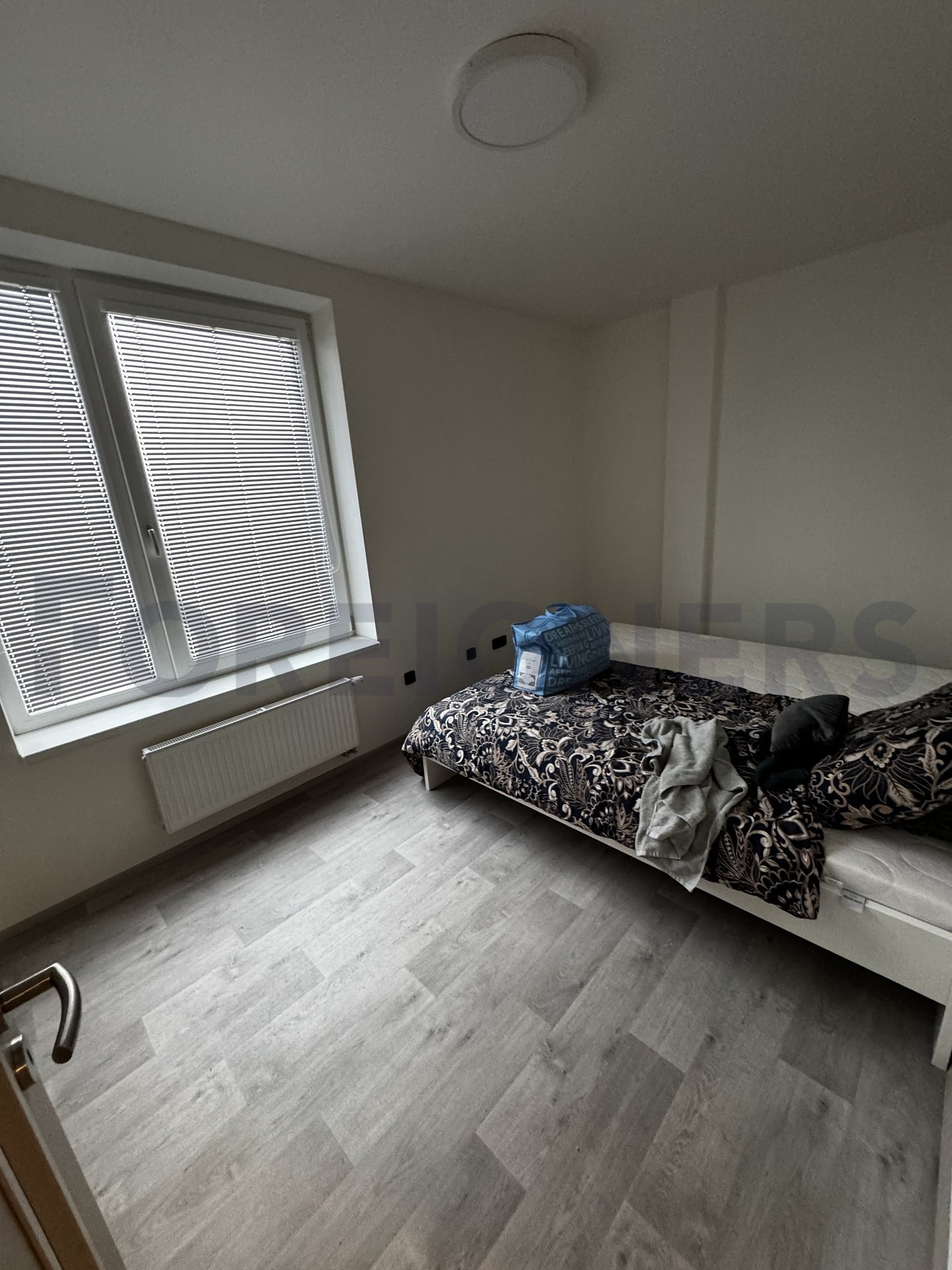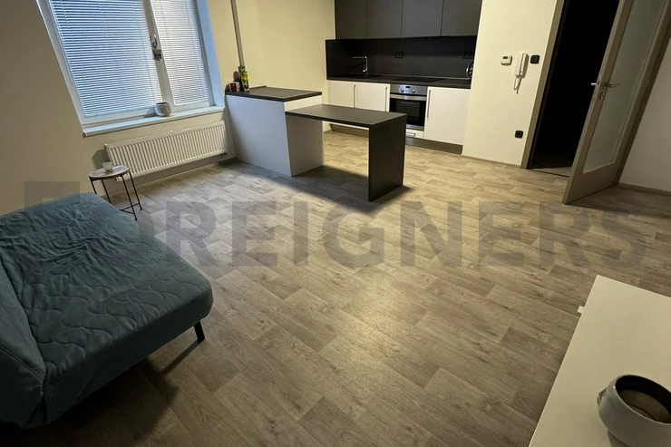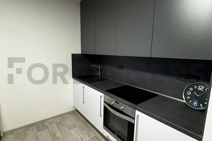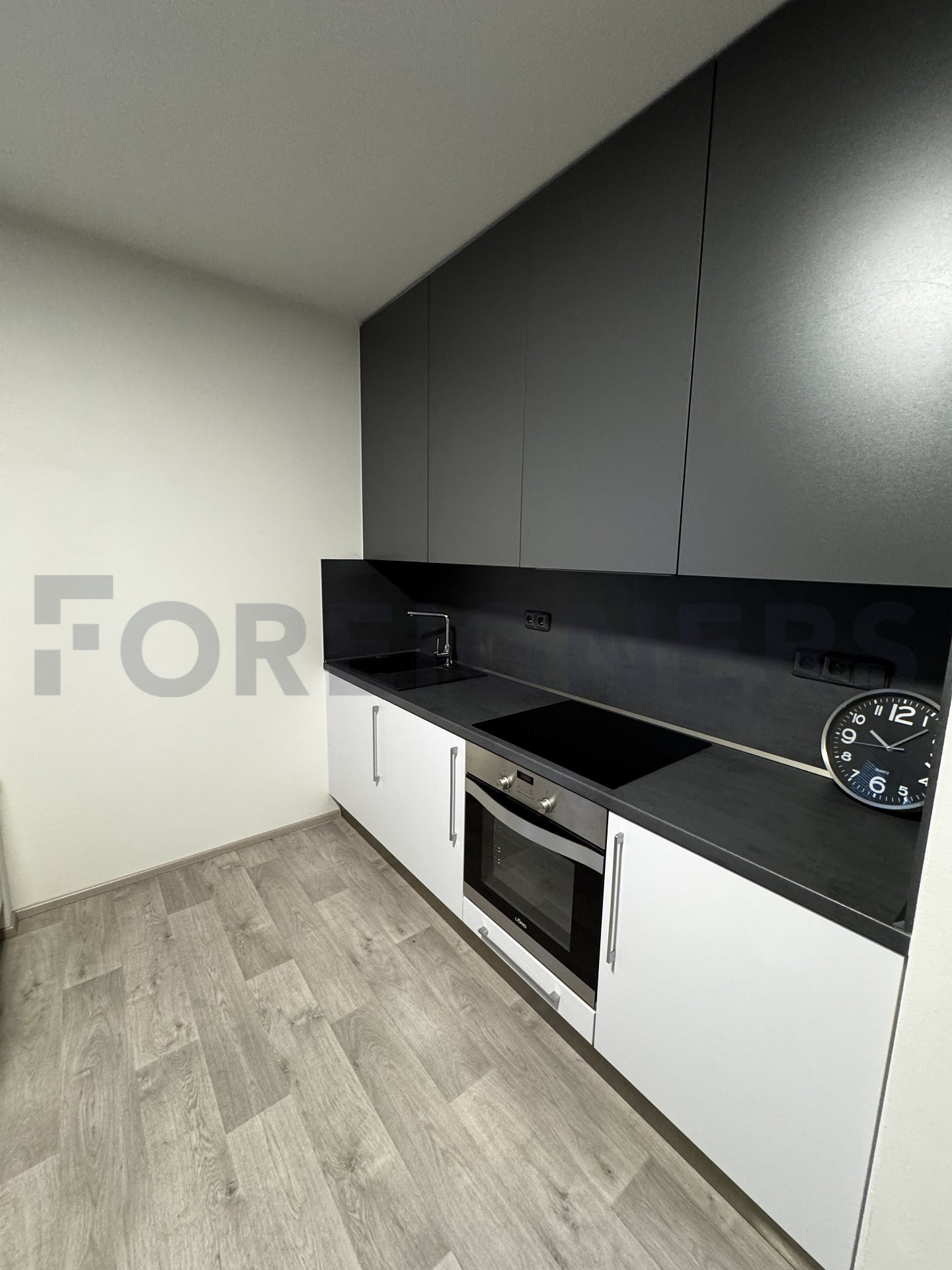 The apartment is partly furnished. We find a shoe-cabinet, a hanger in the hallway. The dressing room has a spacious wardrobe. In the kitchen, there are built-in appliances such as an oven, electric hob and fridge and there is situated kitchen bar. In the living room, there is a folding sofa bed, a closet and a small table.