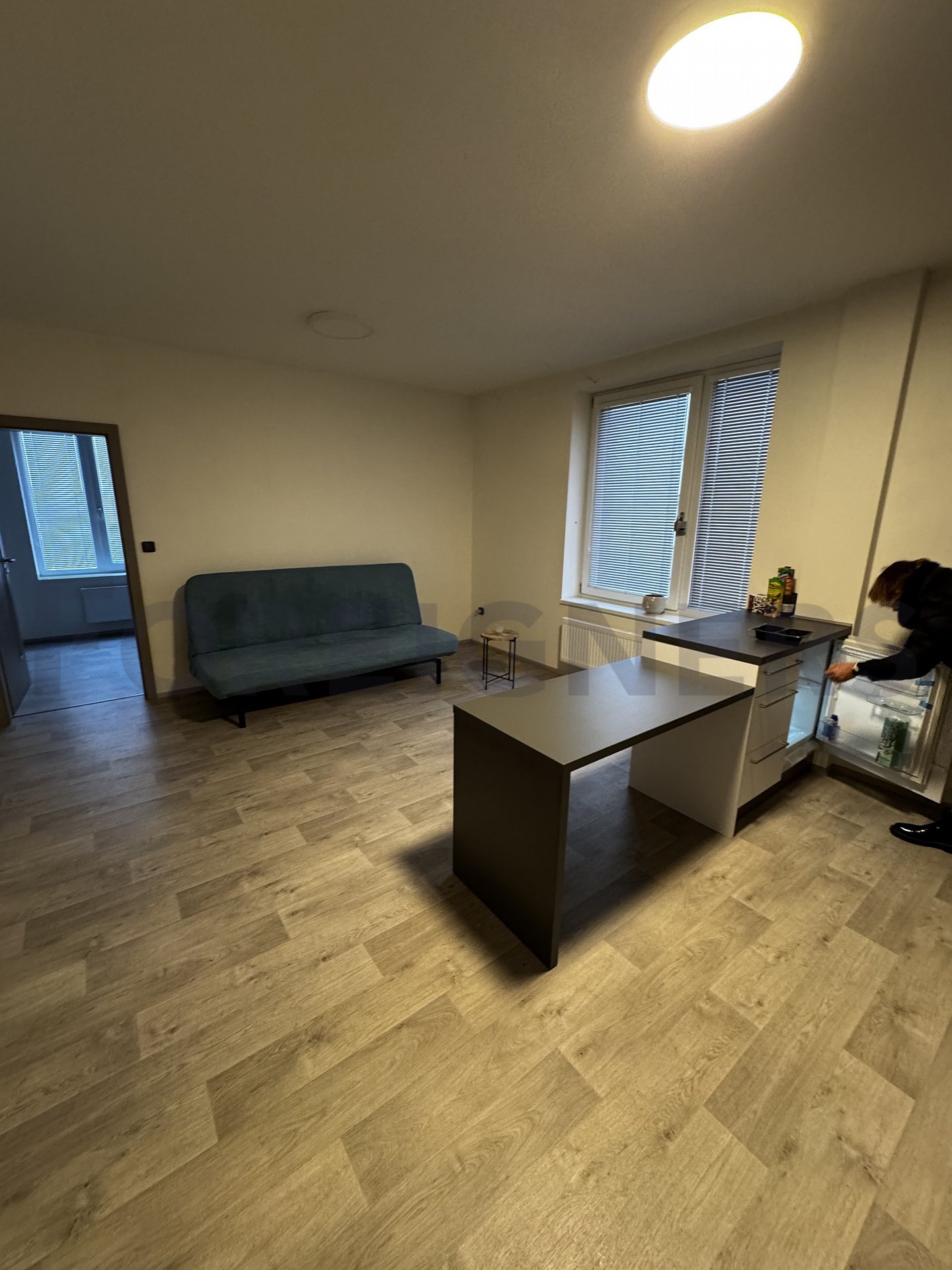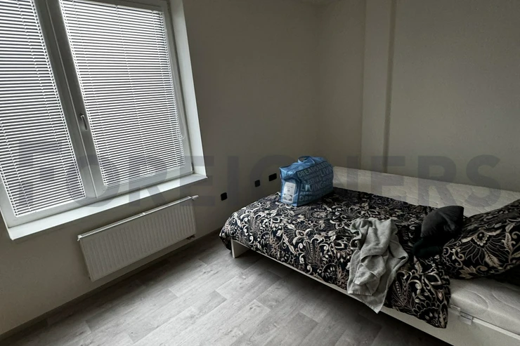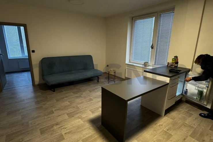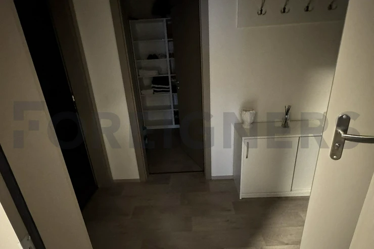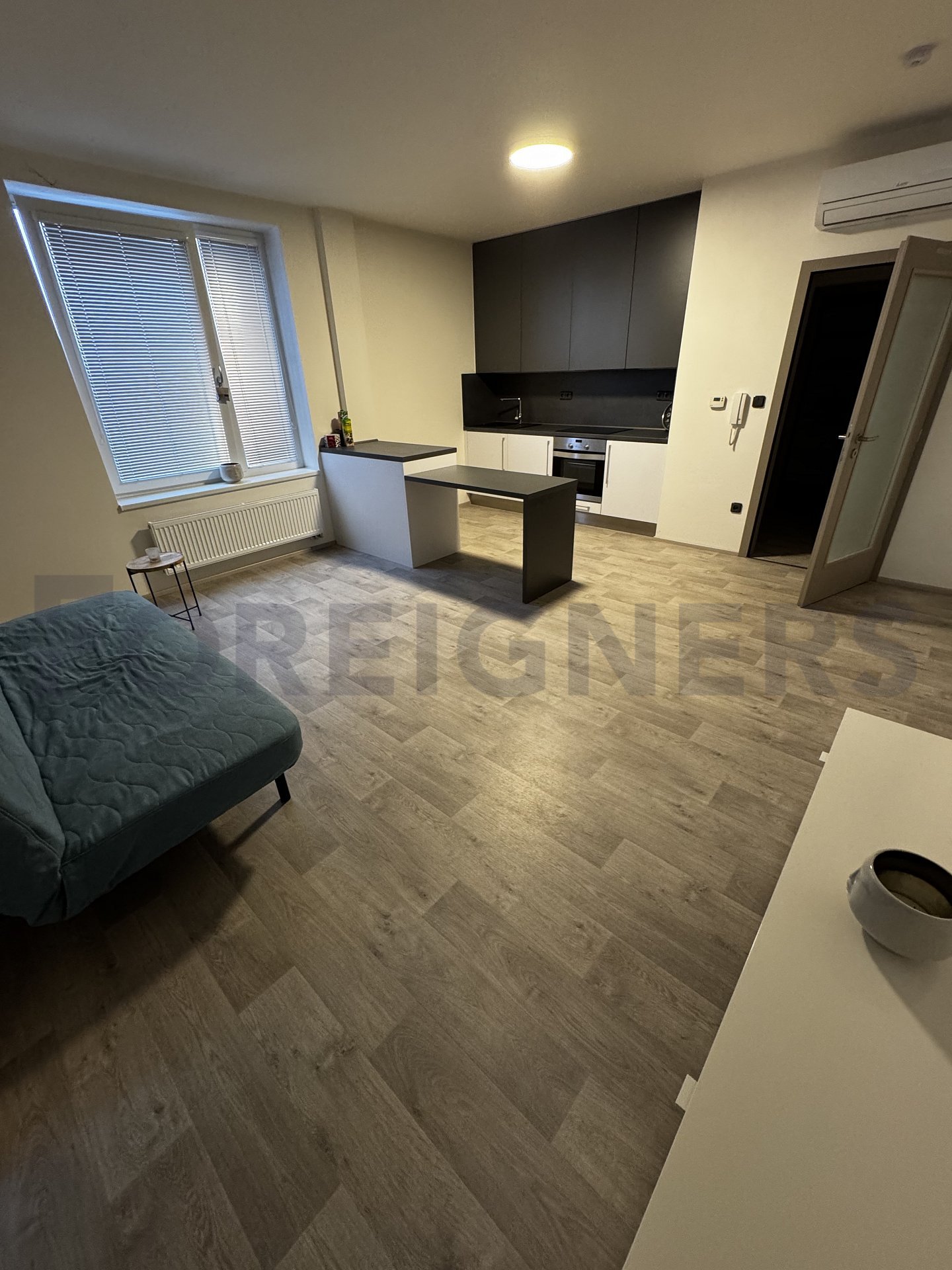 The apartment is partly furnished. We find a shoe-cabinet, a hanger in the hallway. The dressing room has a spacious wardrobe. In the kitchen, there are built-in appliances such as an oven, electric hob and fridge and there is situated kitchen bar. In the living room, there is a folding sofa bed, a closet and a small table.