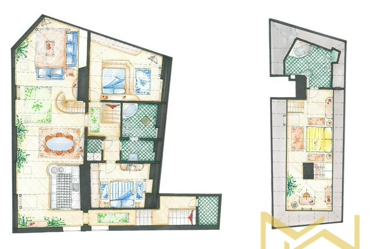 The lower level of the apartment comprises an entrance hall, a spacious living room with a dining area, a kitchenette, two bedrooms, one bathroom (with a bathtub, sink, bidet and toilet) and two storage rooms. A staircase from the living room leads to the upper level, where you’ll find the main bedroom with a private bathroom (featuring a bathtub, sink, bidet and toilet). The apartment is equipped with a kitchen including a ceramic hob, range hood, dishwasher and electric oven; built-in wardrobes; connections for a washer and dryer; preparation for high-speed internet; wooden floors and tiling.