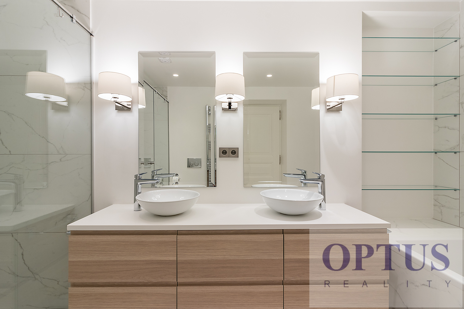 Unfurnished unique luxurious apartment 5 + kitchen corner (in total of 192 m2) + balcony facing a courtyard, just completely renovated to the highest standard with top quality material and equipment; situated on the 4th floor with elevator in an Art Nouveau house 100% free of short-term accommodation.