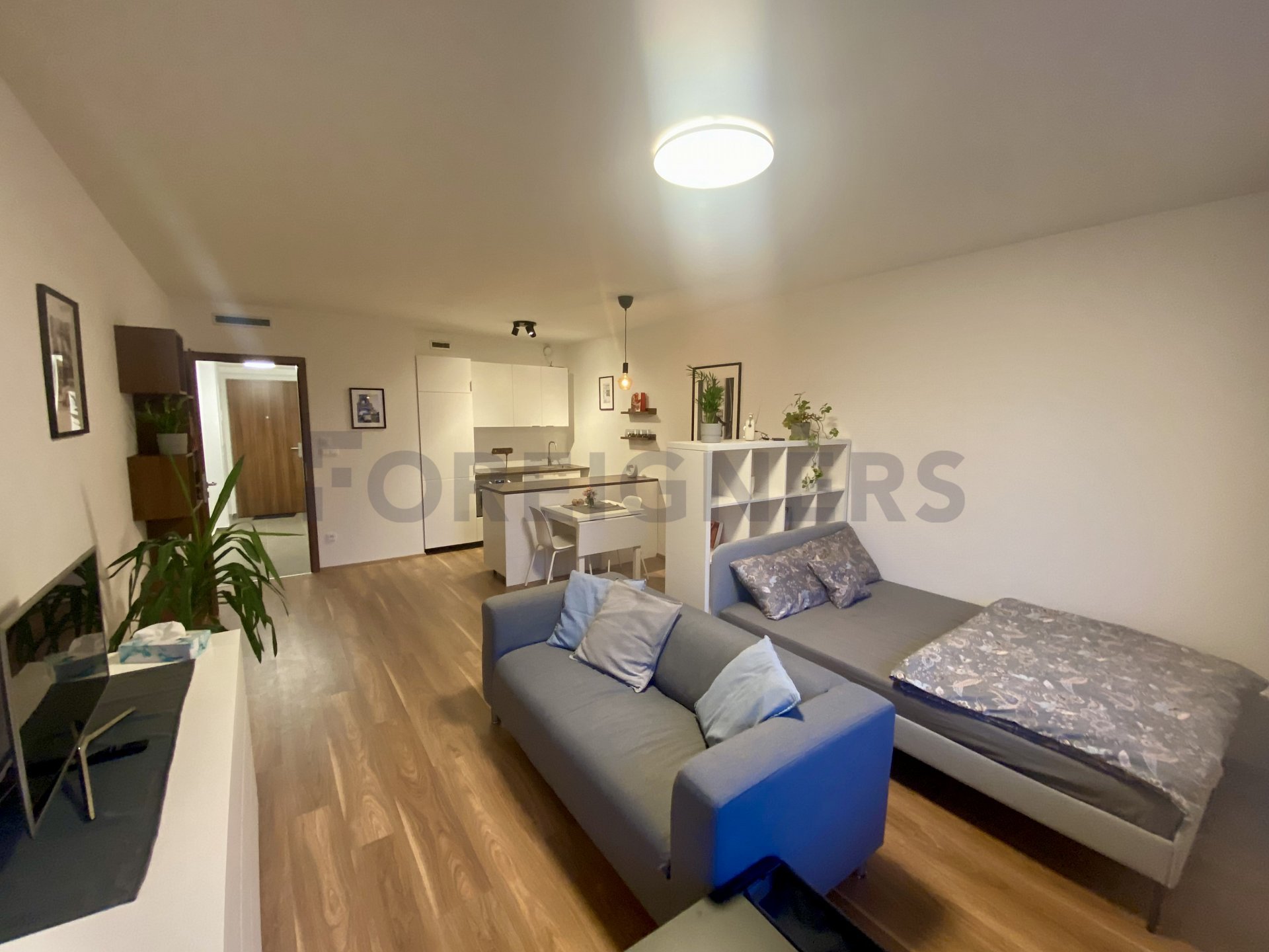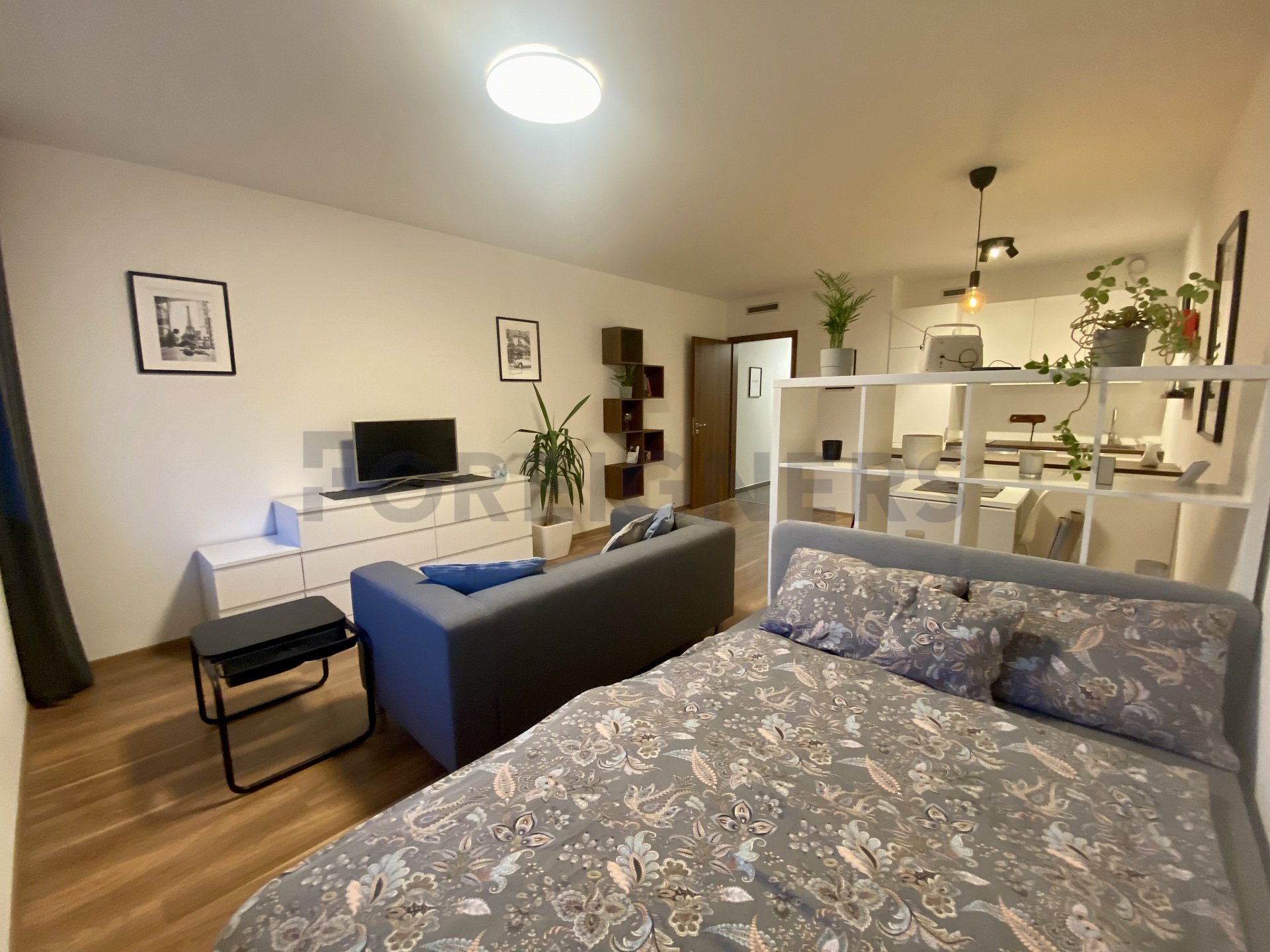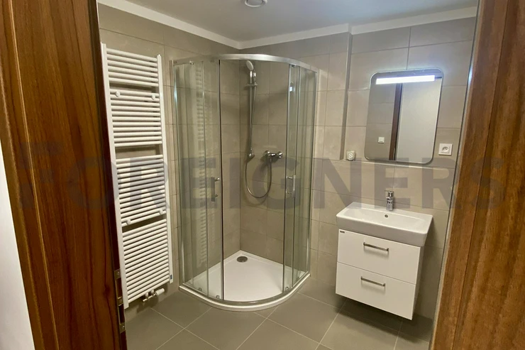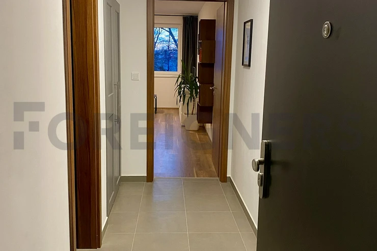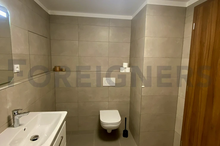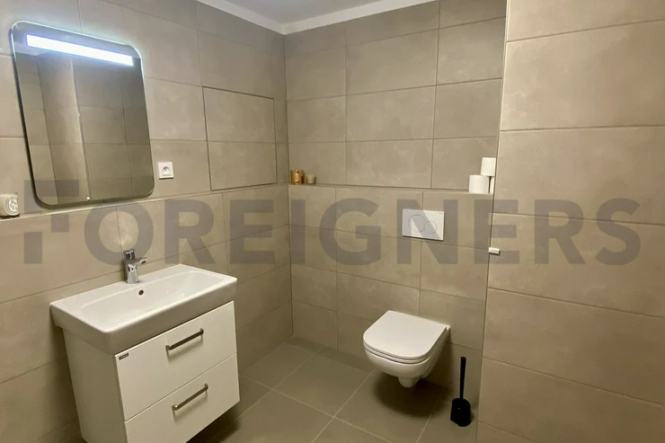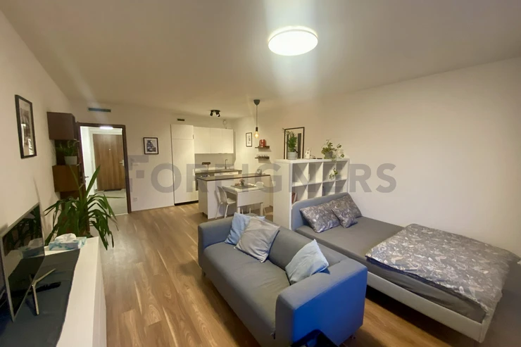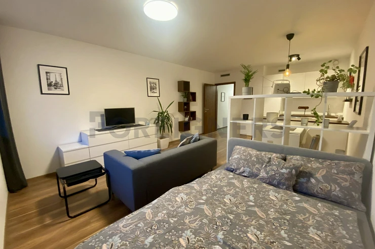 This apartment is offered as fully furnished and it is very tastefully furnished in modern, french style. There is a modern bed with sofa, tv stand with tv, bookshelves and small conference table in the bedroom. Kitchen corner consists of table with 2 chairs, fridge with freezer, dishwasher, electric cooker with oven and microwave oven. In the main hall we can find a wardrobe with shoe cabinet and bathroom with a shower corner is equipped with the washing machine + dryer. Vacuum cleaner is as well available.