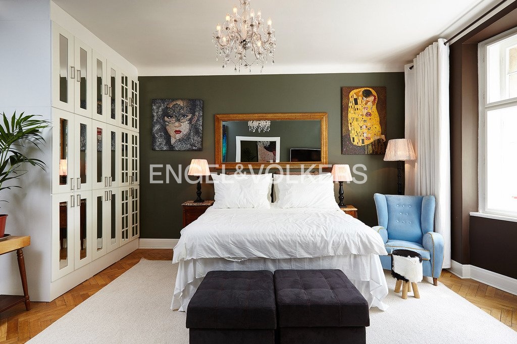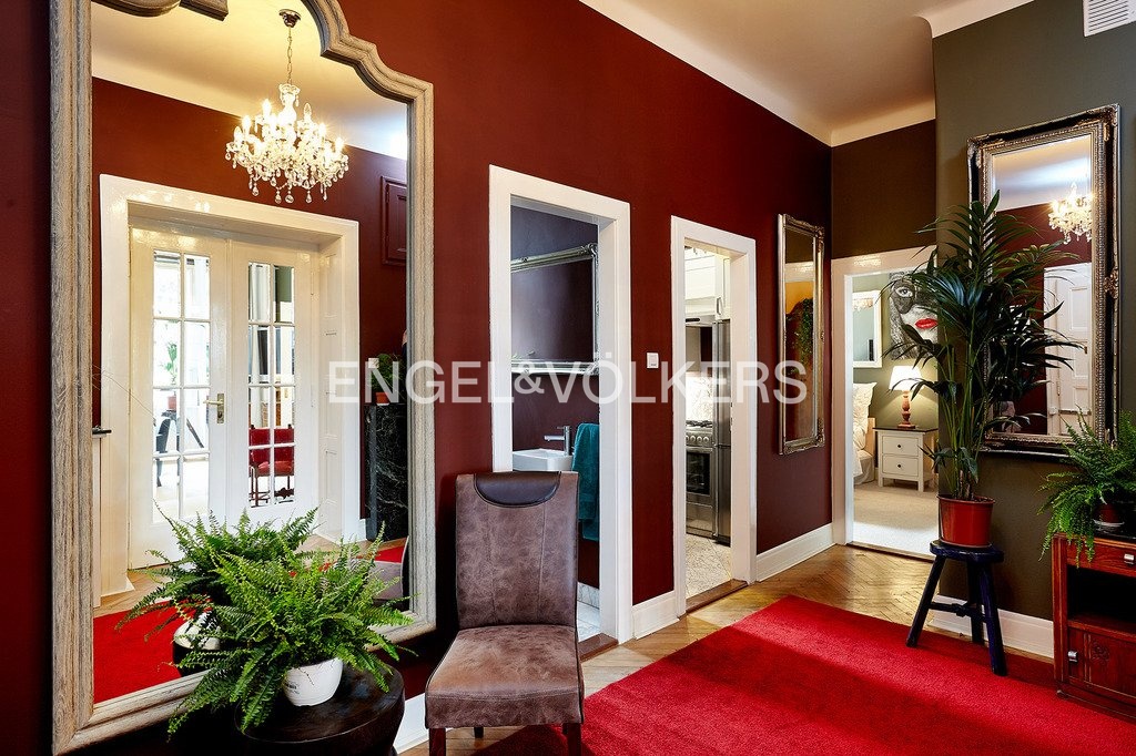 High ceilings, large wooden windows and luxurious massive furniture are the dominant features. The apartment has two spacious bedrooms, a dining room and a fully equipped kitchen with a dishwasher, microwave, stove and fridge with freezer. The bathroom is equipped with a bathtub with shower screen, toilet, sink and mirror. The apartment is fully furnished with furniture, possibility of renting unfurnished. Very high quality materials are used here, such as high quality wood and luxurious additional decorative items.