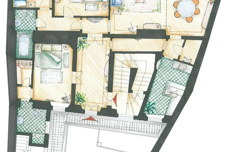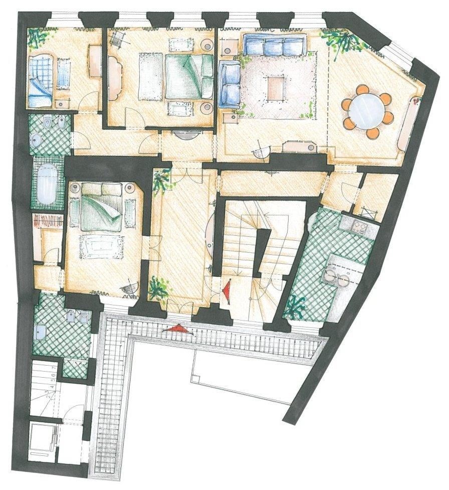 The partially furnished apartment (3 bedrooms, 2 bathrooms) has a spacious entrance hall, with 2 bedrooms and a bathroom (bathtub, sink, toilet, bidet) located on the left side. The living room is separated from the hall by antique doors. The apartment also includes a modern kitchen equipped with built-in appliances (refrigerator, stove, microwave, dishwasher), which also includes a large pantry. Additionally, there is another bedroom and a separate bathroom (shower, sink, toilet, bidet) in the apartment. Entry to the apartment can be gained either via a private front garden or directly from the elevator.