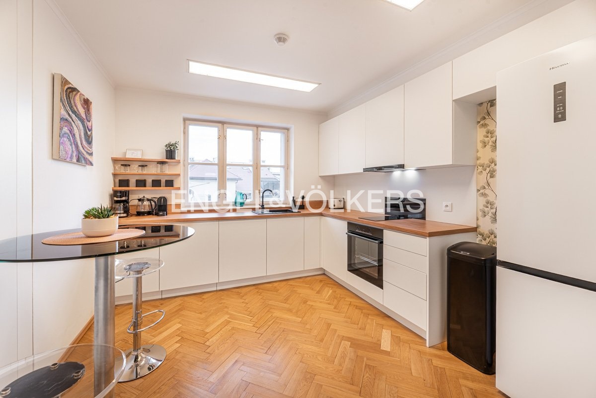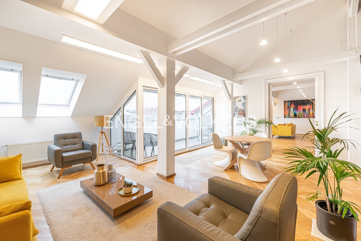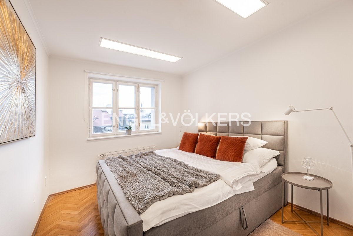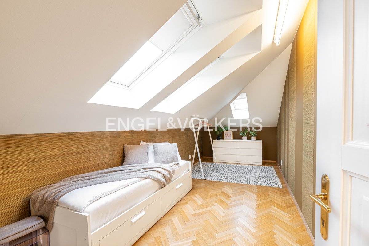 An exceptional 4+1 apartment in an original apartment building with an elevator, situated at a prestigious address in the heart of the Lesser Town, is ready for long-term rent. Thanks to its location on the top floor and skylights, the apartment is exceptionally bright and airy. A great benefit is the private terrace with breathtaking views of the National Theatre, Masaryk Embankment and the historic centre of Prague.