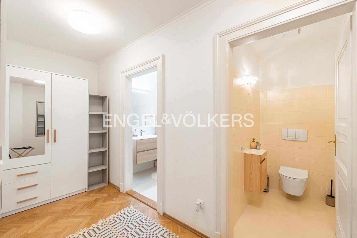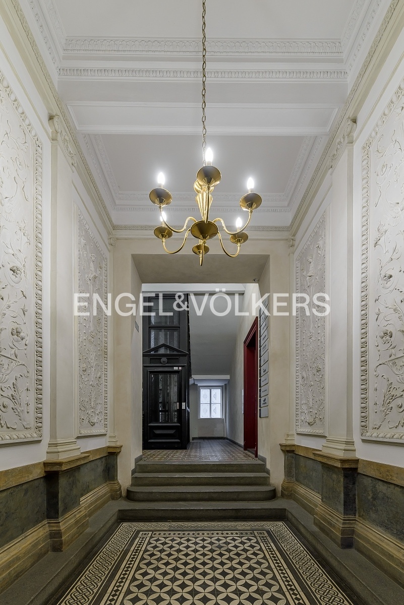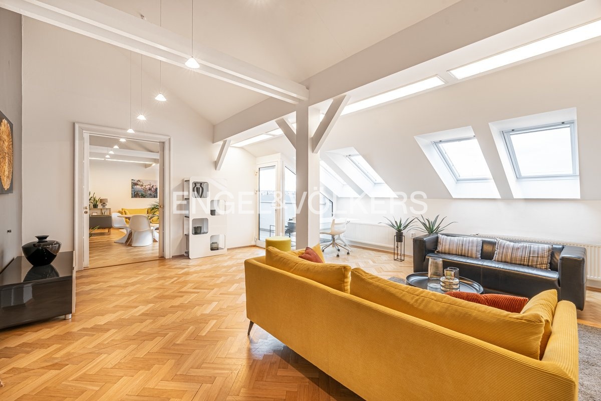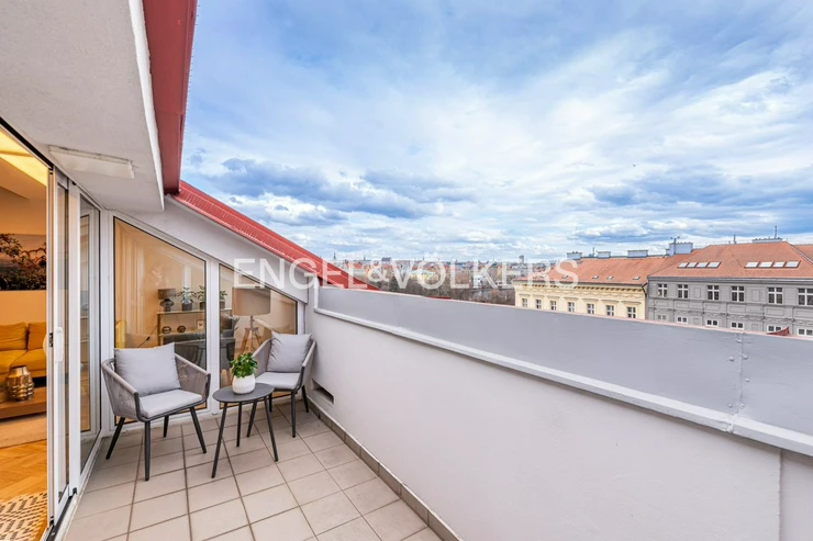 An exceptional 4+1 apartment in an original apartment building with an elevator, situated at a prestigious address in the heart of the Lesser Town, is ready for long-term rent. Thanks to its location on the top floor and skylights, the apartment is exceptionally bright and airy. A great benefit is the private terrace with breathtaking views of the National Theatre, Masaryk Embankment and the historic centre of Prague.