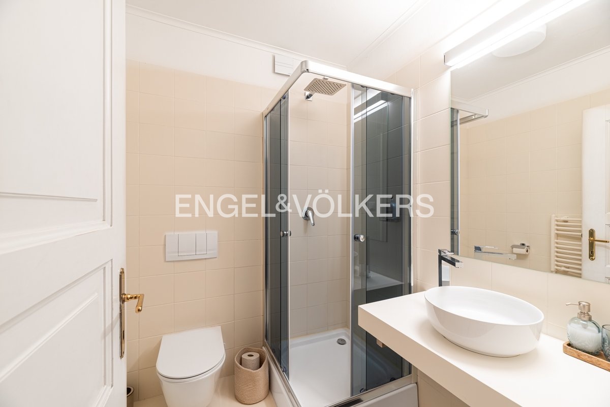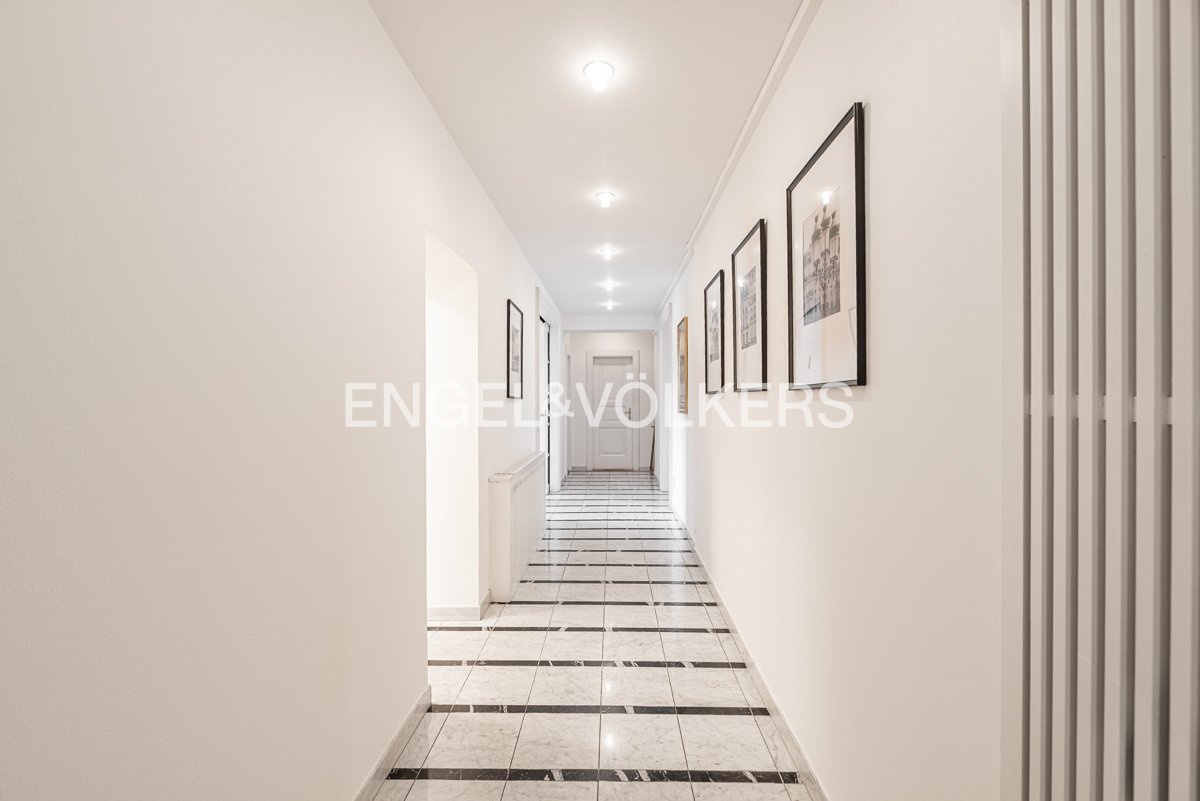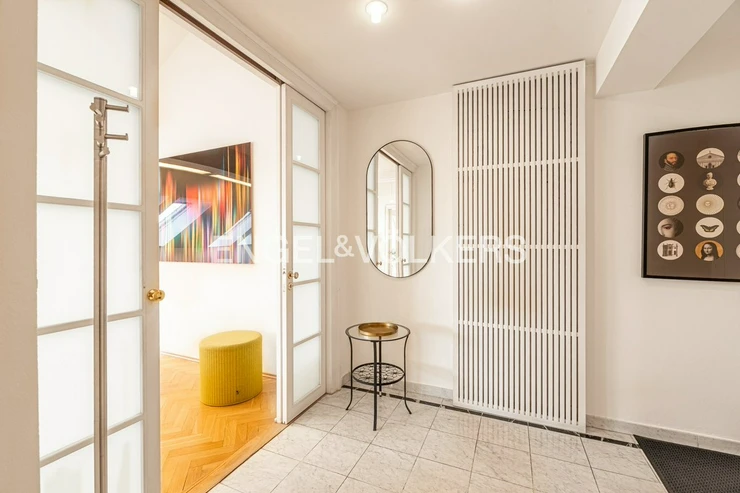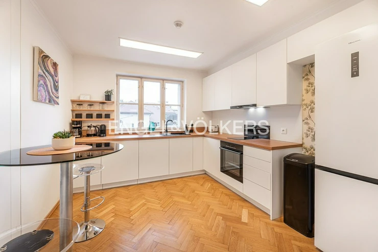 The layout of the apartment includes two spacious dominant rooms connected by elegant sliding doors, which allow for a variable arrangement of space. There are also two smaller rooms, one of which faces the quiet courtyard and is ideal as a bedroom or study. The separate kitchen is spacious enough and equipped for comfortable cooking. The apartment has two bathrooms, a separate toilet and a practical utility room.