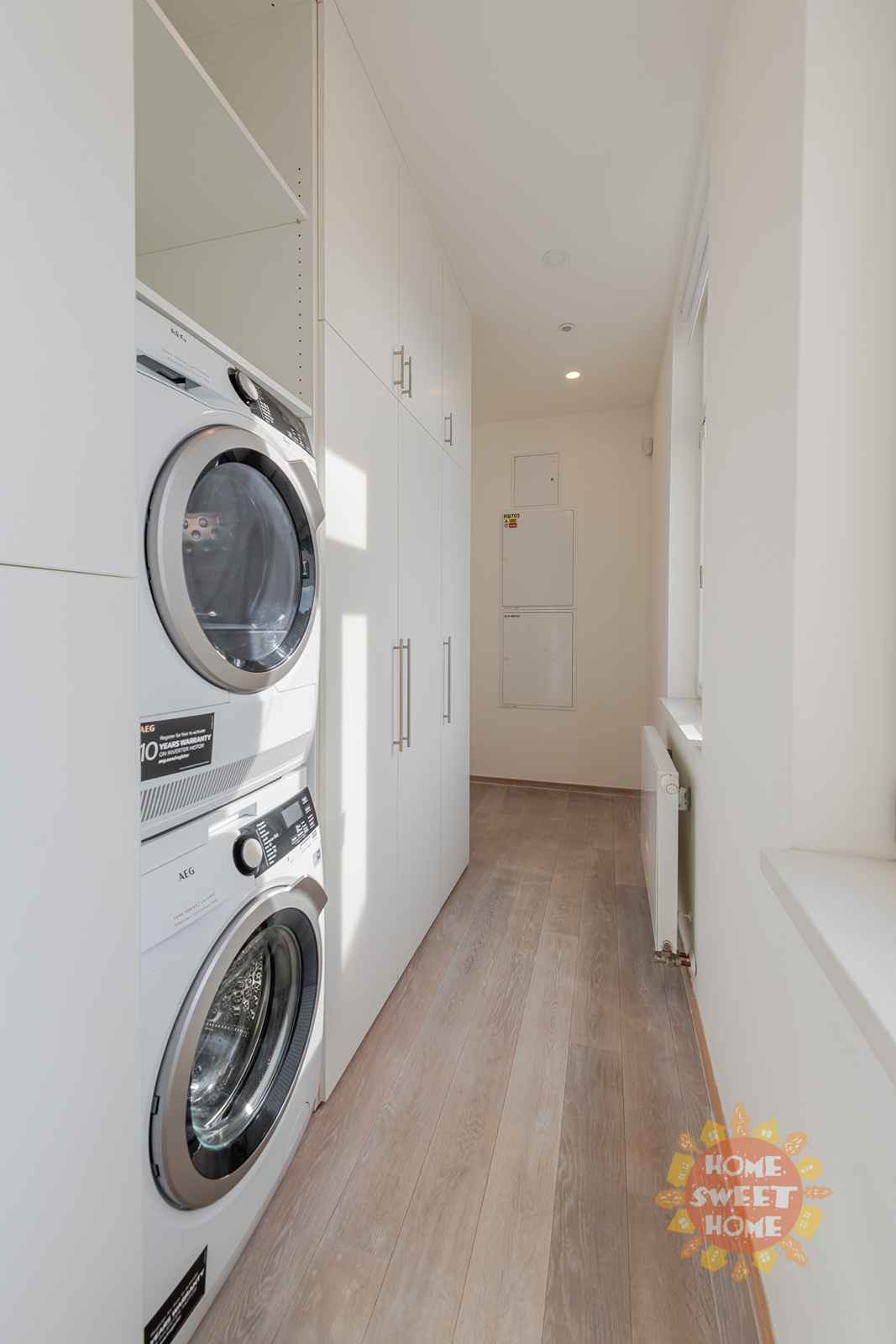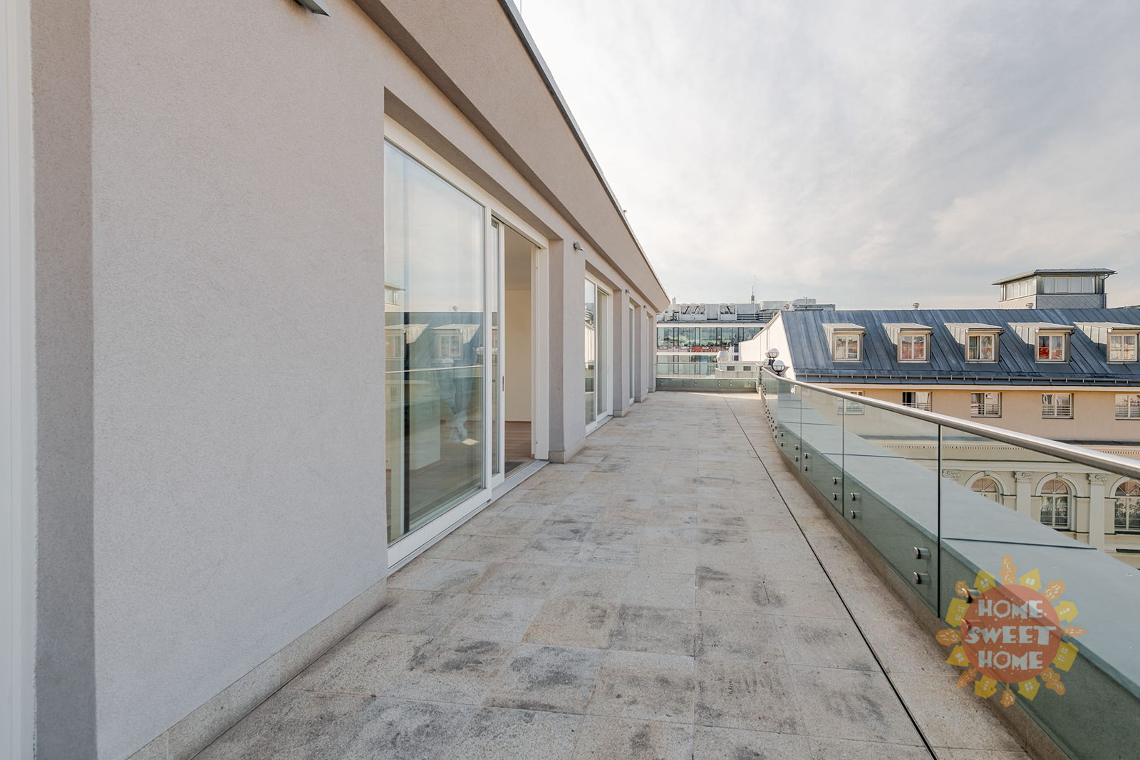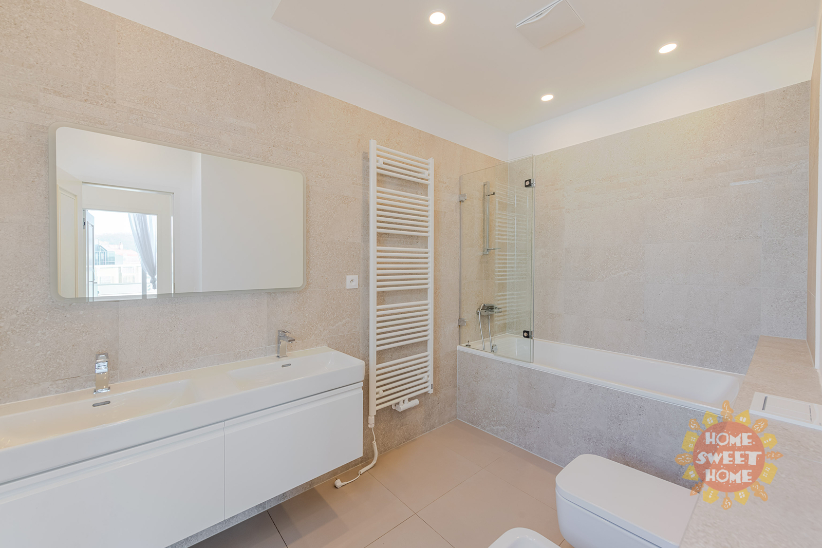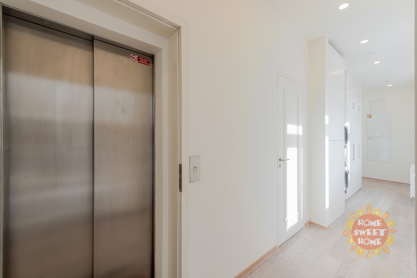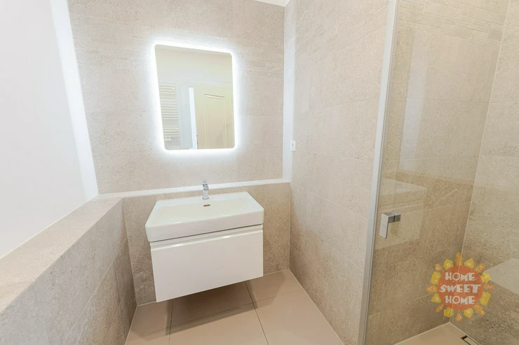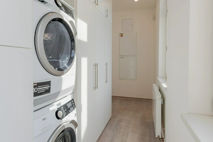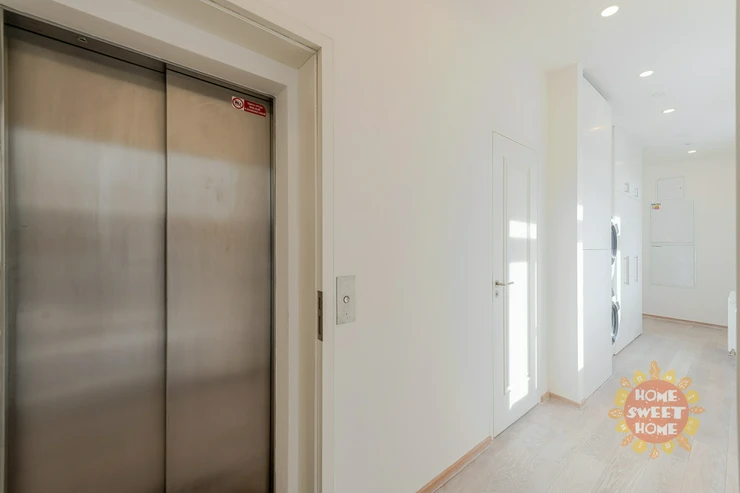 entrance hall with built-in wardrobes, washing machine and dryer, spacious living room, two separate bedrooms with built-in wardrobes, separate kitchen equipped with all appliances (fridge, induction hob, electric oven, refrigerator and dishwasher), 2 bathrooms (one bathroom with bathtub, shower, bidet and toilet, the second bathroom with shower), another separate toilet and a terrace along the entire length of the apartment. Other equipment of the apartment: wooden floors, tiles, security doors, alarm and air conditioning.