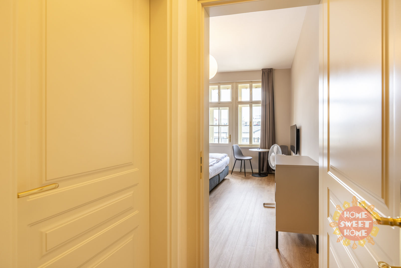 Modern furnished apartment 1+kt after complete reconstruction with a total area of 23 square meters with a balcony is located on the fourth floor of a brick building with an elevator in a newly renovated house from 2021 in the street Opletalova, New Town. Housing is located in a very popular location, about 100 meters from Wenceslas Square.
