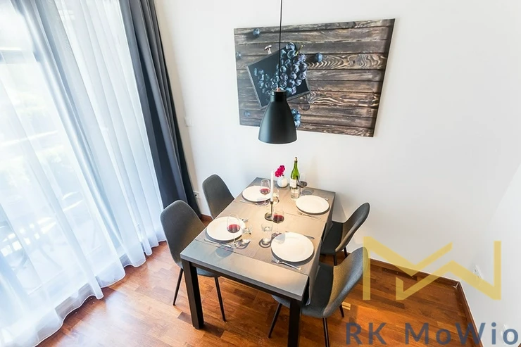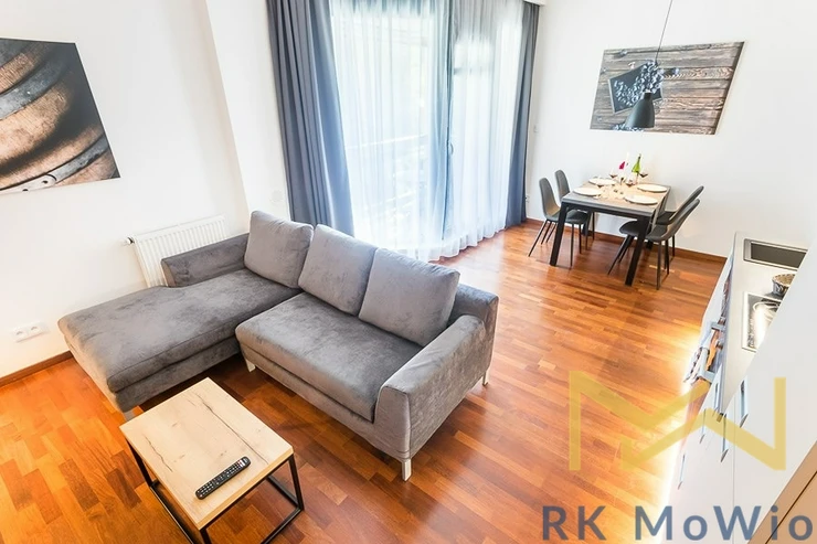 The apartment consists of an entrance hall, a spacious living room with access to the balcony, a kitchen nook and dining area, 1 bedroom, 1 bathroom (with a shower and sink) and a separate toilet. The apartment is equipped with a kitchen (including a refrigerator with a freezer, ceramic cooktop, extractor hood, dishwasher, electric oven and microwave), built-in wardrobes, a washing machine, preparation for high-speed internet, wooden floors and tiles. There is an option to rent a parking space for an additional fee. The photos are illustrative.