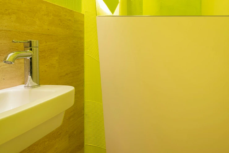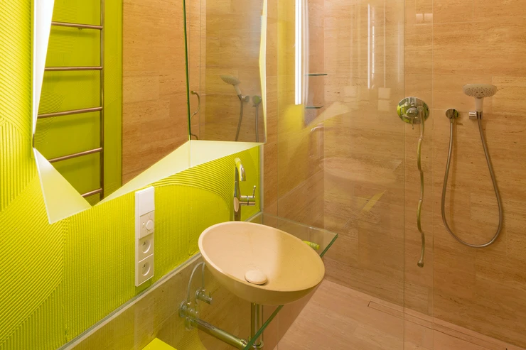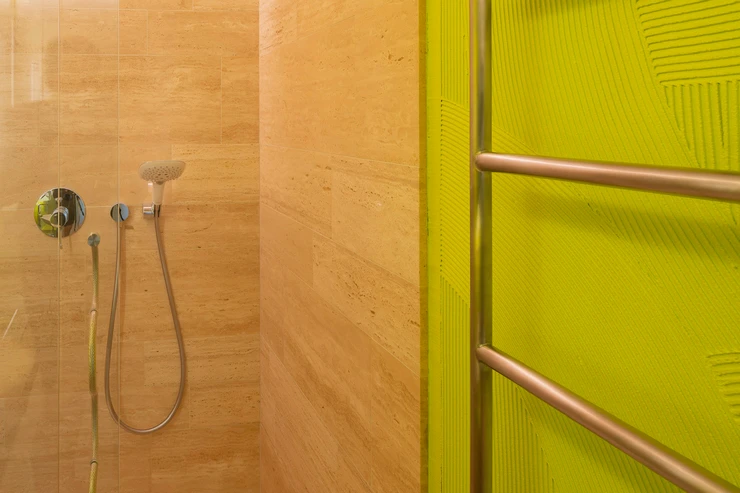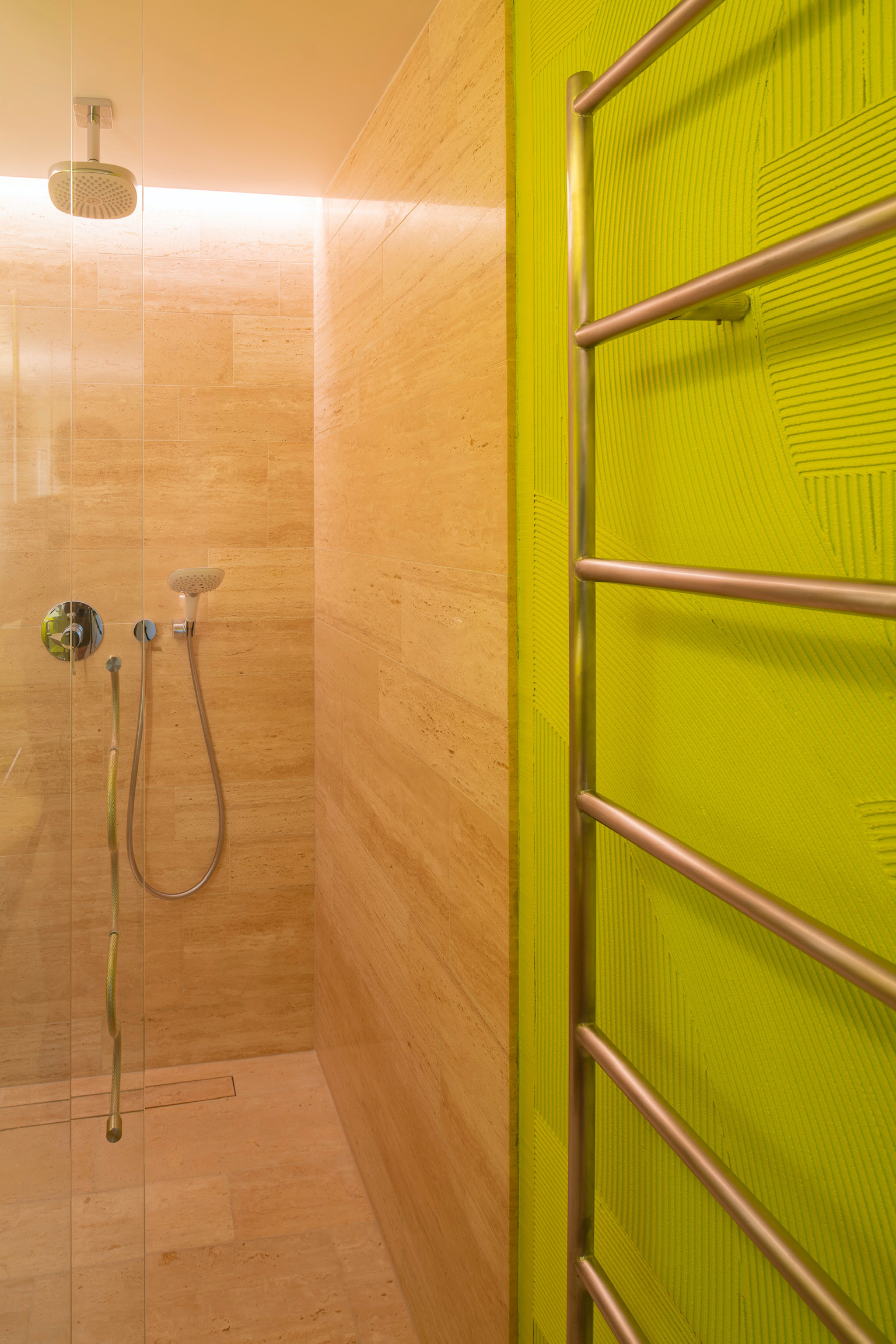 The bathroom and toilet are finished in Travertine stone tiles. The bathroom is equipped with underfloor heating, shower, heated towel rail. The toilet is equipped with bidet shower.