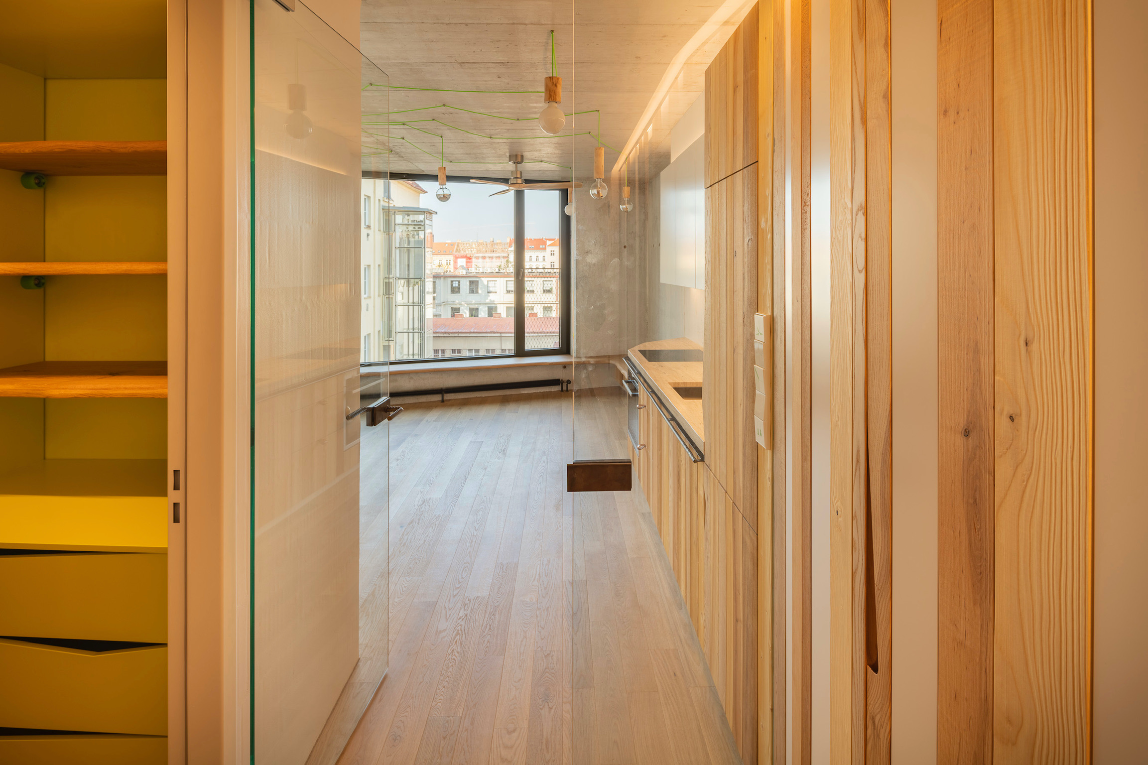 The apartment is quiet, oriented to the courtyard. It offers plenty of storage space in the form of built-in wardrobes in the hallway and bedroom, a dressing room adjacent to the bathroom, equipped kitchenette (fridge, freezer, dishwasher, microwave, hot-air oven, cooker hood with ventilation), powerful fan in the living area, oak floors, design elements (handles, lights, handles), security doors. High quality natural materials are used in all parts of the apartment. In both living rooms there are sockets for telephone/internet/TV connection.
