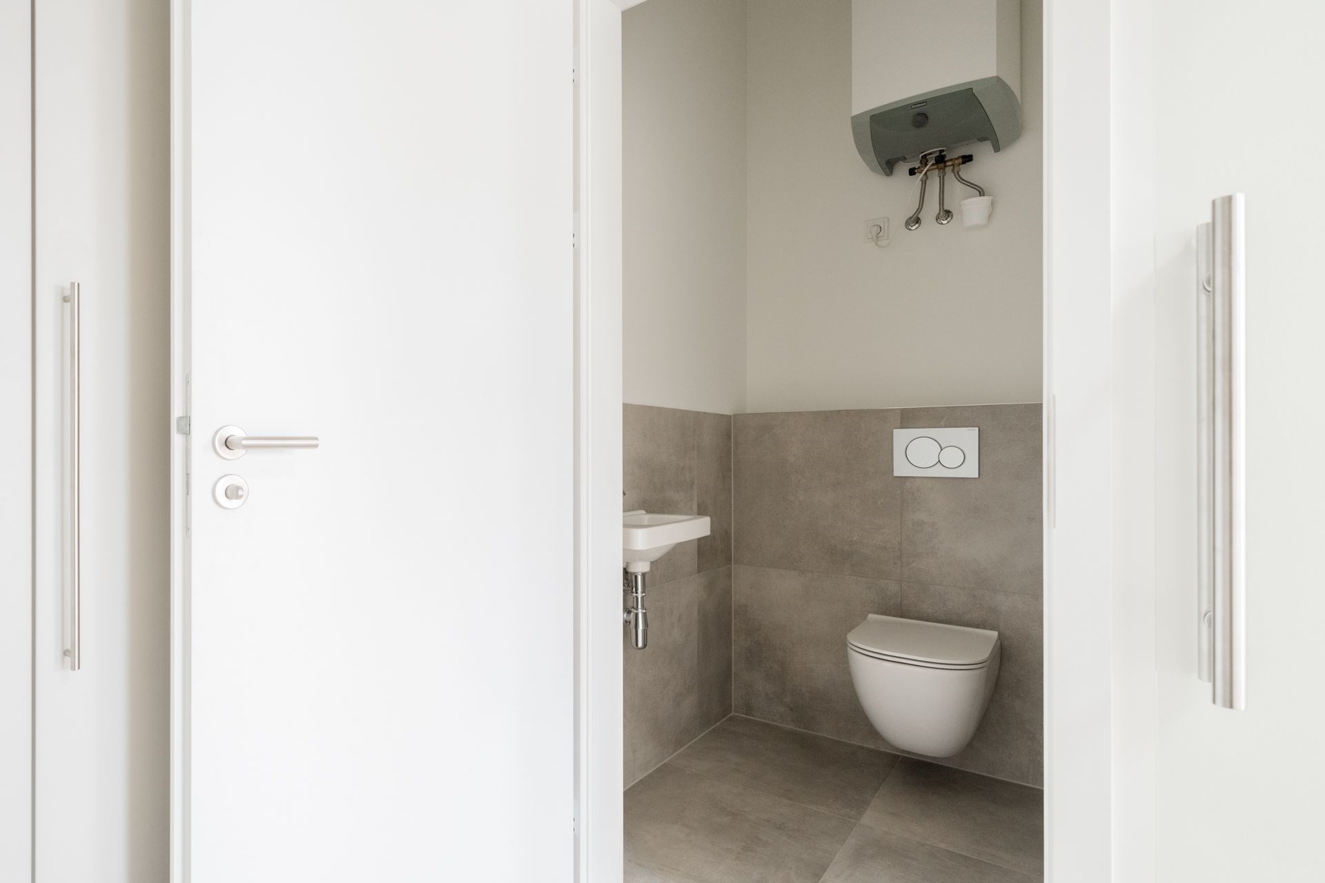 The interior of the apartment is partially furnished, and the living space consists of an entrance hall (5.19m²) with a built-in wardrobe, leading into a spacious living room (46.03m²) combined with a kitchen area, equipped with modern appliances (cooktop, oven, built-in refrigerator with freezer, and dishwasher). From the living room, you enter the bedroom (17.65m²) with a built-in wardrobe and a modern bathroom (7.49m²) with a shower and toilet, and another separate toilet accessible from the hallway. There is an option to equip the apartment with a washer/dryer. Floors: vinyl and ceramic tiles. Heating in the apartment: underfloor. The apartment has a cellar. There is also a bicycle and stroller storage room.