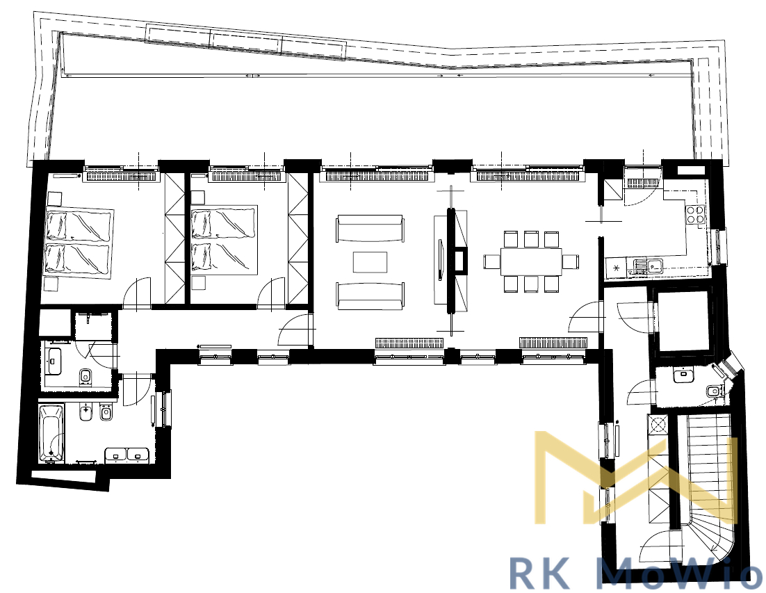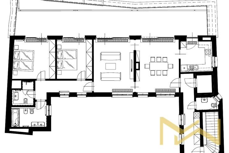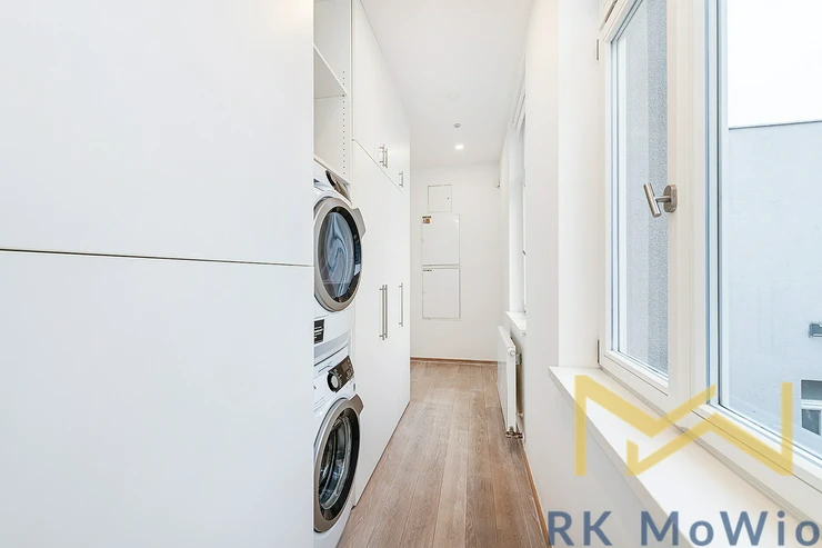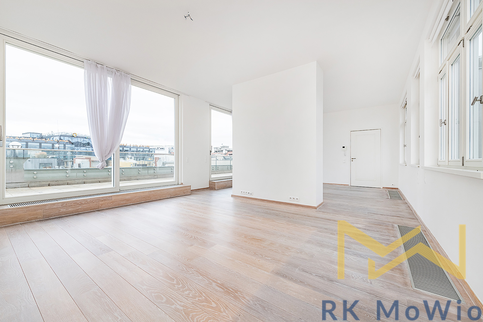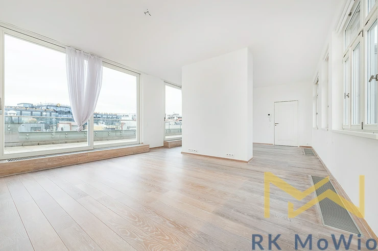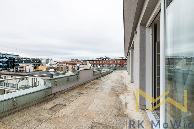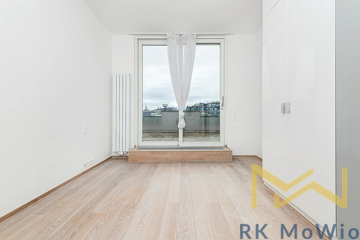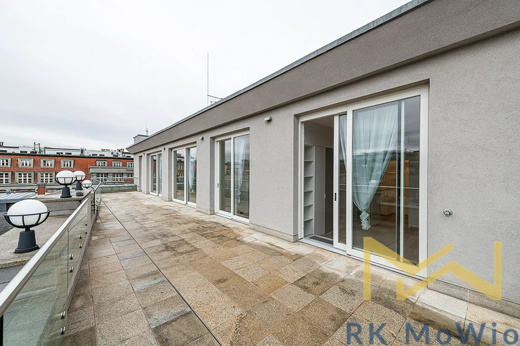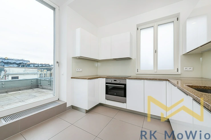 For rent, we offer apartment no. 7.03, unfurnished, with a layout of 2 bedrooms, featuring a floor area of 116.76 sqm and a terrace of 56.66 sqm. The apartment is located on the 6th floor (7th above-ground level) of a renovated industrial building with an elevator, on Jungmannova Street in the sought-after area of Praha 1 - Nové Město.