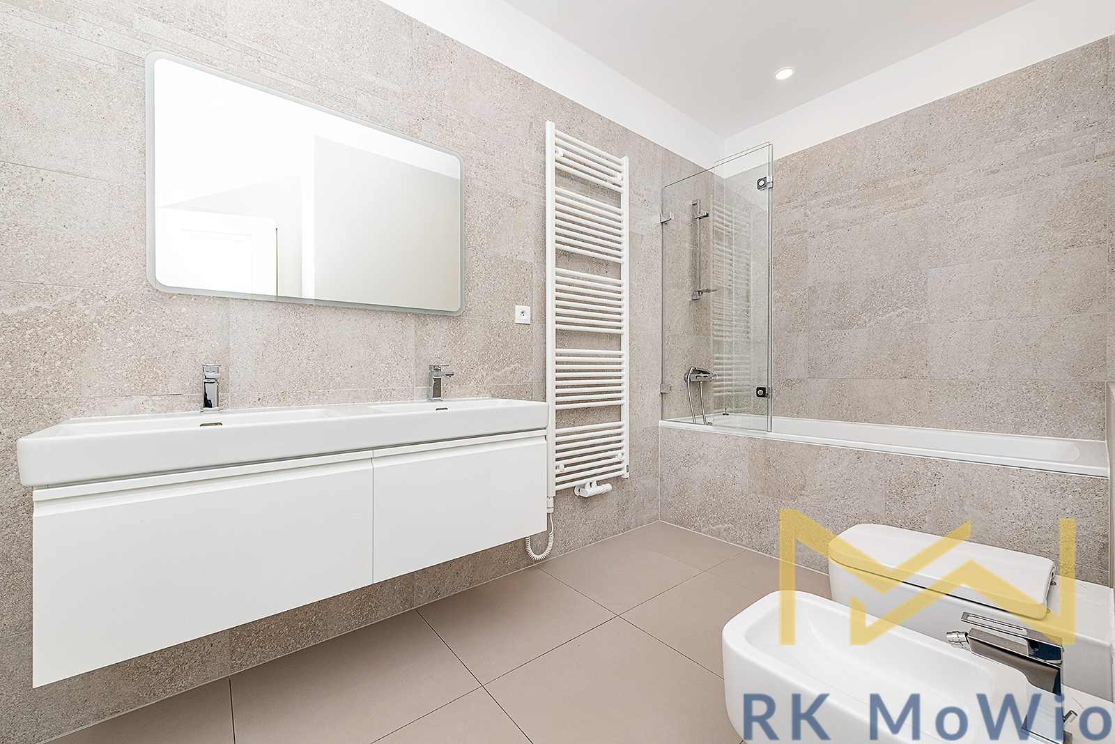 The apartment layout includes an entrance hall, a spacious living room, a dining room, a separate kitchen, a master bedroom, a second bedroom, two bathrooms (one with a bathtub, double sinks, a bidet and a toilet; the other with a shower, sink and toilet), a storage room and a guest toilet. Apartment equipment includes a kitchen unit with a refrigerator and freezer, induction hob, extractor hood, dishwasher, electric oven, microwave; built-in wardrobes, washing machine, dryer, air conditioning, gas central heating, building entry via keycard, wooden floors and tiles.