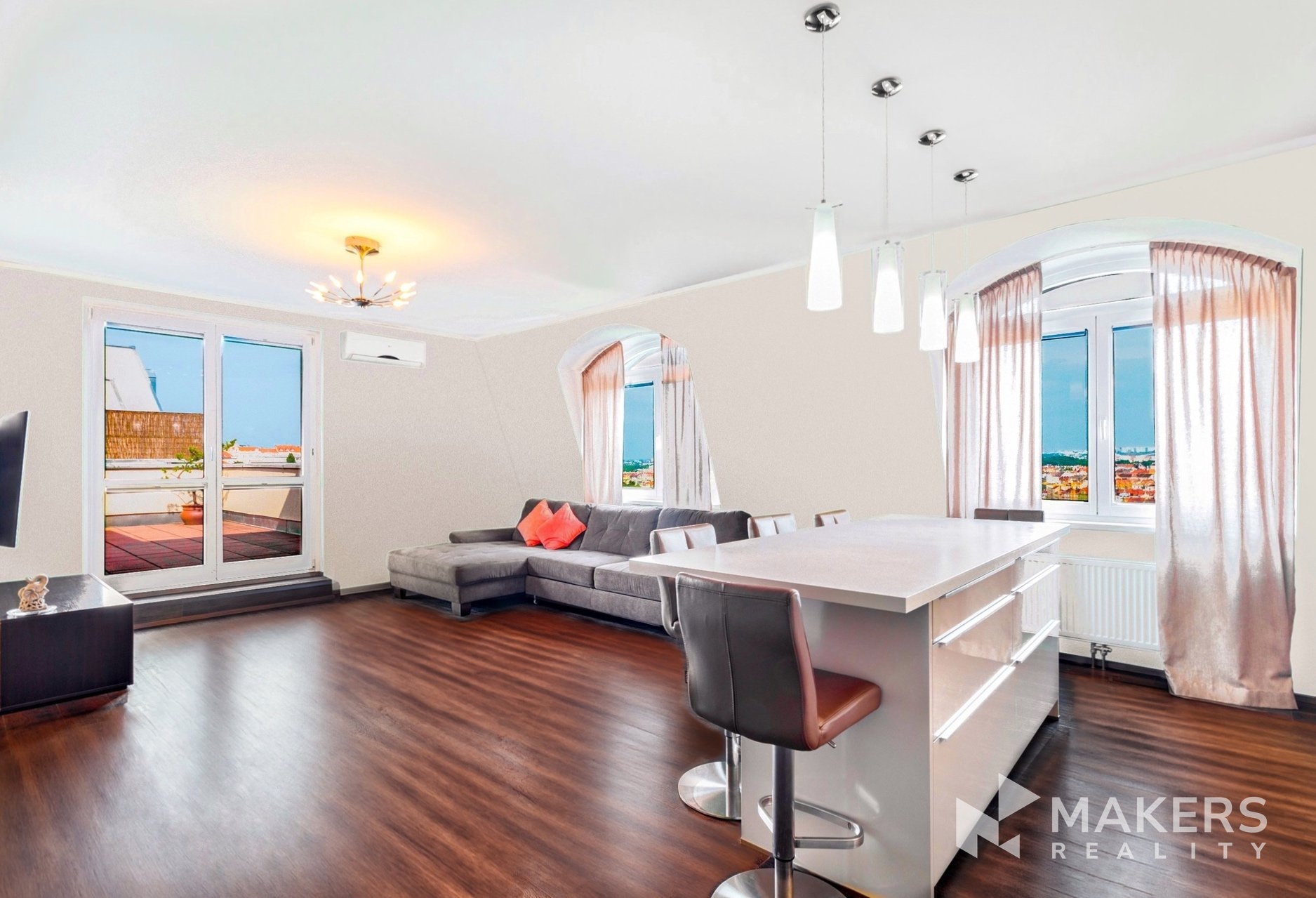 Exclusive living with a panoramic view – 4-bedroom apartment with large terrace and pool in the heart of Vinohrady