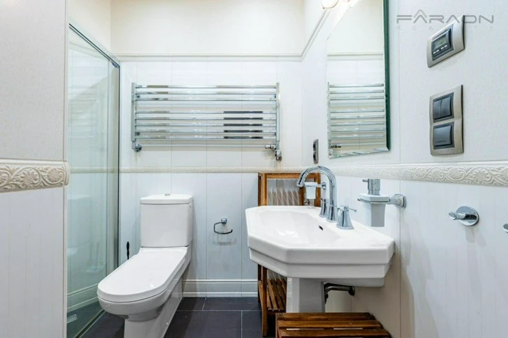 The apartment has 2 bathrooms with a shower and toilet, a spacious hallway, a balcony overlooking the courtyard and a utility room. Washing machine and dryer. Satellite TV connection, security entrance door, alarm, videophone.