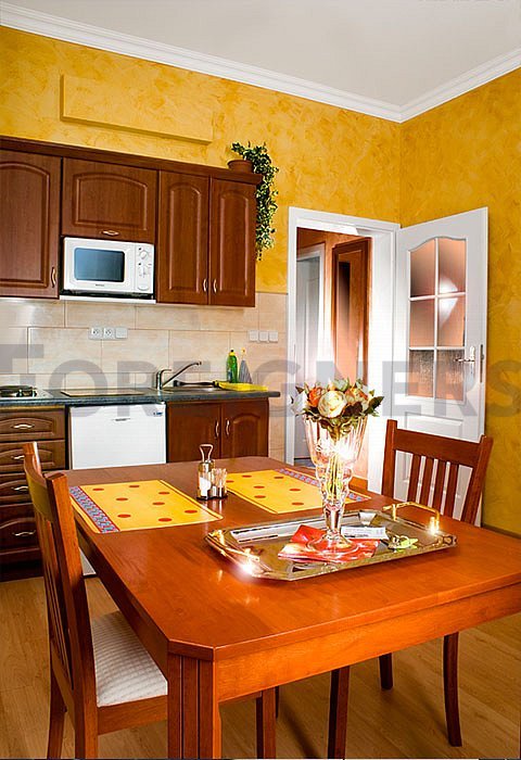 Kitchenette: double stove, microwave, refrigerator, kettle, sink, basic utensils (cutlery, pots, etc.)