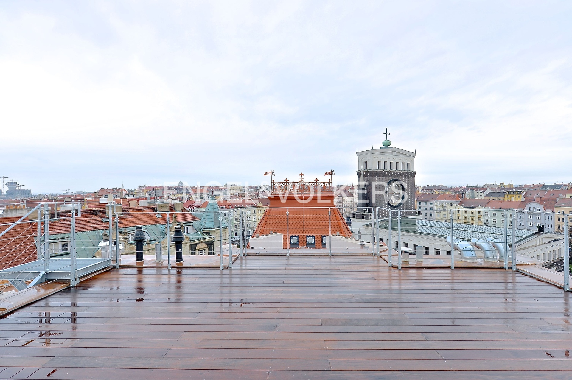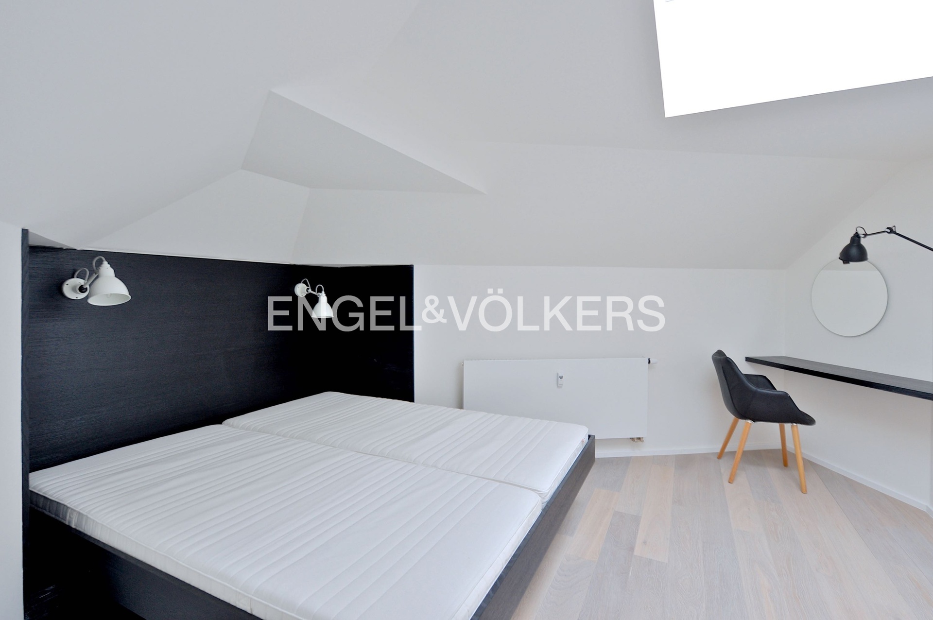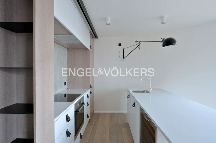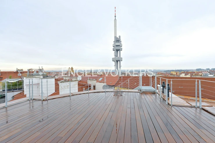 Historical apartment house after complete reconstruction in the most popular location in Prague, right on the street. Jiřího z Poděbrad. Representative common spaces of the house. The reconstruction took care of preserving all original decorative and architectural elements of the house. High-quality tiles and sanitary equipment were used for the reconstruction, massive floorboards are laid on the floors. The apartment is located on the top floor of an apartment building and its dominant feature is 2 terraces with a total area of 100 m2, which enthrals you with inspirational views of Prague. The central room of the apartment is a spacious and bright living room with a kitchenette and a dining area. The fully equipped kitchen includes quality appliances. The bedroom offers built-in storage. The apartment also has a bathroom with a shower, separate toilet, entrance hall with a lot of built-in storage, washing machine and dryer. The garage parking place can be provided in Žižkovská věž, the metro stop is only a few steps from the house.