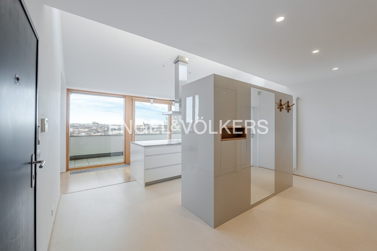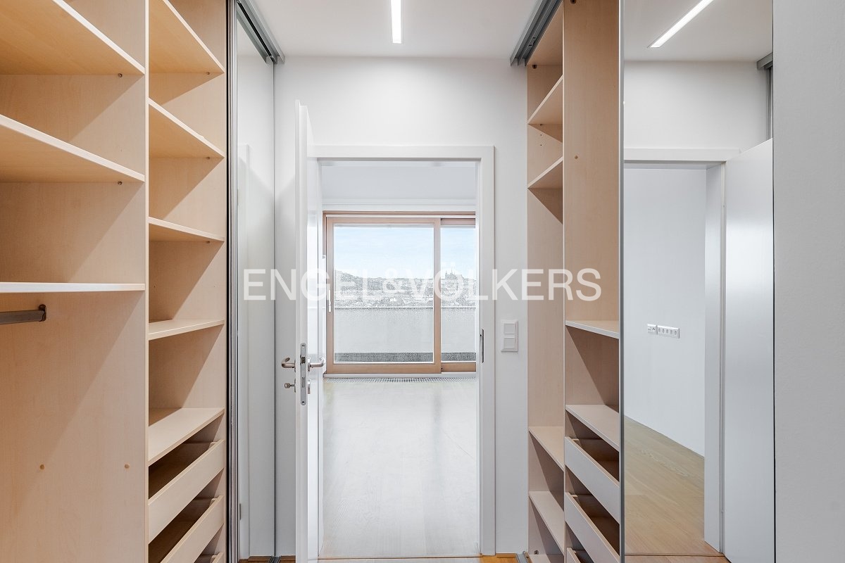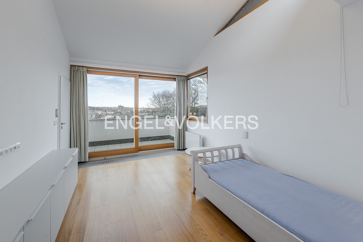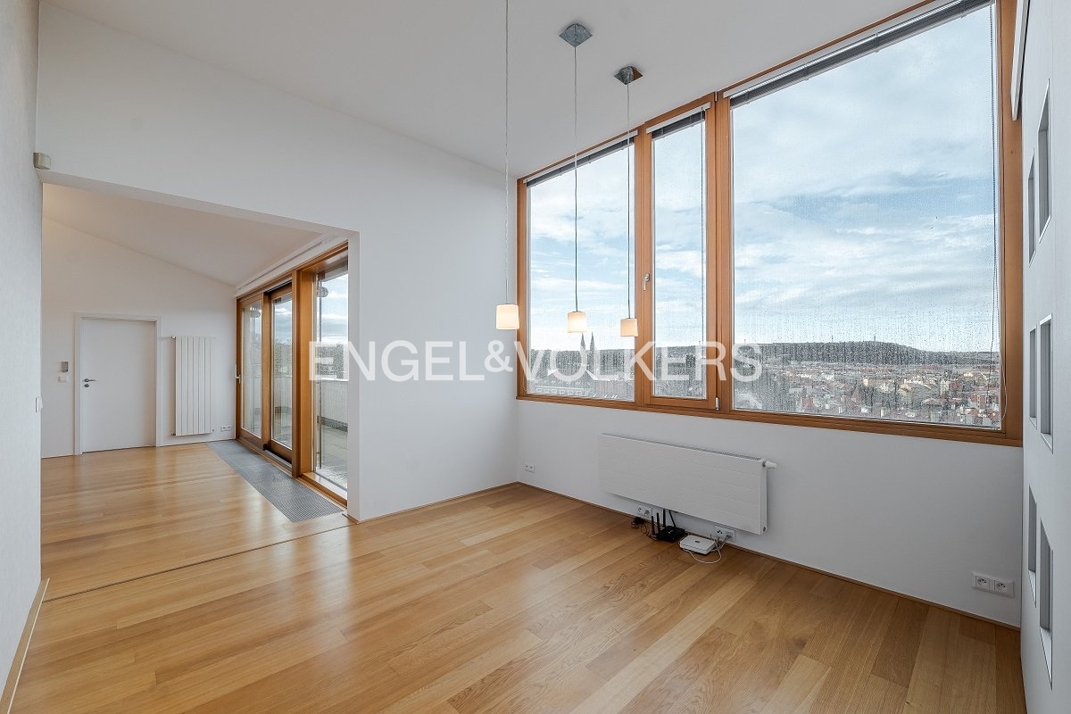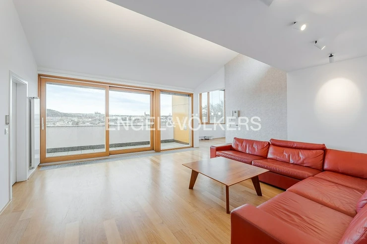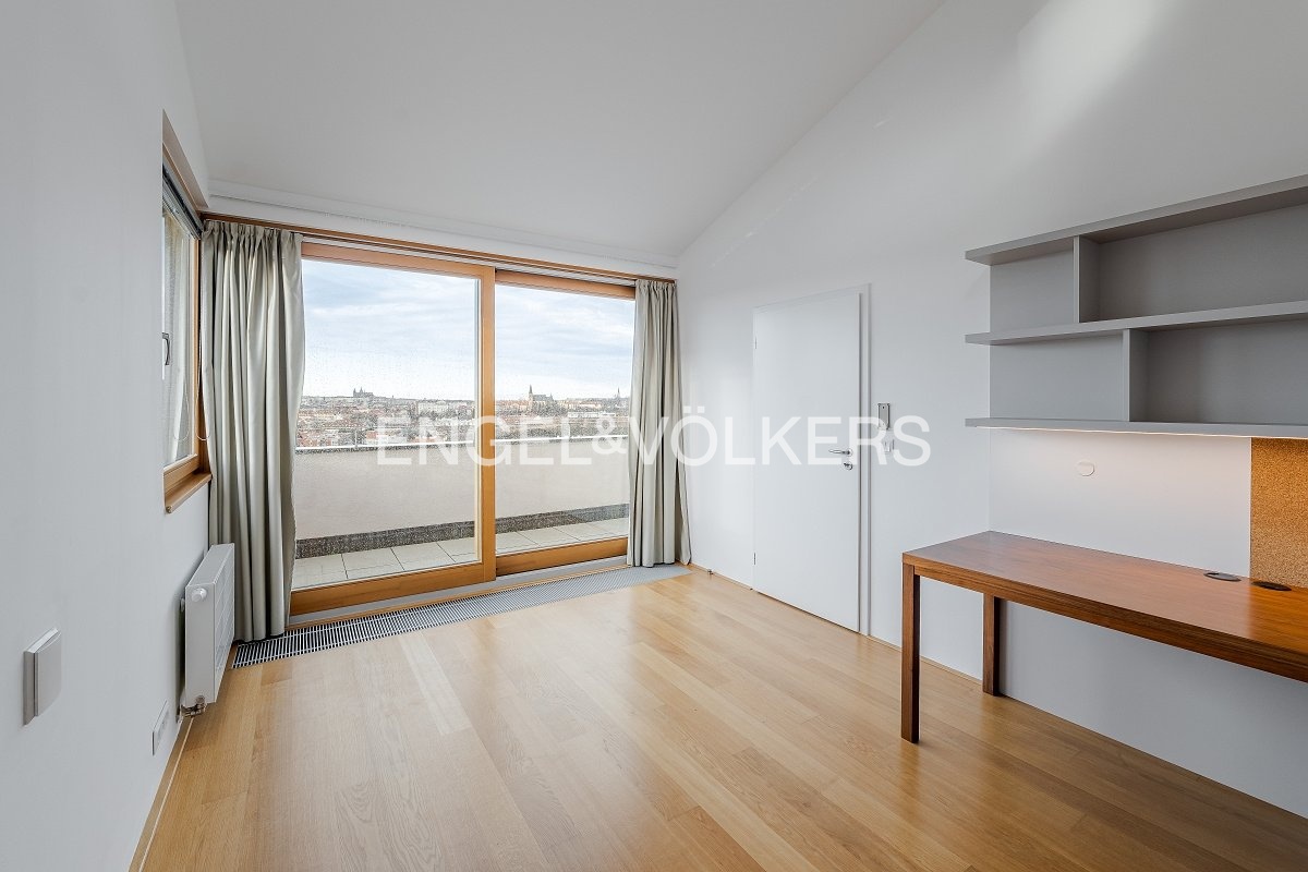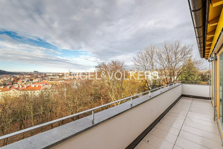 The 173 m² apartment has two terraces with a total area of 25 m² and offers breathtaking views of Prague. The layout includes a bright living room, fully equipped kitchen (Miele appliances), dining room, master bedroom with dressing room and en-suite bathroom, three more bedrooms, study, second bathroom, utility room and entrance hall with dressing room. Several rooms have access to terraces.
