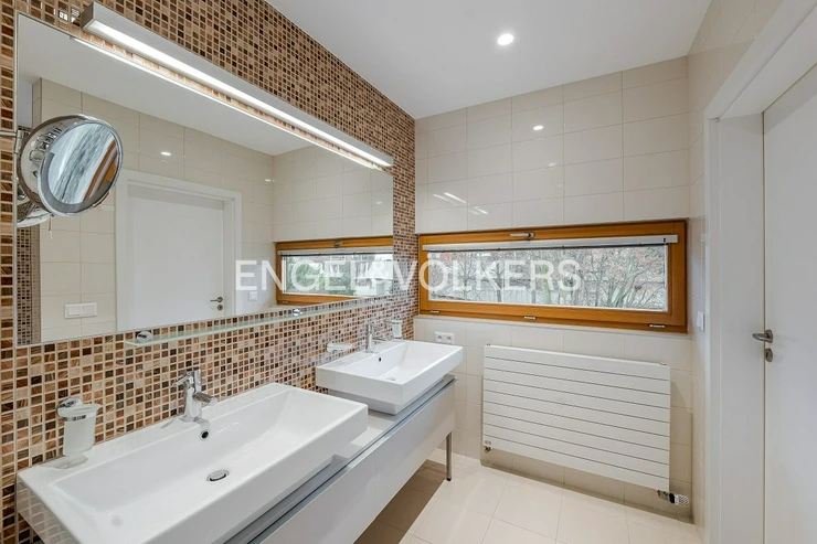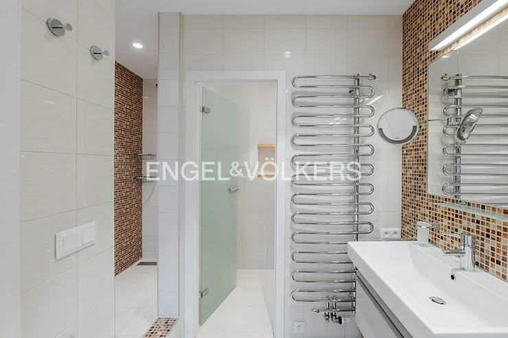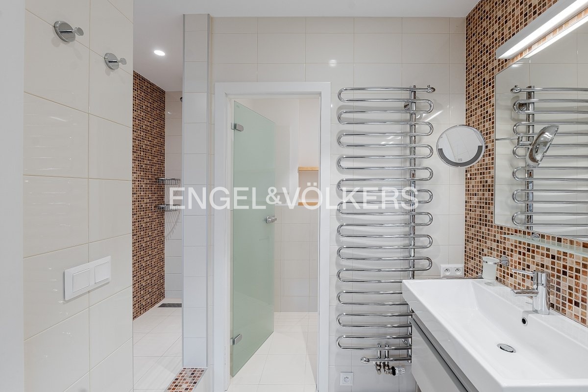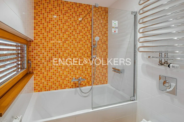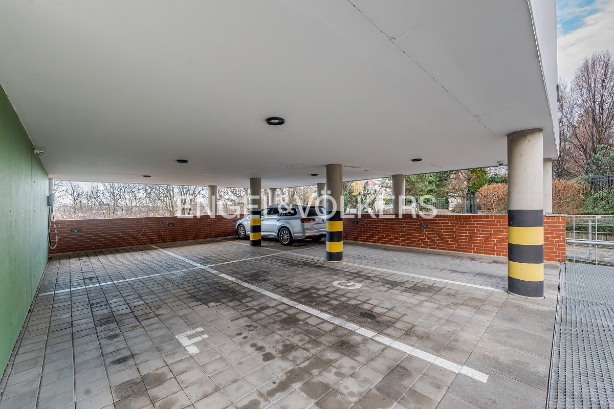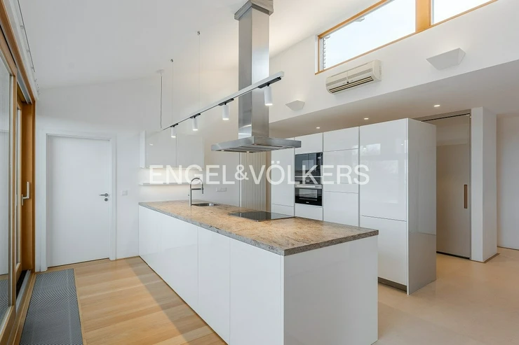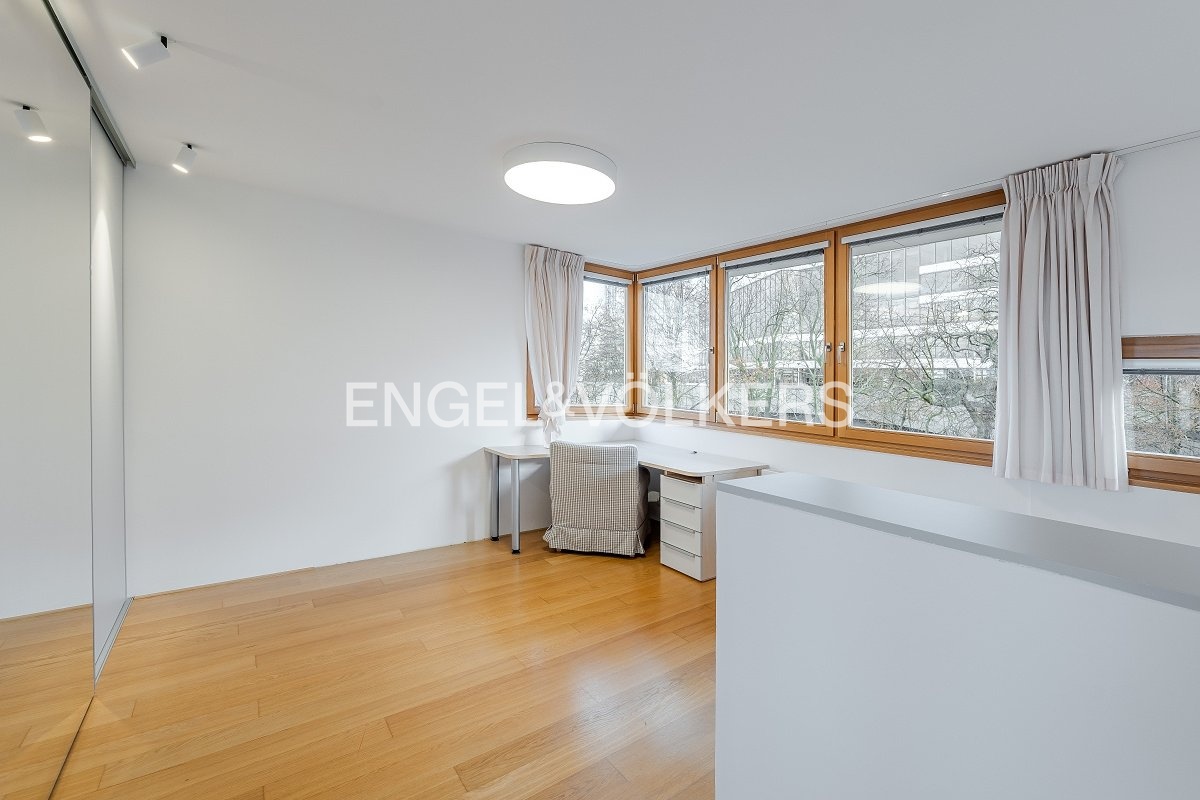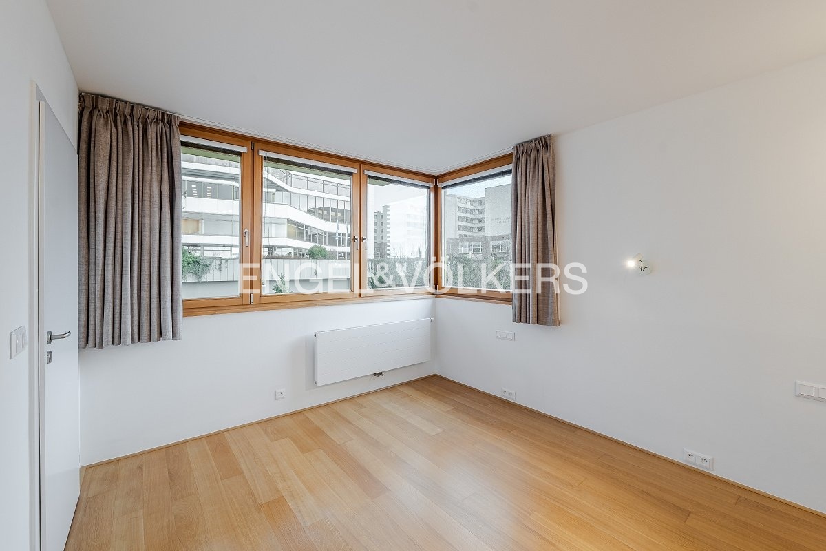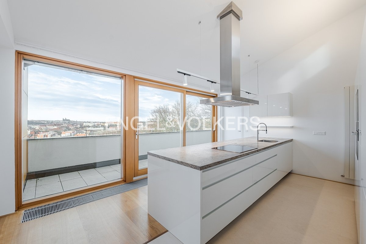 The 173 m² apartment has two terraces with a total area of 25 m² and offers breathtaking views of Prague. The layout includes a bright living room, fully equipped kitchen (Miele appliances), dining room, master bedroom with dressing room and en-suite bathroom, three more bedrooms, study, second bathroom, utility room and entrance hall with dressing room. Several rooms have access to terraces.