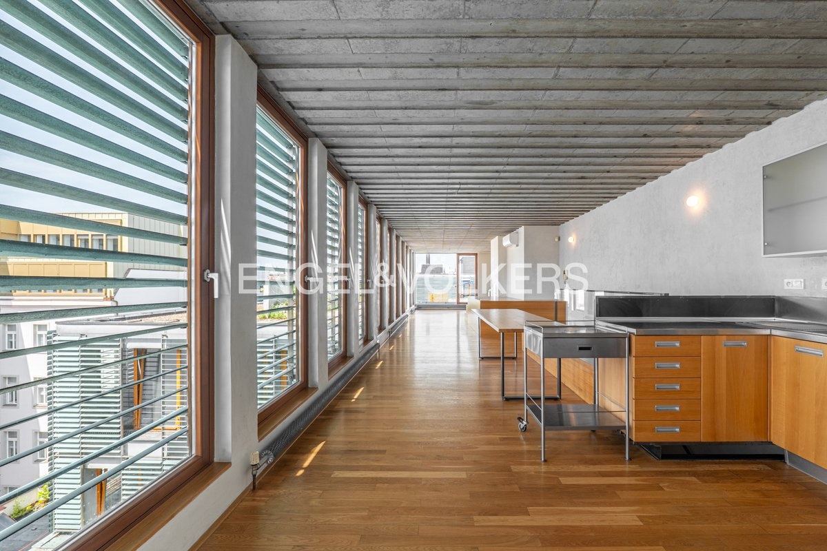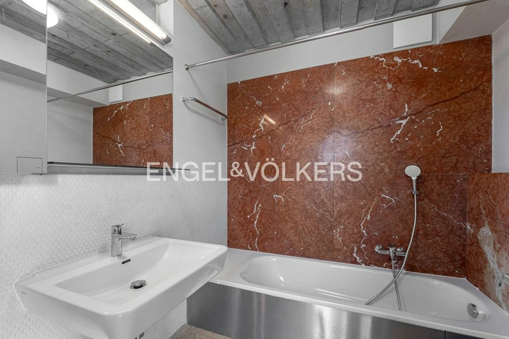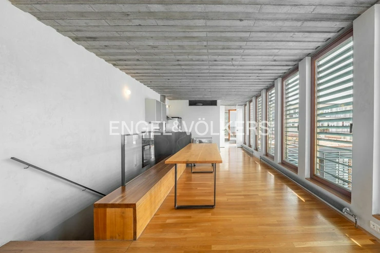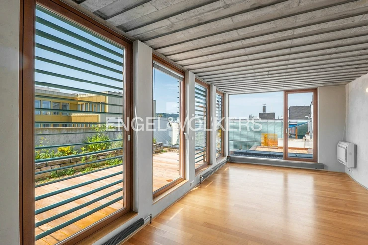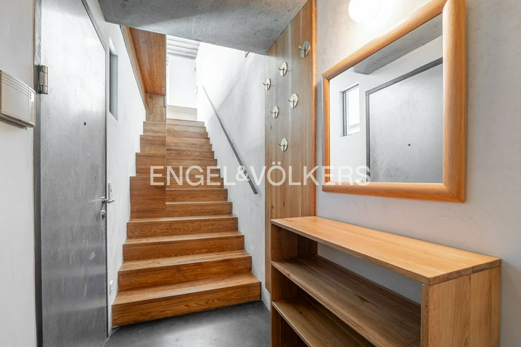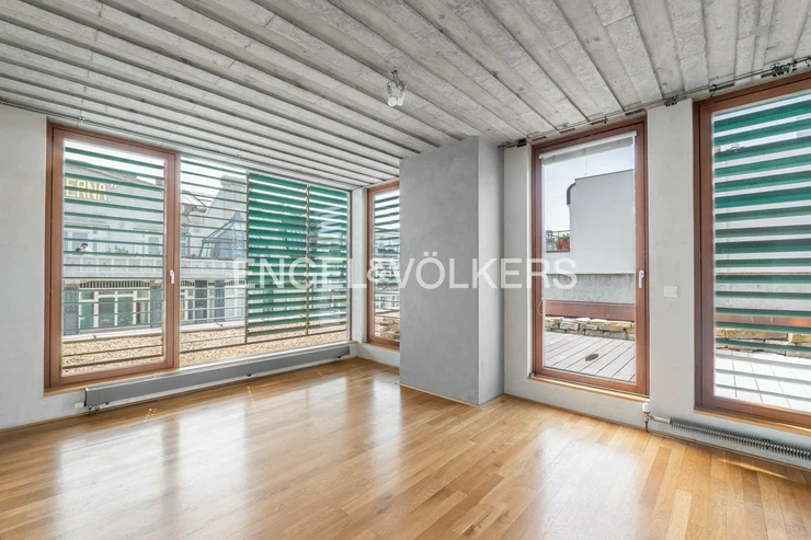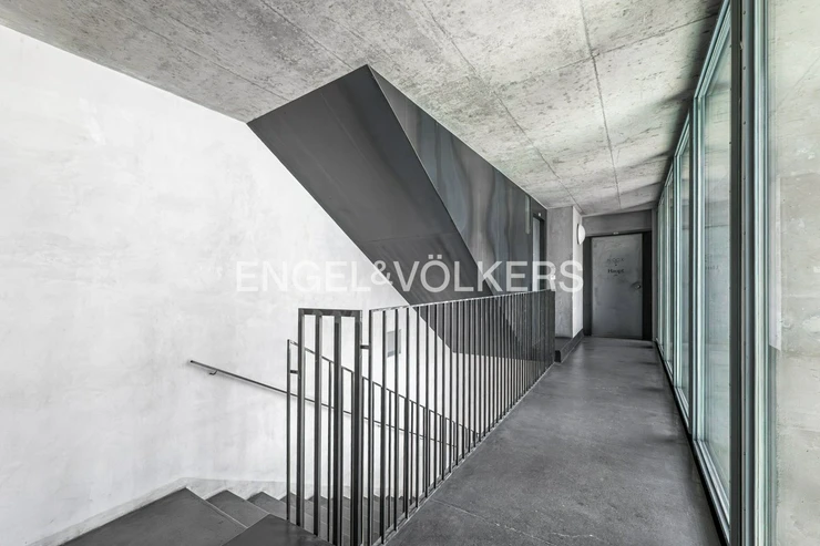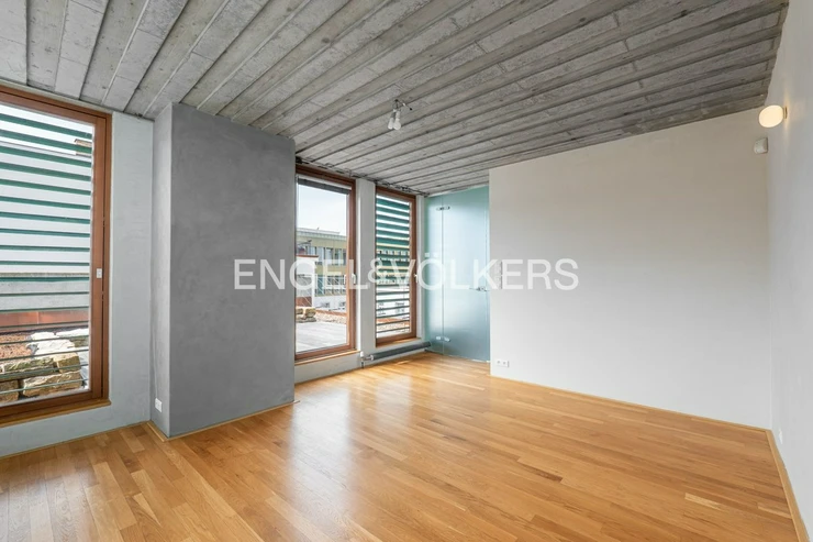 The apartment with a popular 2+kt layout on the top floor of the building offers an entrance hall, an airy living area with a fully equipped kitchenette, and a bright bedroom. The bathroom is designed in a combination of marble and Venetian stucco, equipped with a bathtub, sink, and toilet. A bonus is the outdoor space in the form of two terraces. Light enters the apartment through soundproof windows with copper blinds that characterise the entire project. The profiled exposed concrete contrasts beautifully with the solid oak flooring. The apartment, located on the fifth and sixth floor, is accessible by elevator, which is located at the reception desk that guards the building 24/7.