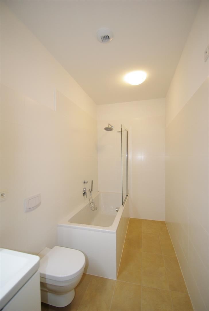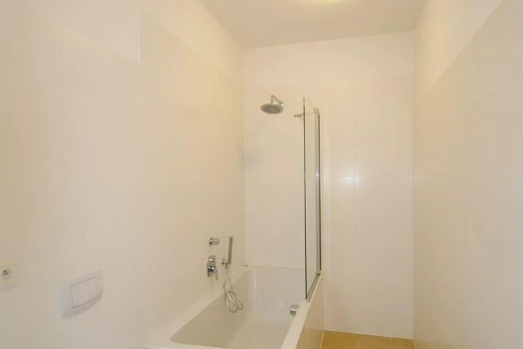The apartment interior is unfurnished and offers a layout consisting of an entrance hall, a spacious living room with an integrated kitchenette equipped with built-in appliances (fridge with freezer, electric cooktop, oven, dishwasher), a bedroom, a bathroom with a bathtub and a toilet. The apartment also includes a storage room. A cellar belongs to the apartment.