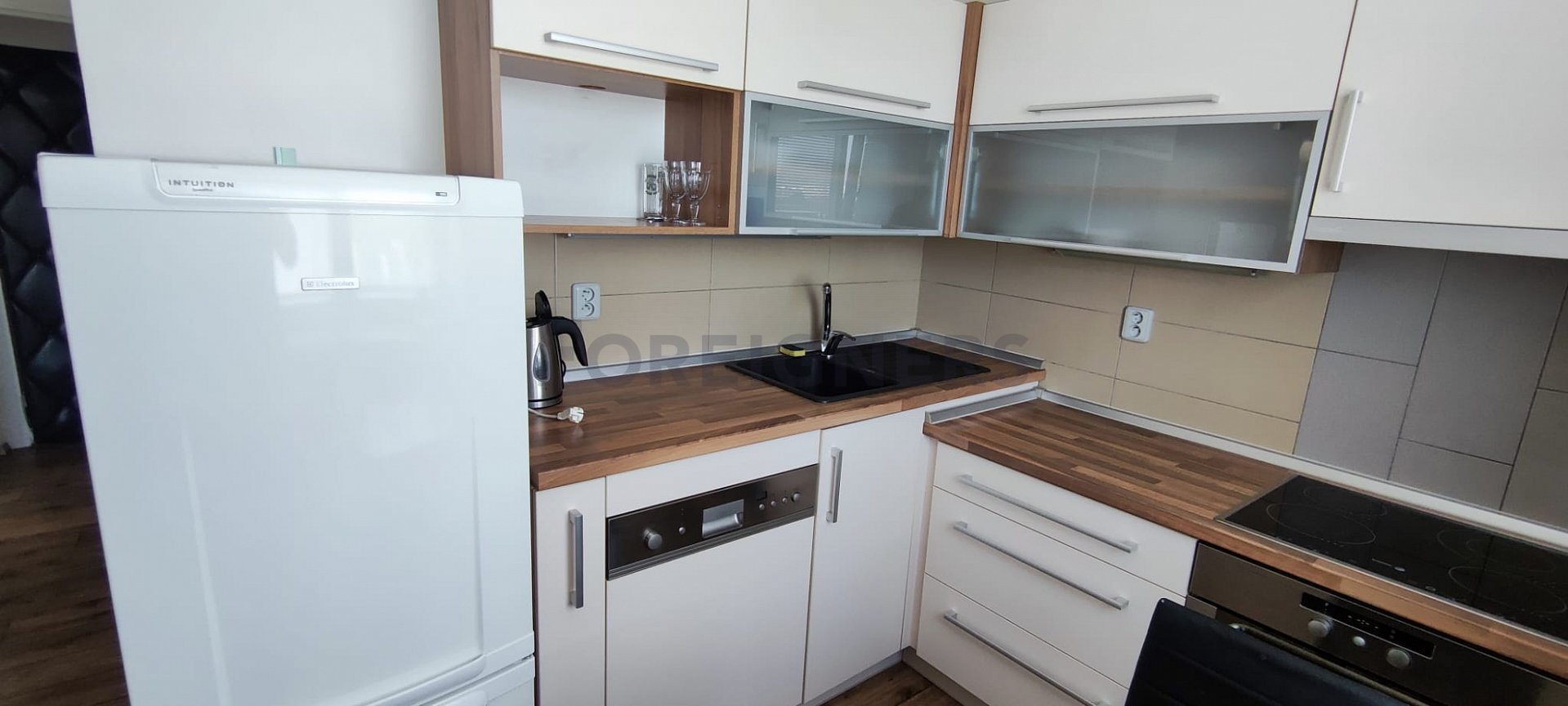 The apartment is partially furnished – the kitchen is equipped with appliances (induction hob, electric oven, extractor hood, dishwasher, refrigerator, dining table with two chairs, cabinet, and microwave). Other furnishings include a washing machine, a desk, a double bed, and built-in wardrobes in both the hallway and the bedroom.